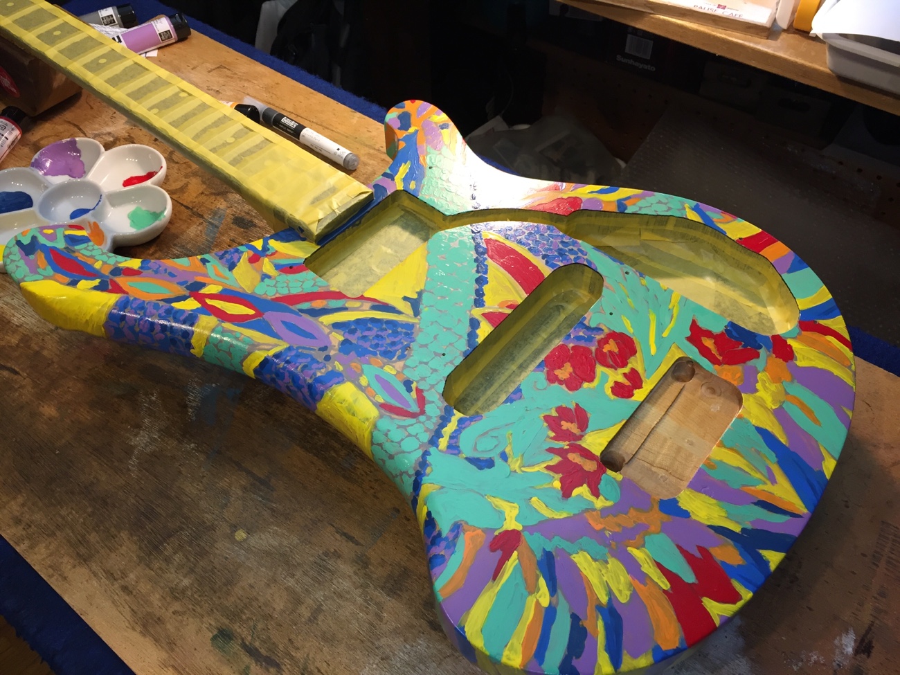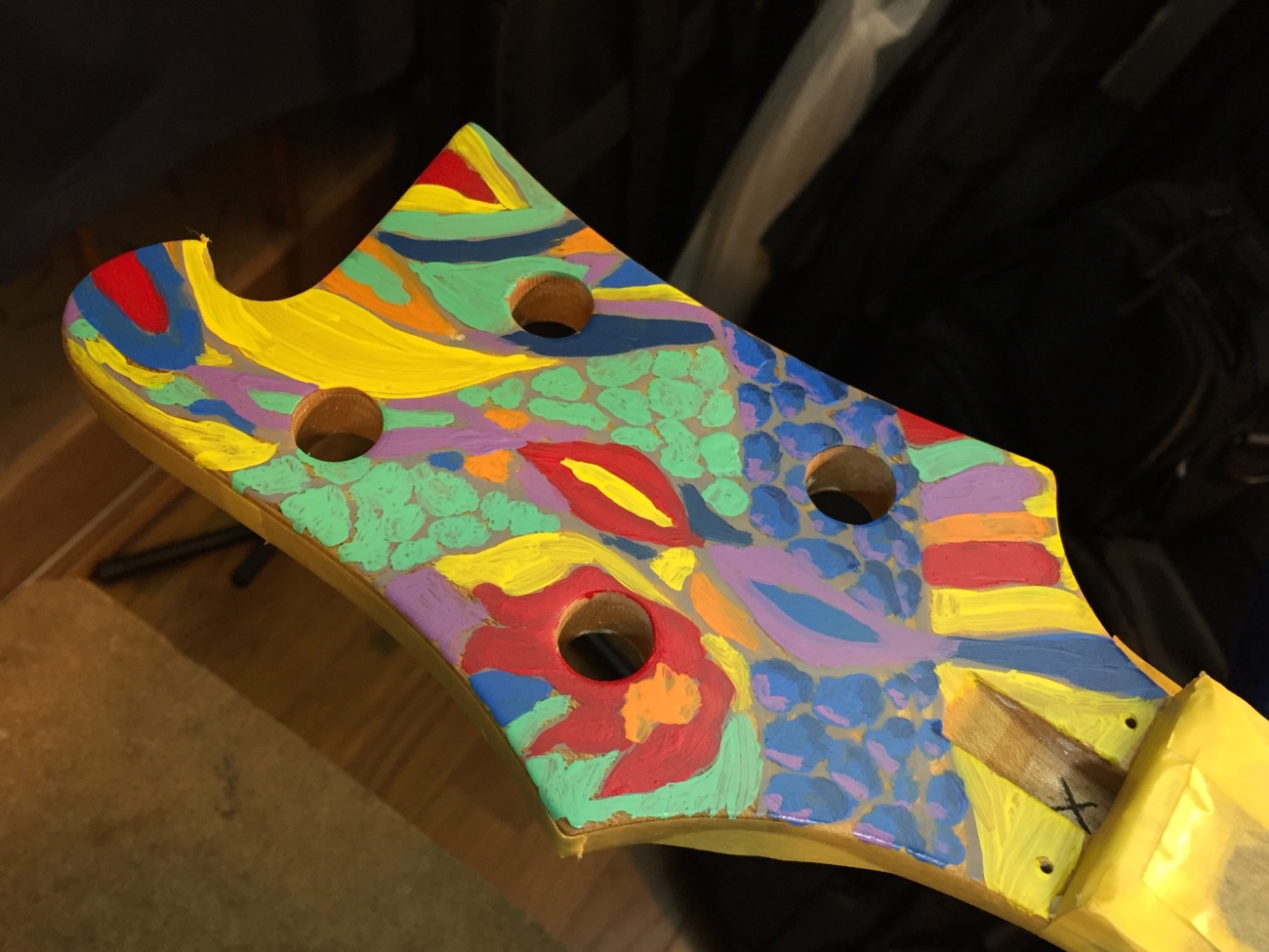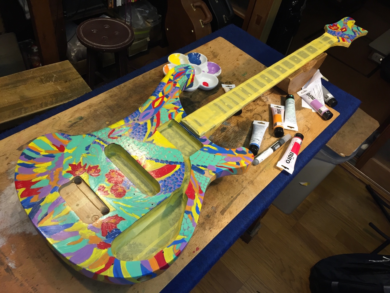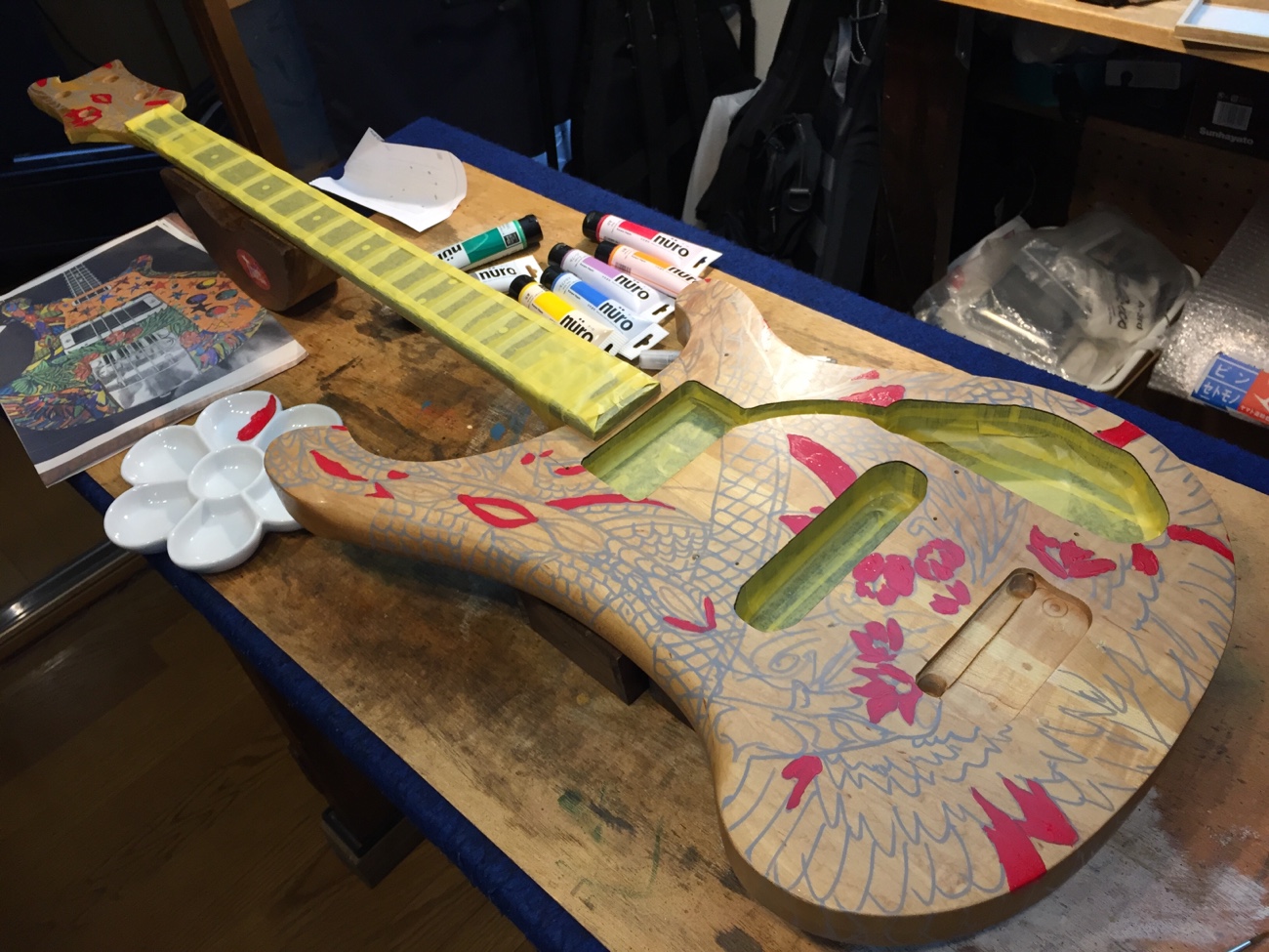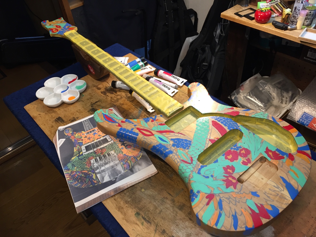 色を塗っていく【グレコのリッケンバッカー風ベースの改造-22】 投稿日時: 2025年9月23日 投稿者: admin 色を塗っていきます。 色を増やしていきます。 右脳を使う仕事は時間の感覚がなくなるような過集中なりがちで、休みなのについつい1日使って全部の色を乗せるところまで進めてしまいました。 黄色など隠蔽力のない色を重ね塗りして、ディテールを書き足したら、もう一度線入れして完成になると思います。 マッチングヘッドになっています。 Tweet