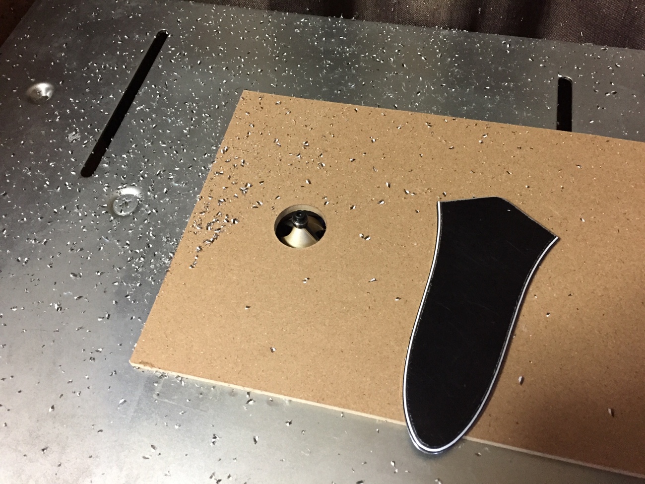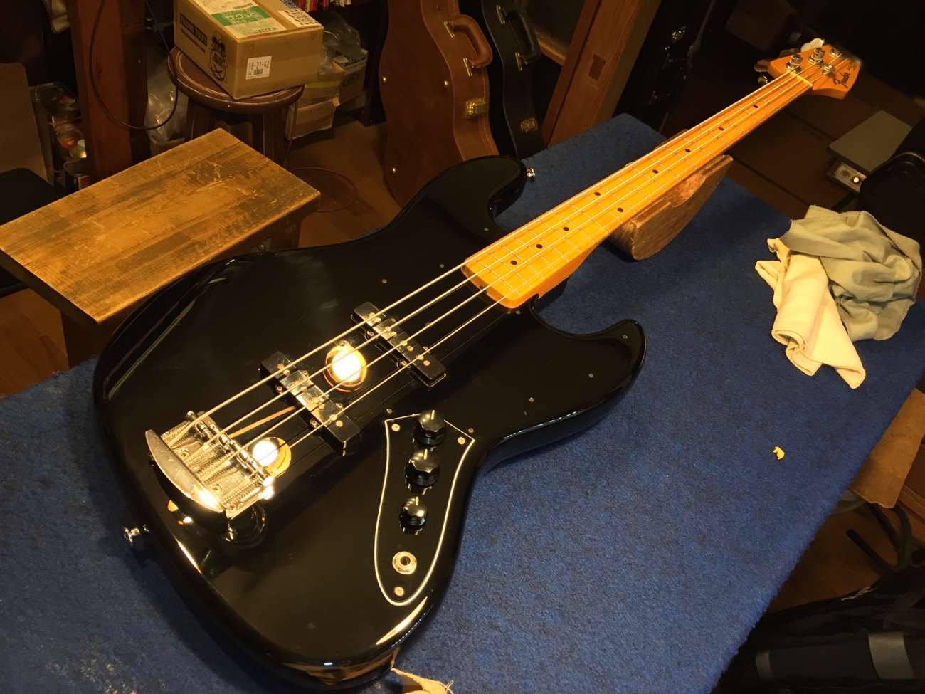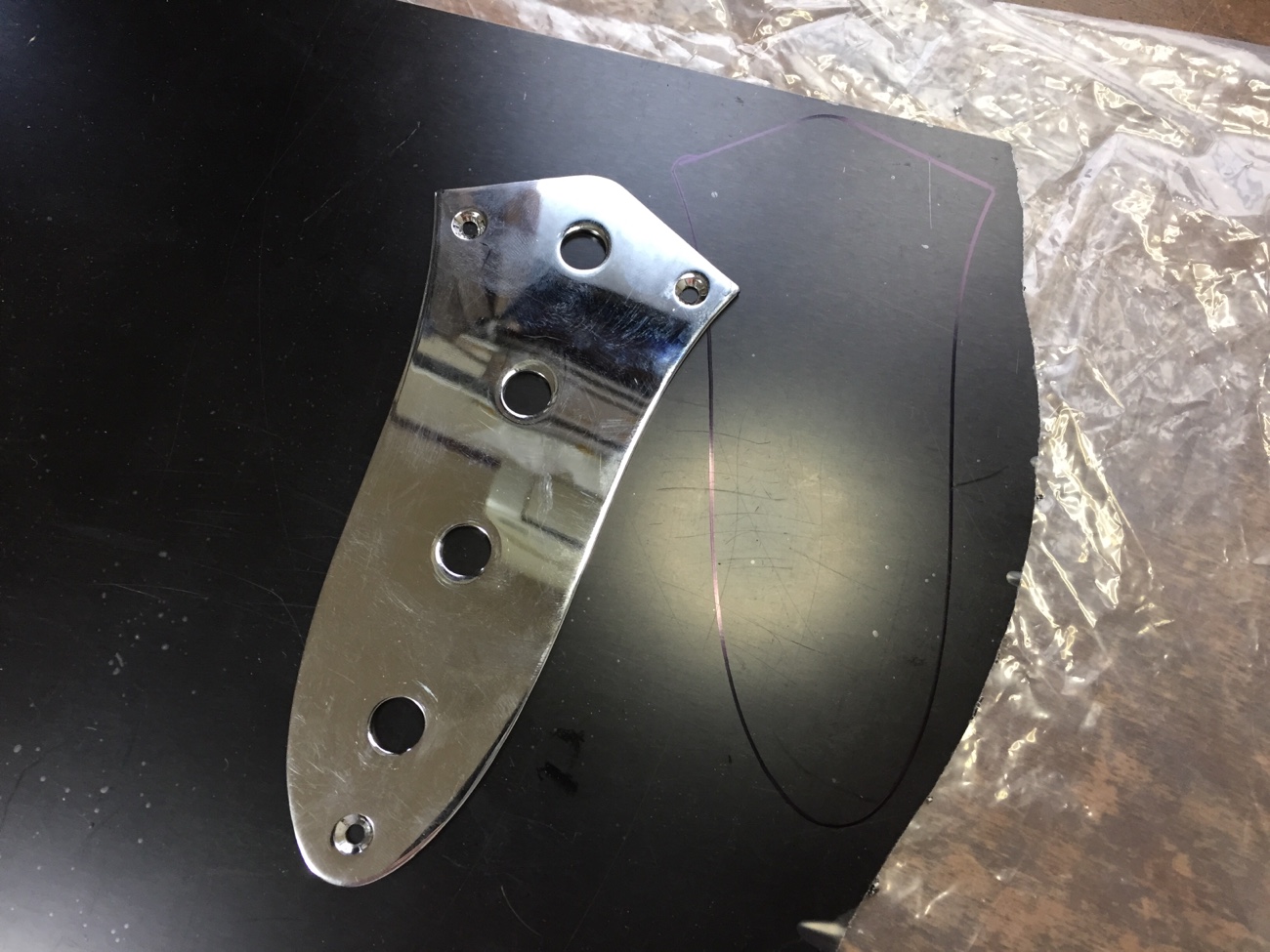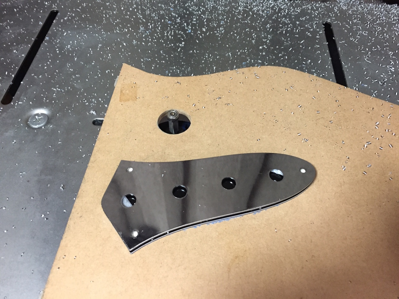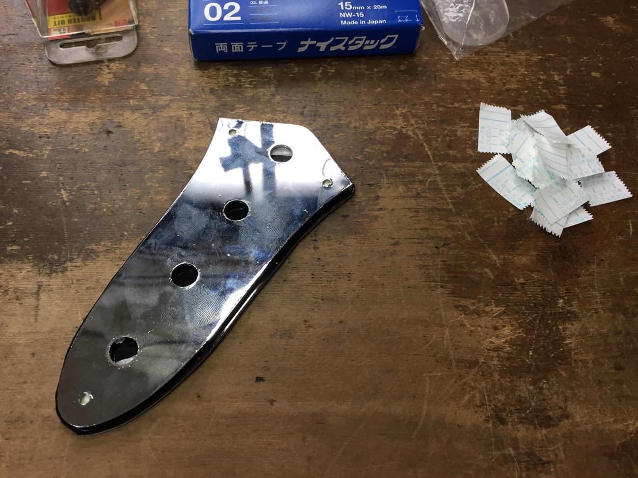 コントロールパネルを作る【フェンダージャパンブラックのジャズベースのコンパネ交換-3】 投稿日時: 2025年9月24日 投稿者: admin 黒3プライのピックガード材に形を取りました。 糸のこ盤でカットします。 テンプレートとして元のパネルを貼り付けます。 ベアリングビットで形を写しとります。 続いて面取りします。 ネジ穴とポットの穴をあけました。 トリマーの刃のあとを研磨して整えておきました。 外来ノイズの入り口になってしまうのでパネルの裏側にアルミシートを貼っておきます。 配線を戻していきましょう。 ピックガードのねじ穴を埋めたので黒く塗っておきます。 こんな感じになりました。 Tweet