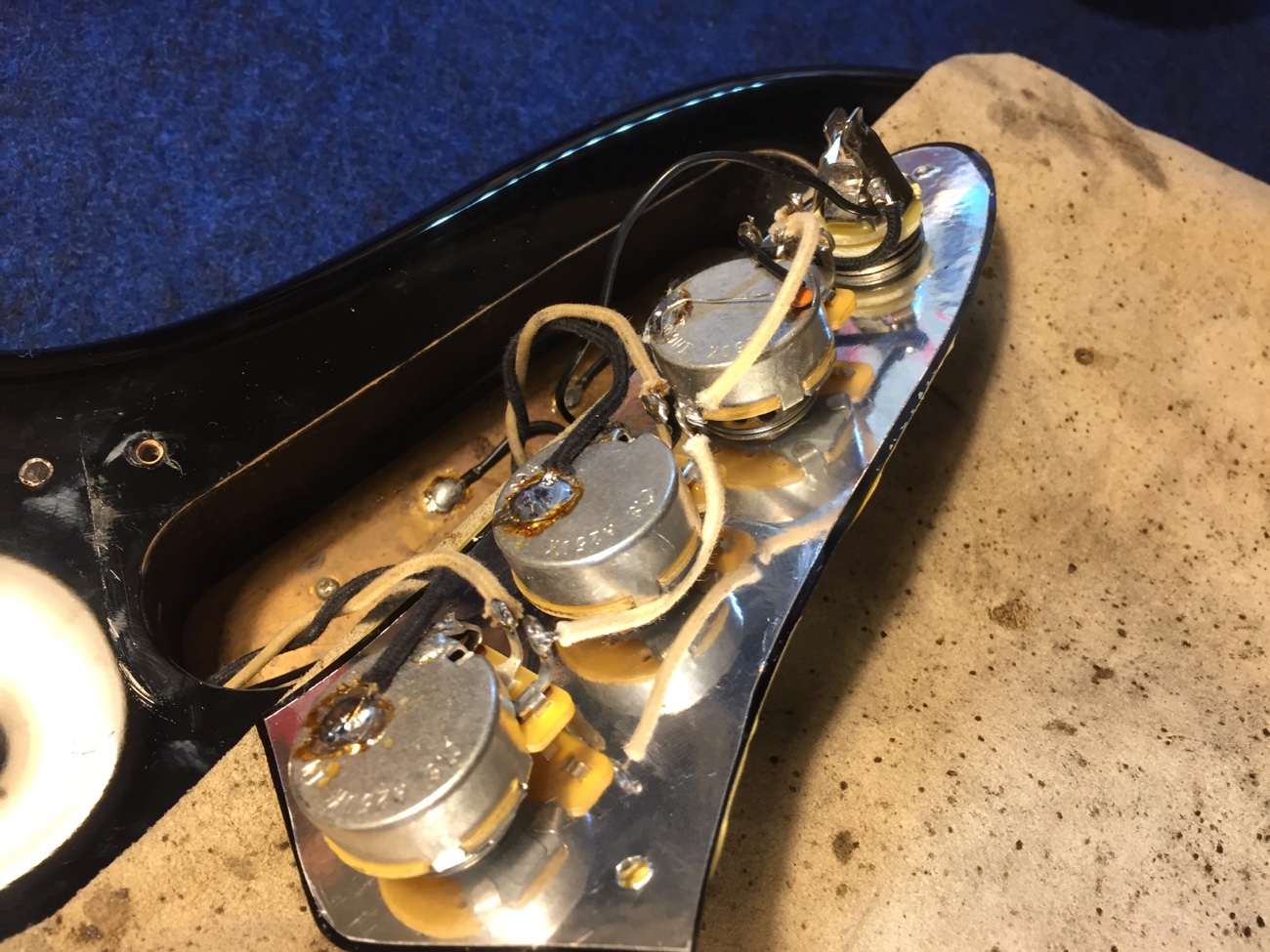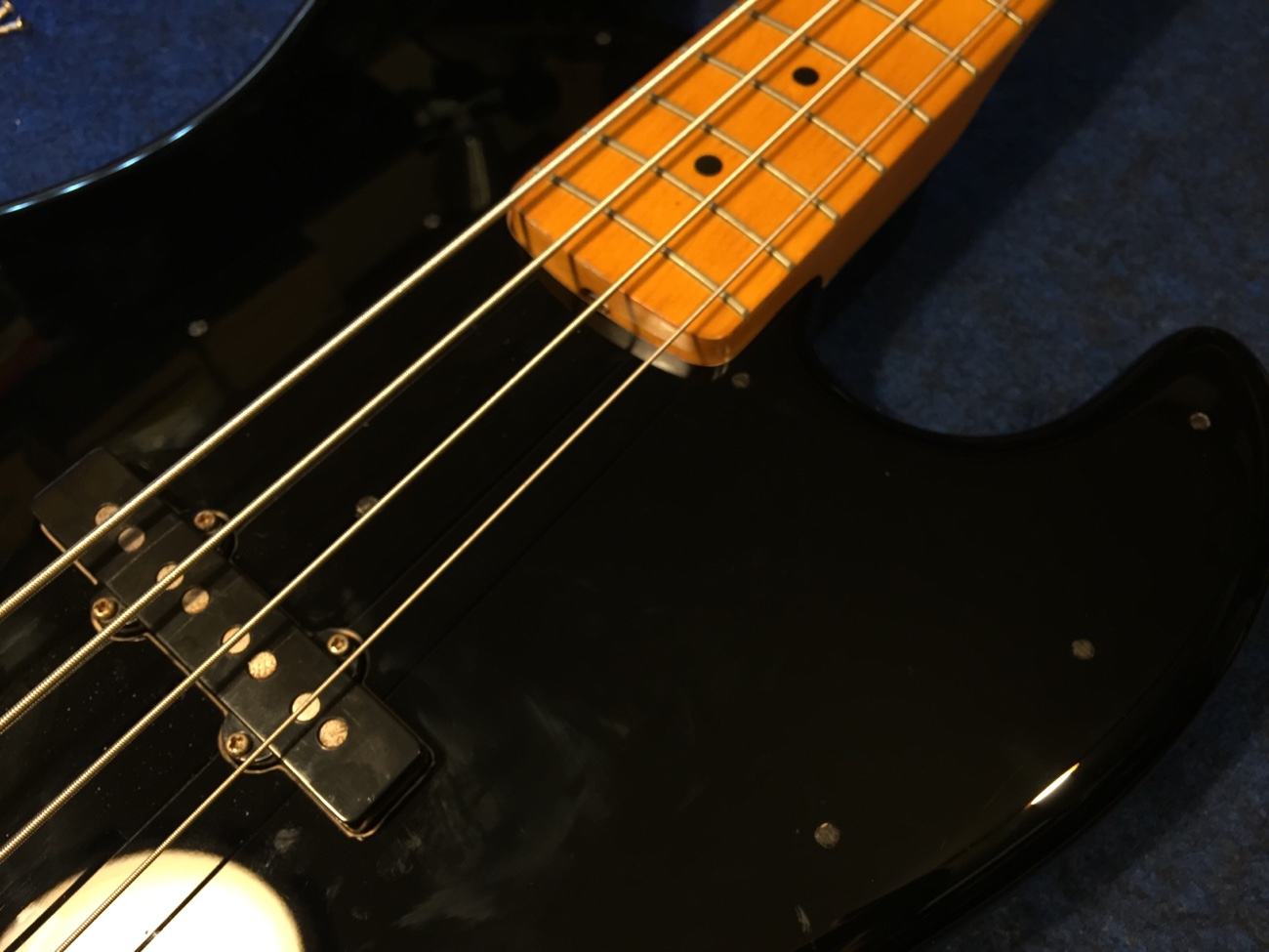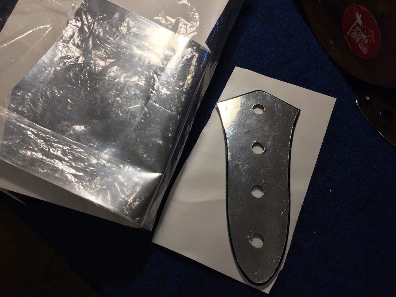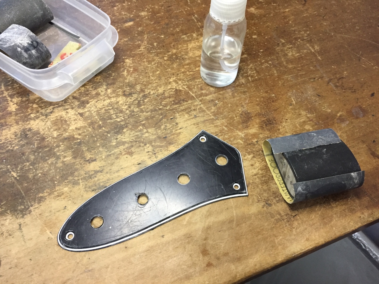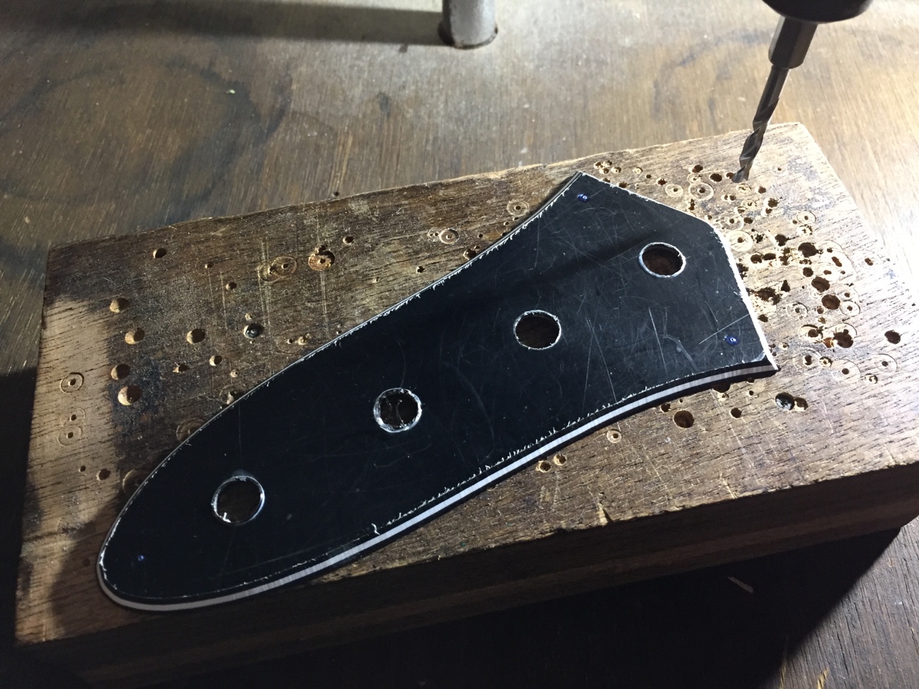 コントロールパネルを作る【フェンダージャパンブラックのジャズベースのコンパネ交換-3】 投稿日時: 2025年9月24日 投稿者: admin 黒3プライのピックガード材に形を取りました。 糸のこ盤でカットします。 テンプレートとして元のパネルを貼り付けます。 ベアリングビットで形を写しとります。 続いて面取りします。 ネジ穴とポットの穴をあけました。 トリマーの刃のあとを研磨して整えておきました。 外来ノイズの入り口になってしまうのでパネルの裏側にアルミシートを貼っておきます。 配線を戻していきましょう。 ピックガードのねじ穴を埋めたので黒く塗っておきます。 こんな感じになりました。 Tweet