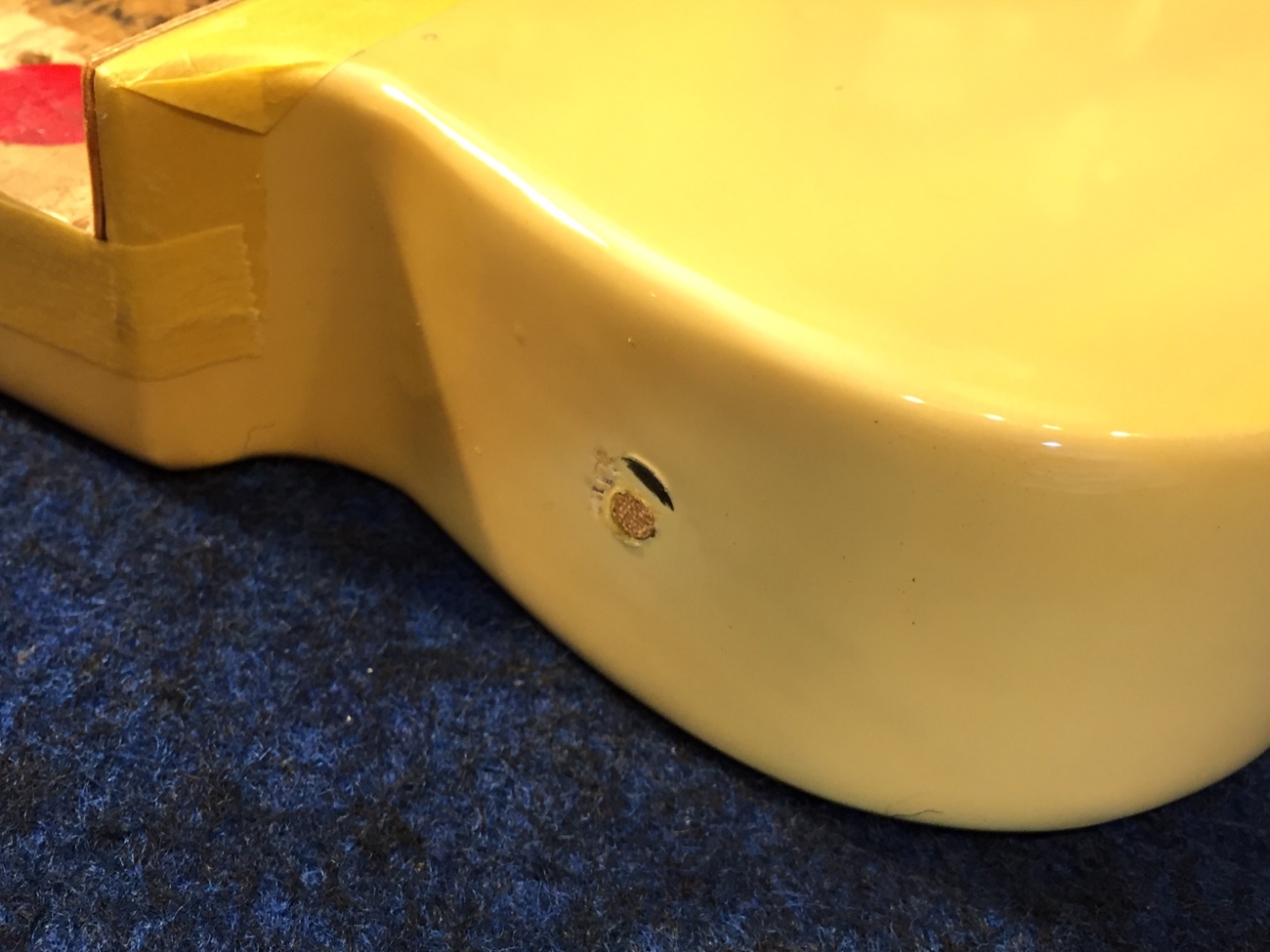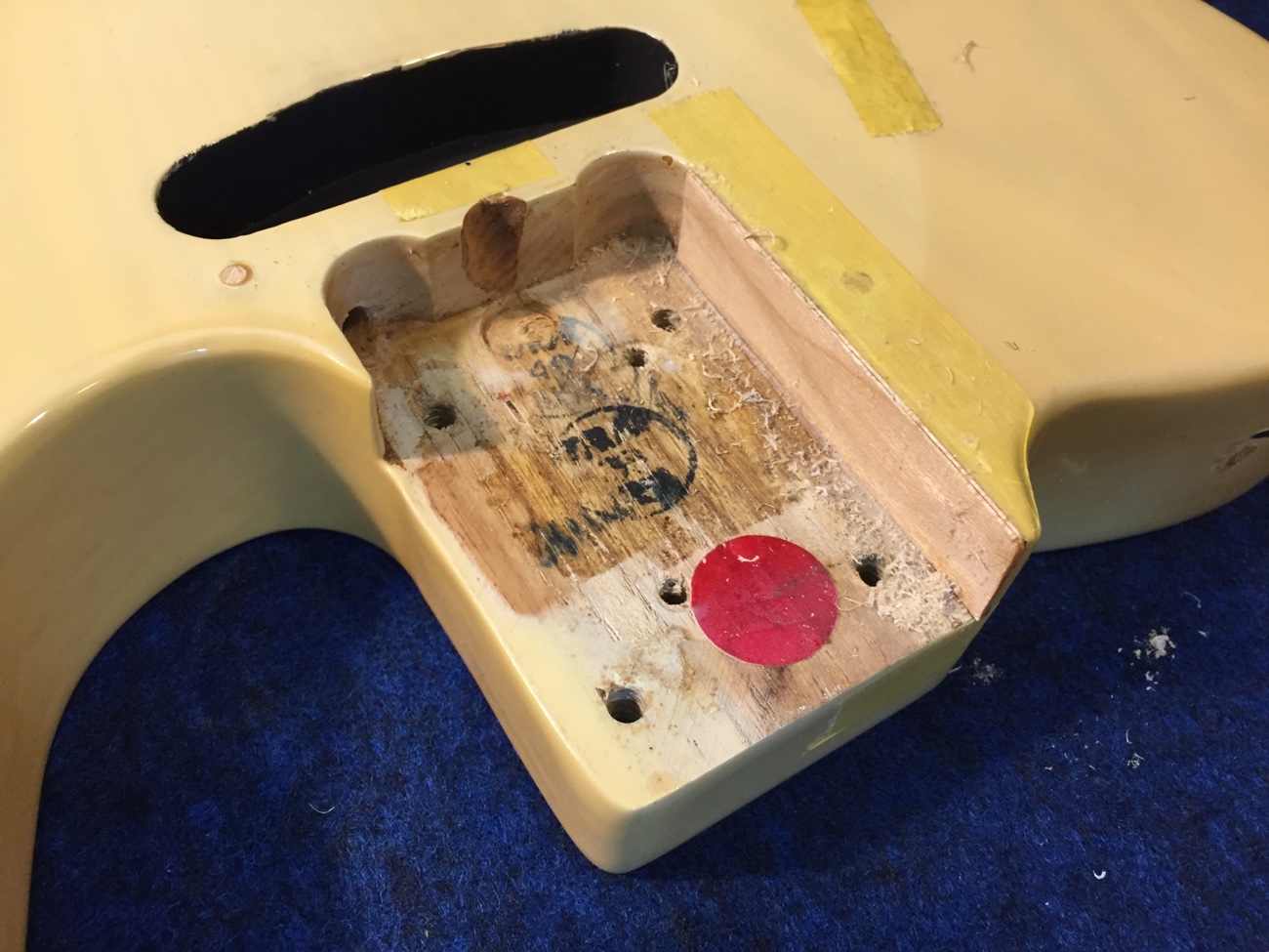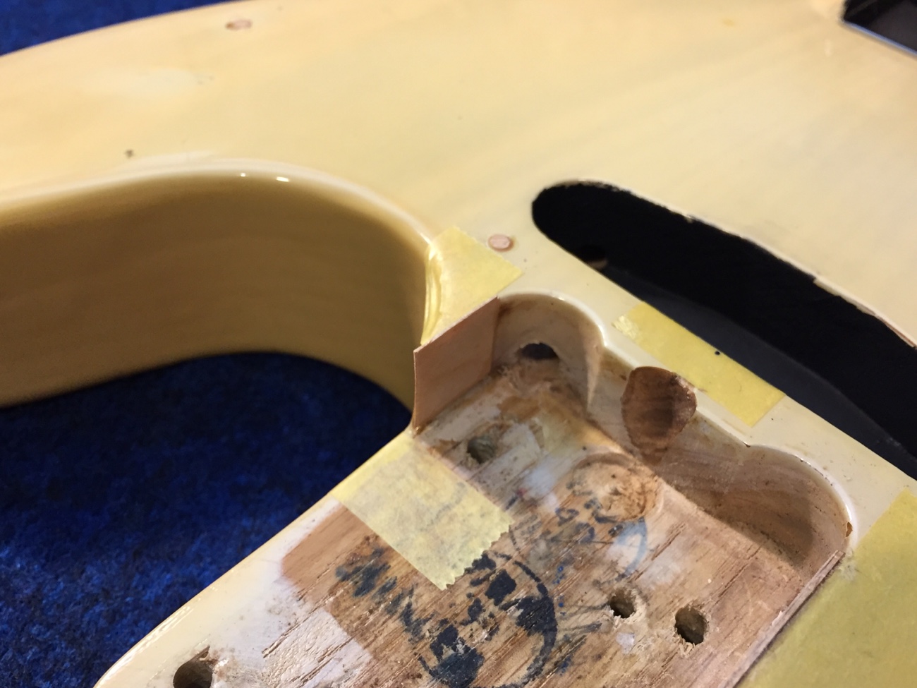 ポケットの加工の続き【78年製テレキャスターのチューンナップー30】 投稿日時: 2025年9月25日 投稿者: admin ネジ穴を埋めたところを整えました。 6弦側に貼った薄板を削ってネックのセンターを合わせていきます。取り付け位置と傾きを両方同時に動かしていくので難しかったです。 6弦側が決まったので1弦側にも薄板を貼ります。 こっちはネックがはまったらOKみたいな感じになると思います。 いろいろお預かりしている金属パーツのフィッティングを再チェックして問題なければ塗装に進みます。 Tweet