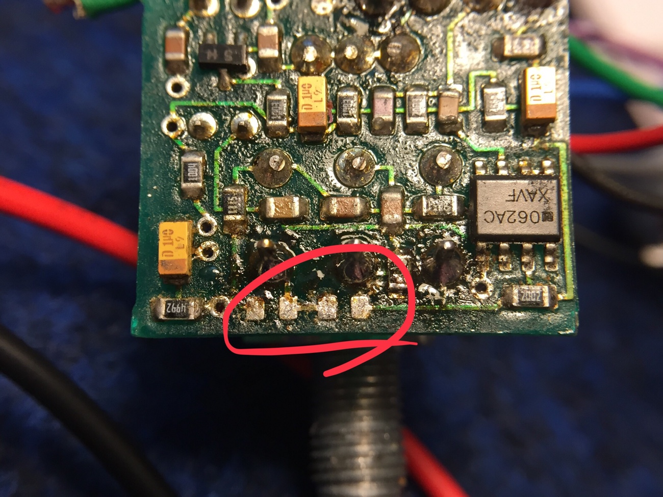 こちらが基板です↓ 6個ある大きいマルになっているハンダ付け箇所がポットがつながっているところで、下側3個が今回、オーナー様のお知り合いがポット交換でハンダ付けしたところです。