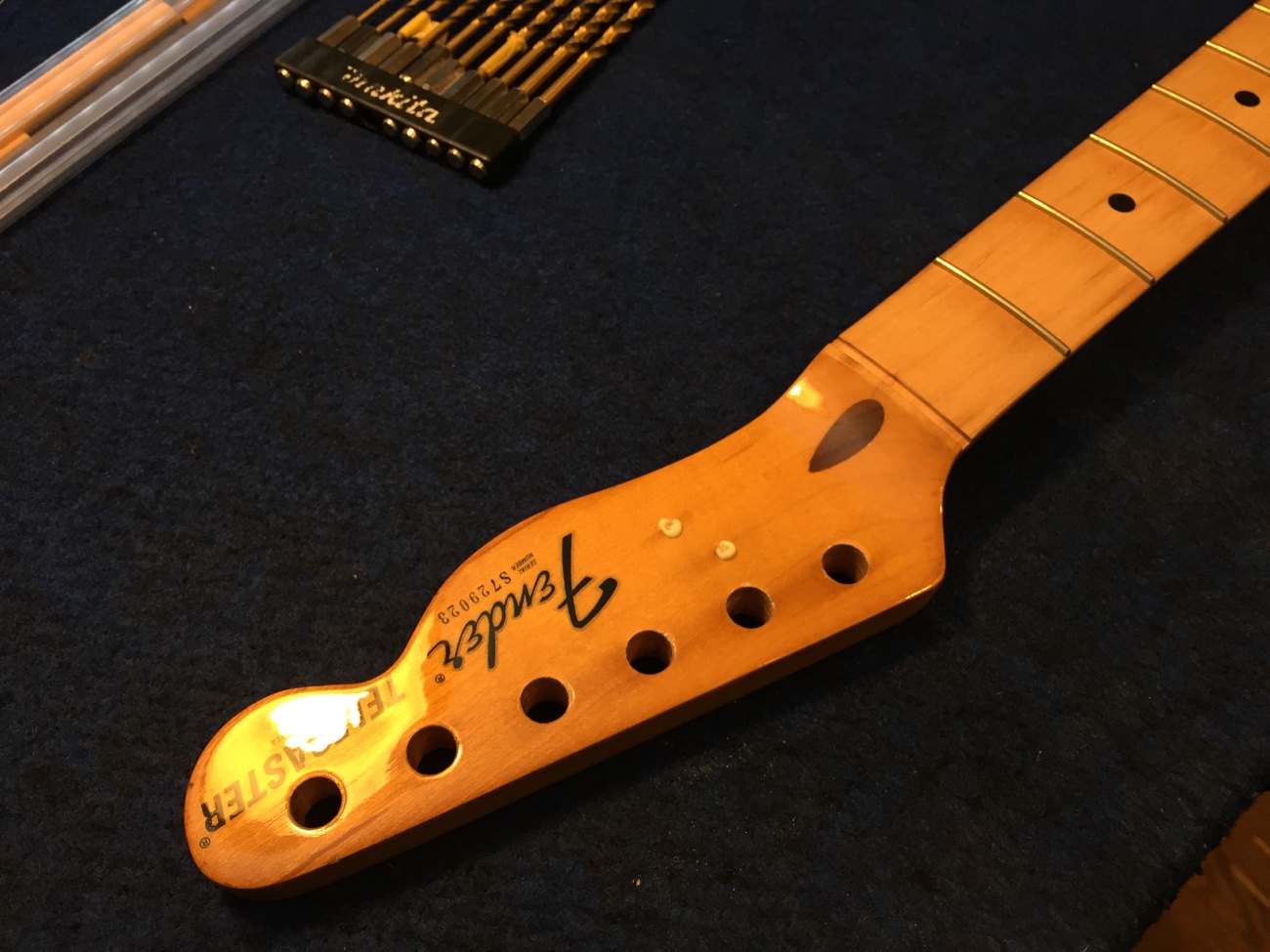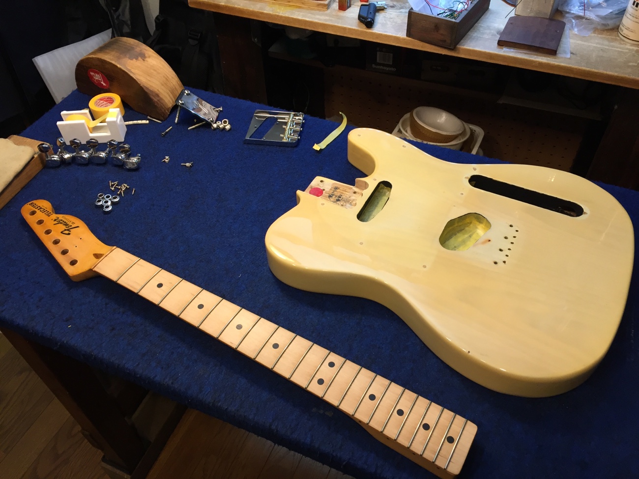 分解した【78年製テレキャスターのチューンナップー34】 投稿日時: 2025年10月23日 投稿者: admin 塗装屋さんに持っていくためにオーナー様が取りにくるそうなので、全ての部品を分解しておきます。 ヘッドロゴだけ残してヘッド面の塗装も剥がしたいとかいう計画があるみたいなので、リテーナーの穴も埋めておきます。 たぶん穴が少ない方が塗装屋さんも作業がしやすいと思われるので。 Tweet
