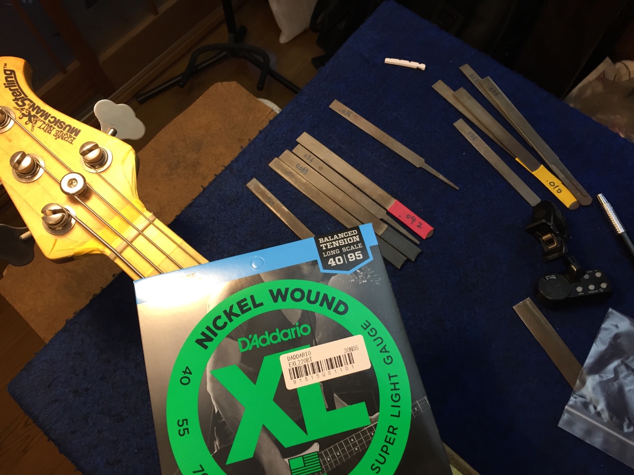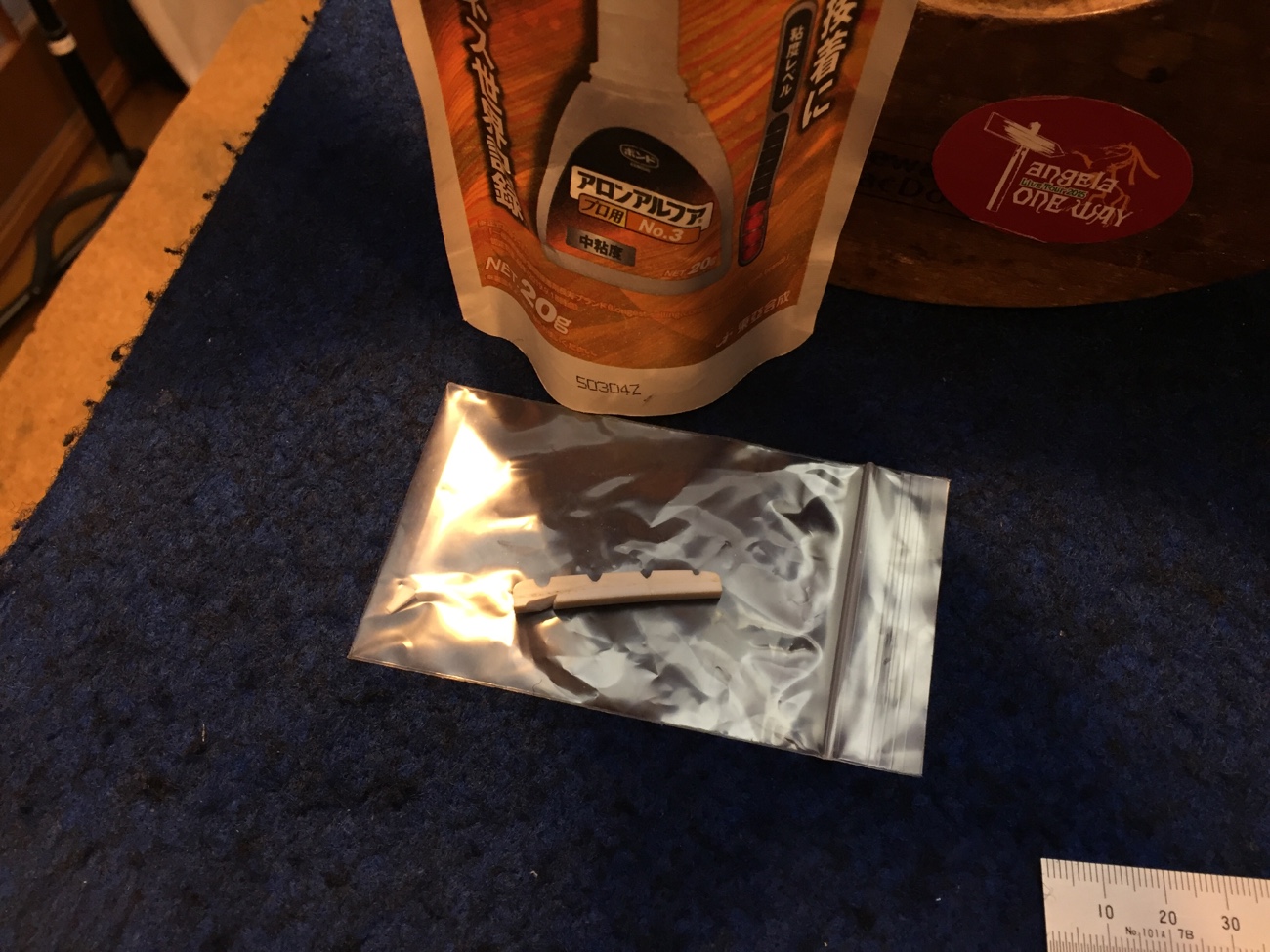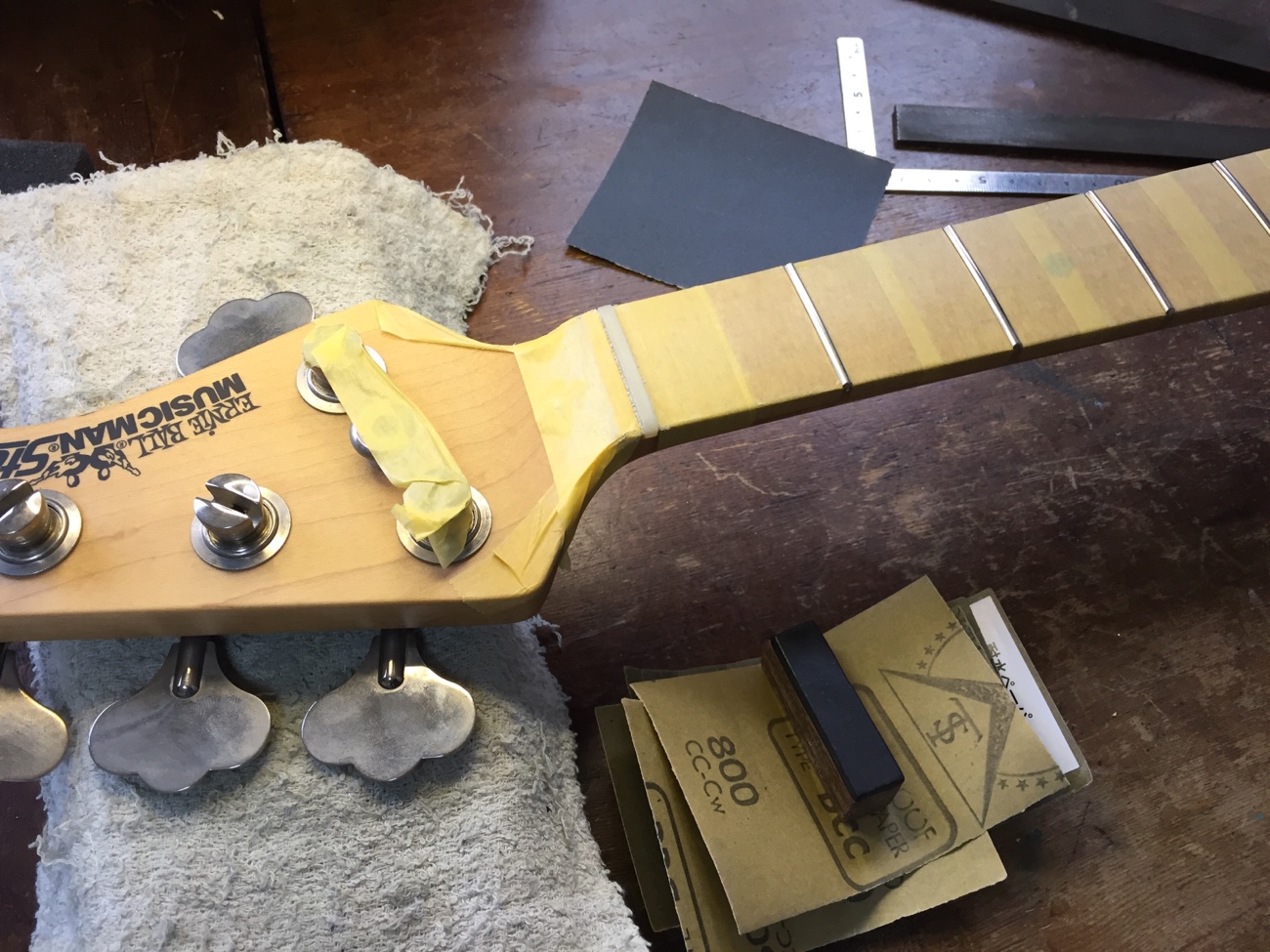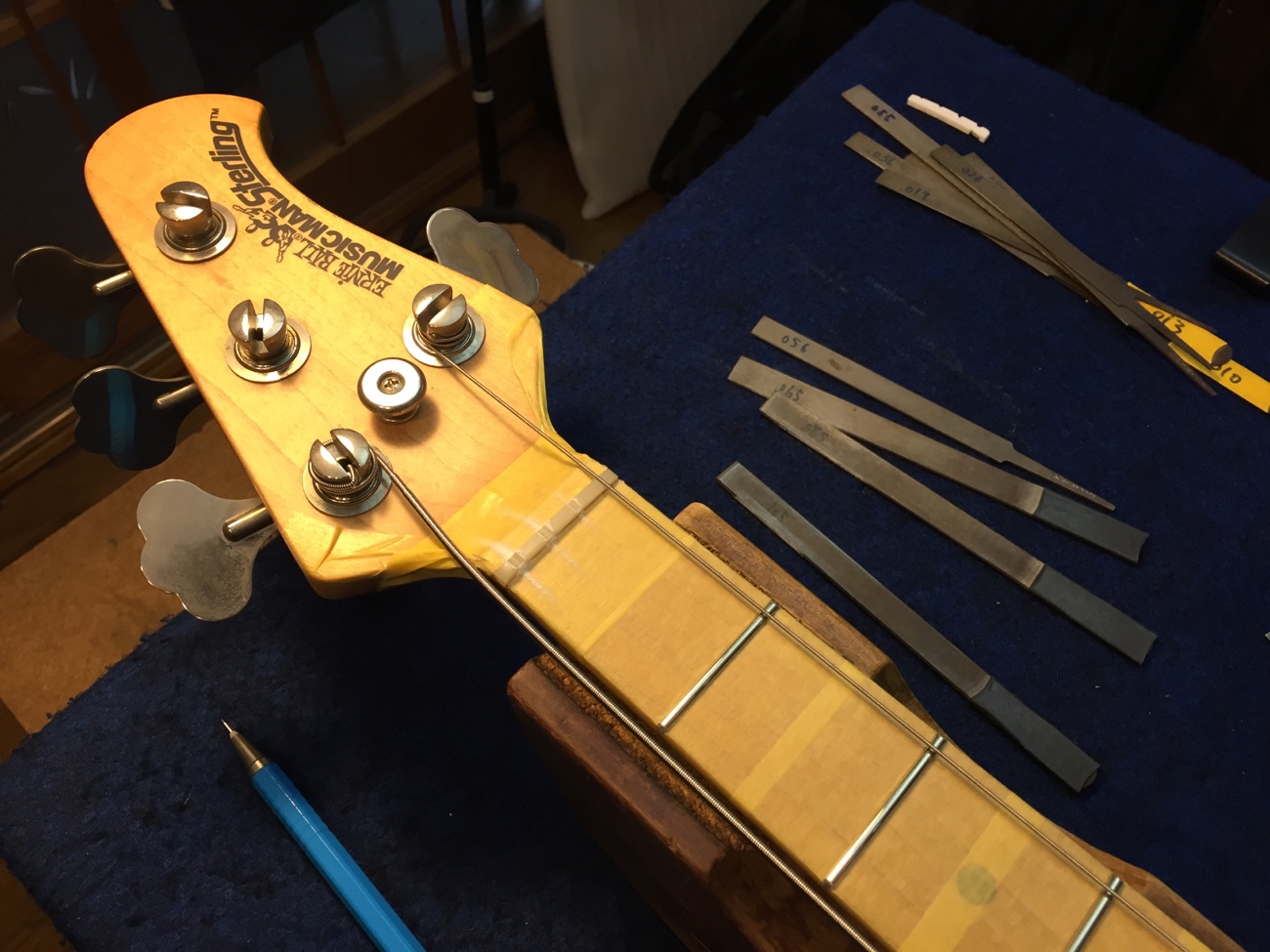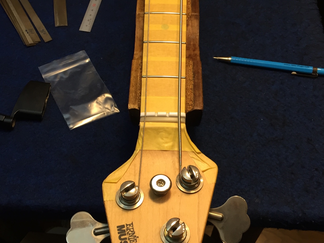 ナットに弦溝を作る【スターリン4Hのフレット交換-20】 投稿日時: 2025年10月24日 投稿者: admin 牛骨ナットを成形します。 外したナットから弦の間隔だけ知りたいので接着しました。 結構1弦側にかたよっていたみたいです。 弦の間隔はそのままセンターを心がけて溝切りします。 弦溝を作っていきます。 細い弦のセットなので、ヤスリの方も特殊な組み合わせで使っていきます。 仮で弦が張れましたので、一晩張力をかけたままにしておきます。 フレットのすり合わせを完成させましょう。 Tweet