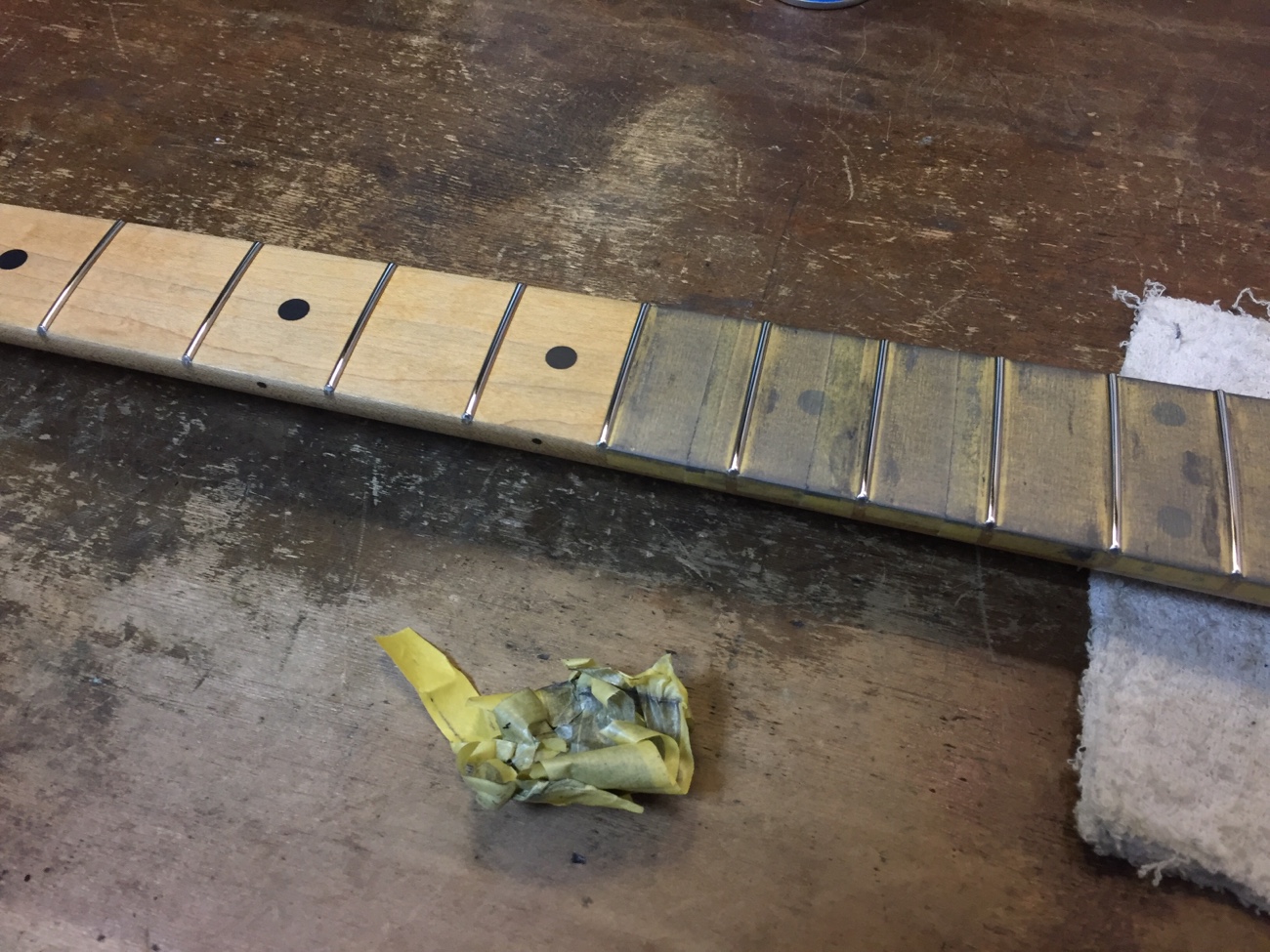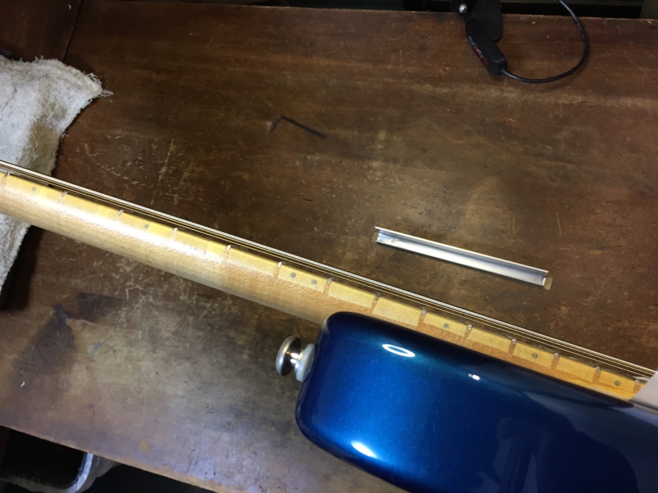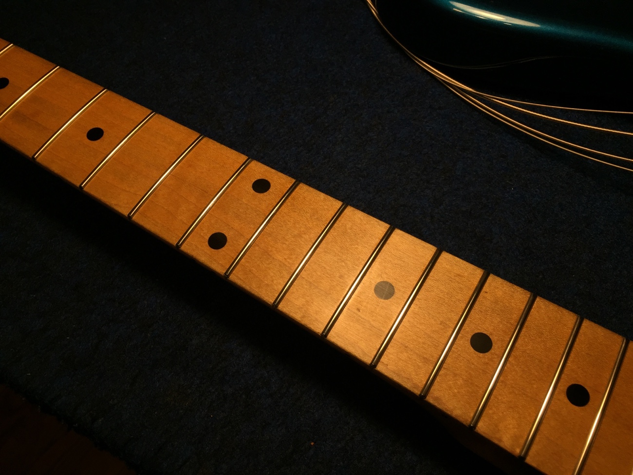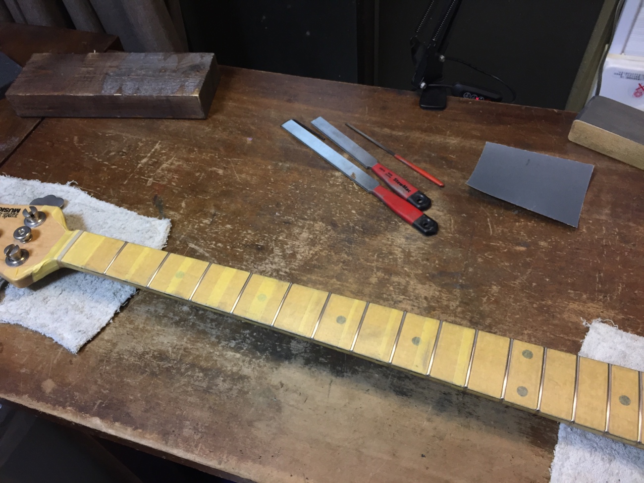 フレットを仕上げた【スターリン4Hのフレット交換-21】 投稿日時: 2025年10月26日 投稿者: admin フレットのすり合わせをします。 弦を張ったまま楽器を演奏するときと同じ角度に抱えてフレットの頂点をそろえます。 すり合わせが必要ないくらい最初から整っていました。 フレットを丸めていきます。 フレットを仕上げます。 ピカピカになりました。 ペグブッシュが浮いているのでペグをケアしていきます。 新しい弦を張ってナットの弦溝を仕上げたら完成になりますね。 Tweet