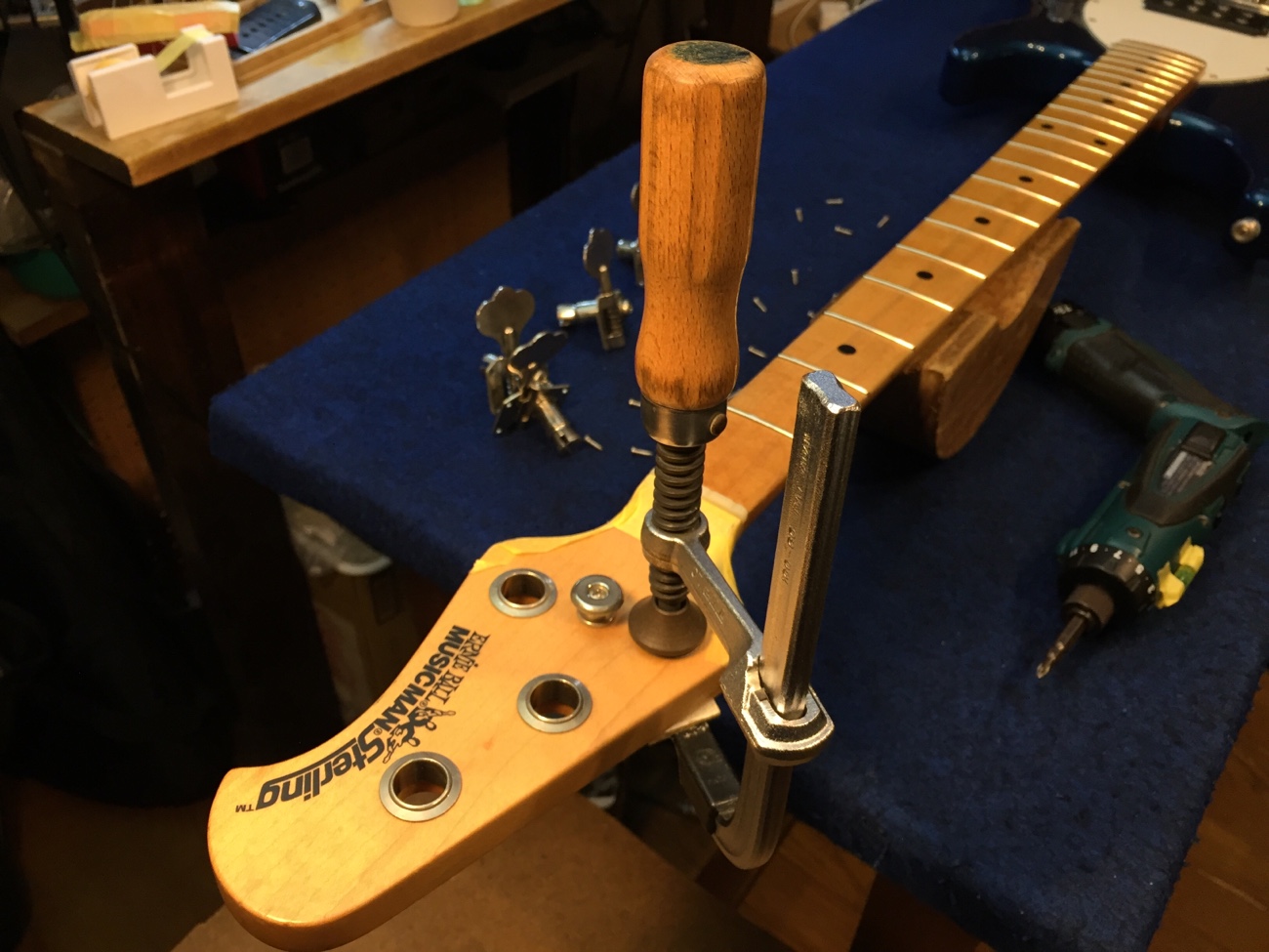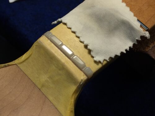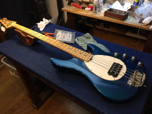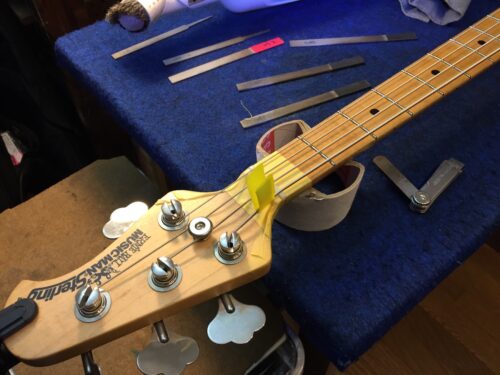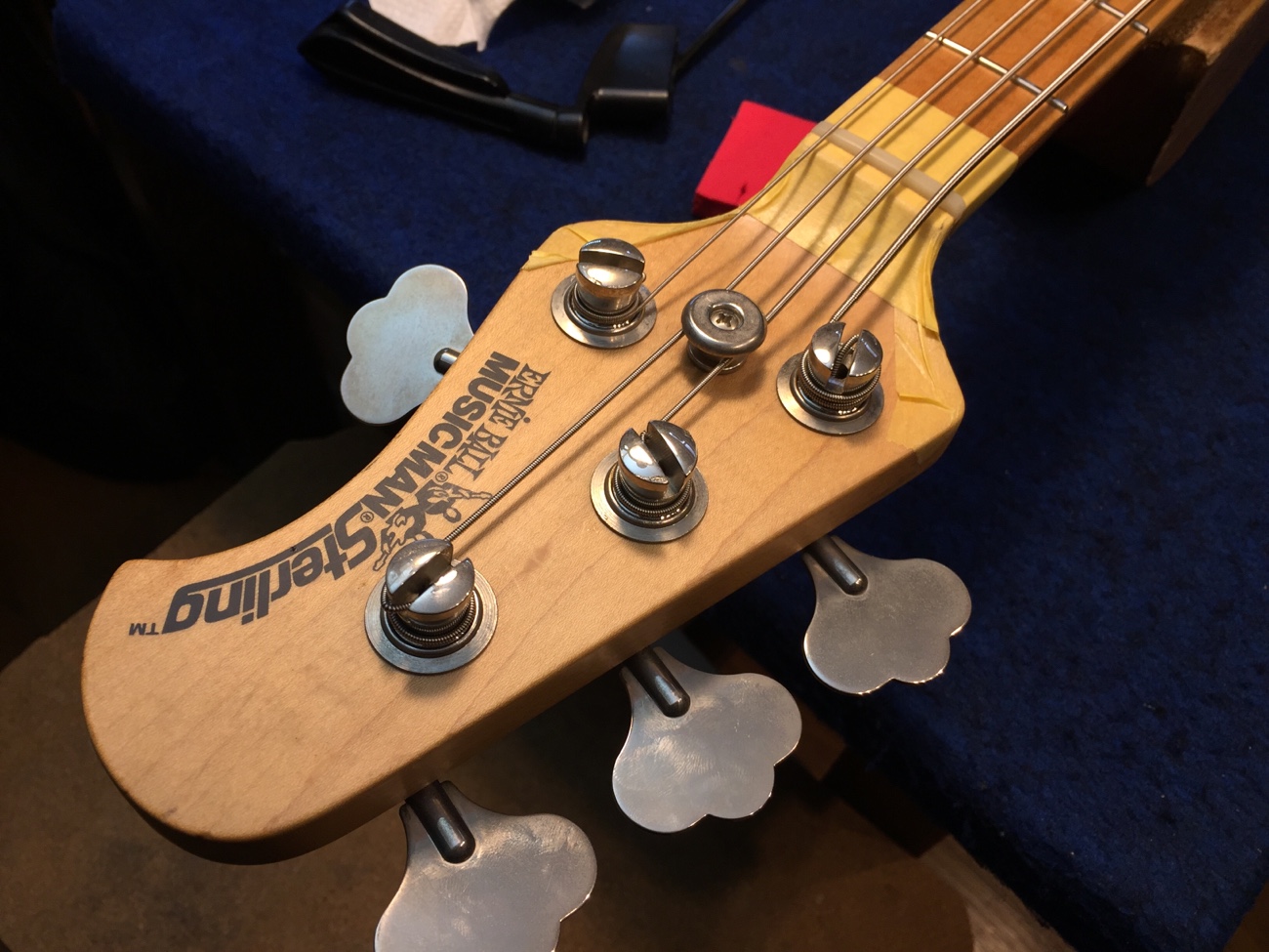 ペグのメンテナンスとナットの仕上げ【スターリン4Hのフレット交換-22】 投稿日時: 2025年10月29日 投稿者: admin ペグポストとブッシュの内側を磨いておきます。 ブッシュ浮きを修正します。 弦を張って・・・ 弦溝の深さを追い込んでいきます。 ナットを仕上げました。 新しい弦に張り替えます。 落ち着いたら弦高やオクターブ調整などをして完成です。 Tweet
