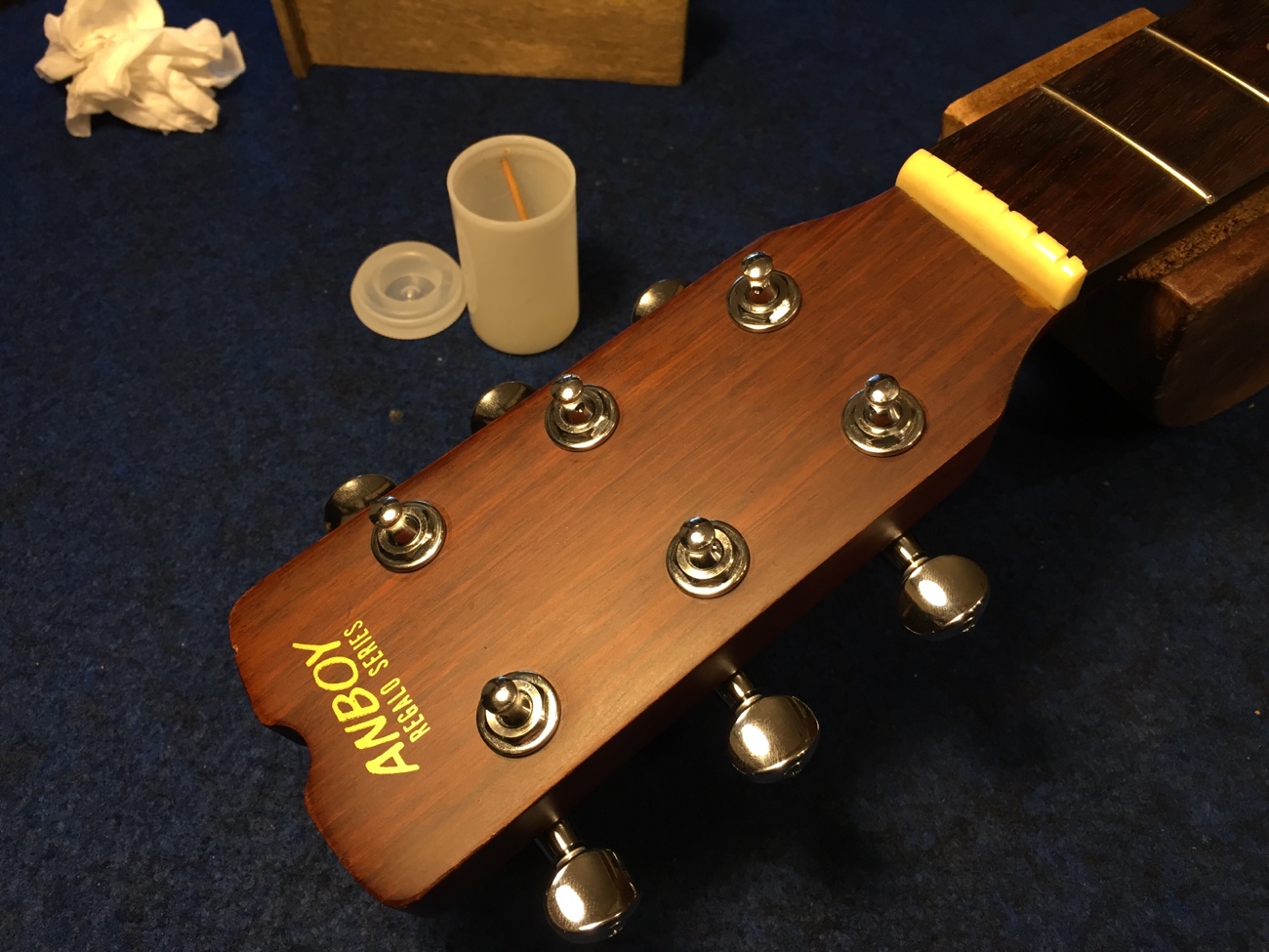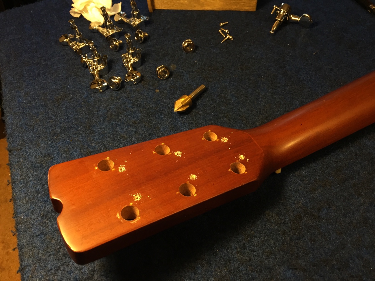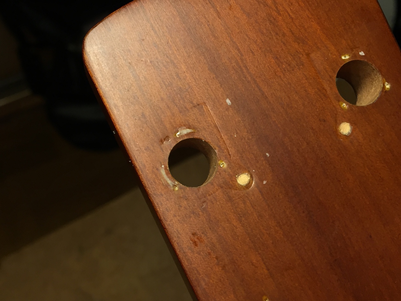 新しいペグのネジ穴をあけ直しました。 元のペグのあとが出ないように同じ位置に取り付けました。