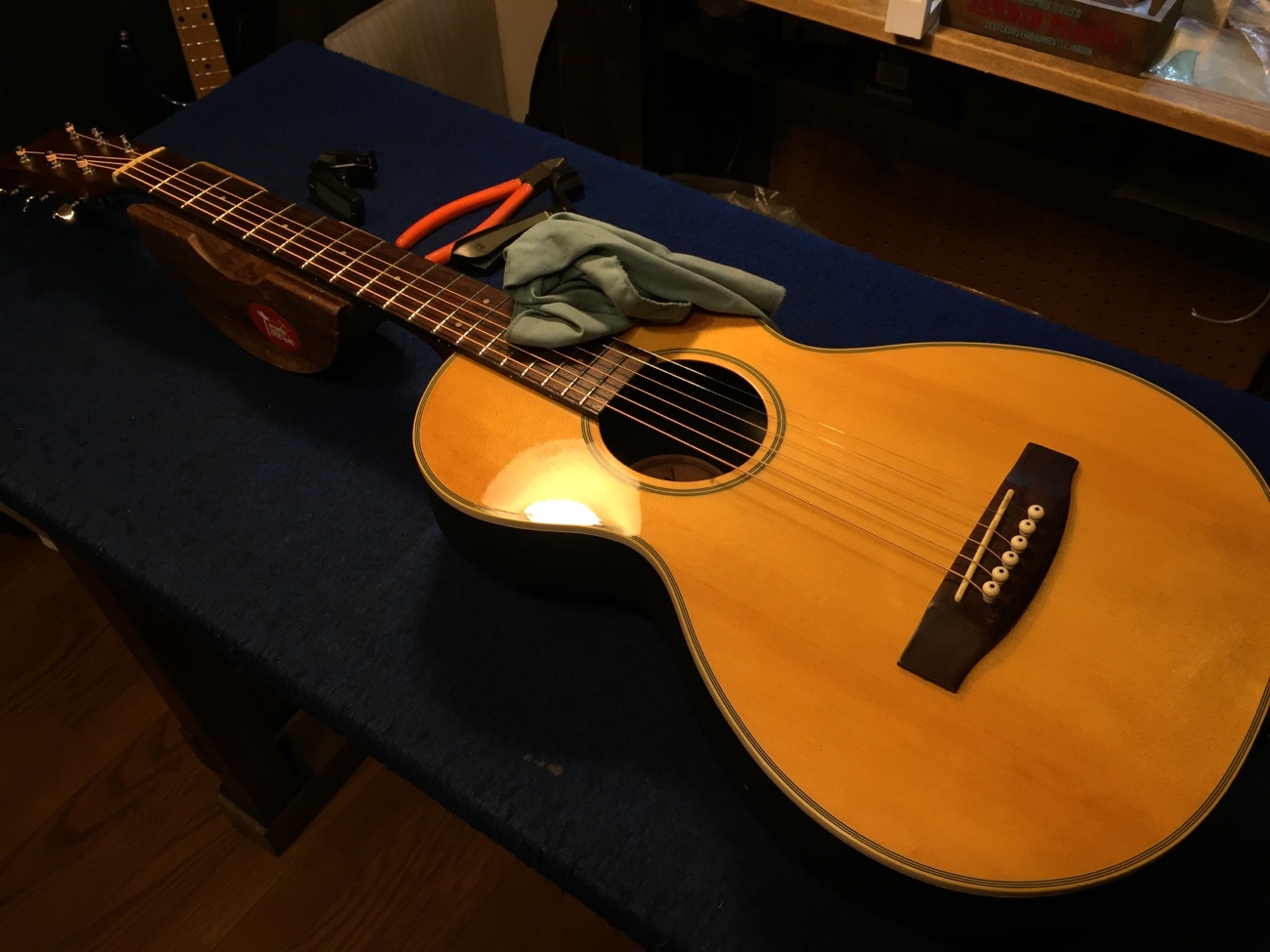 もともと細い弦が張られていたので、エリクサーの.010~の弦を張っておきます。