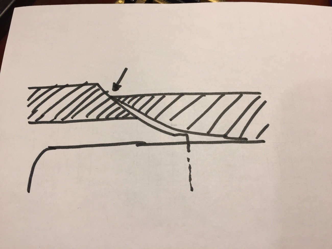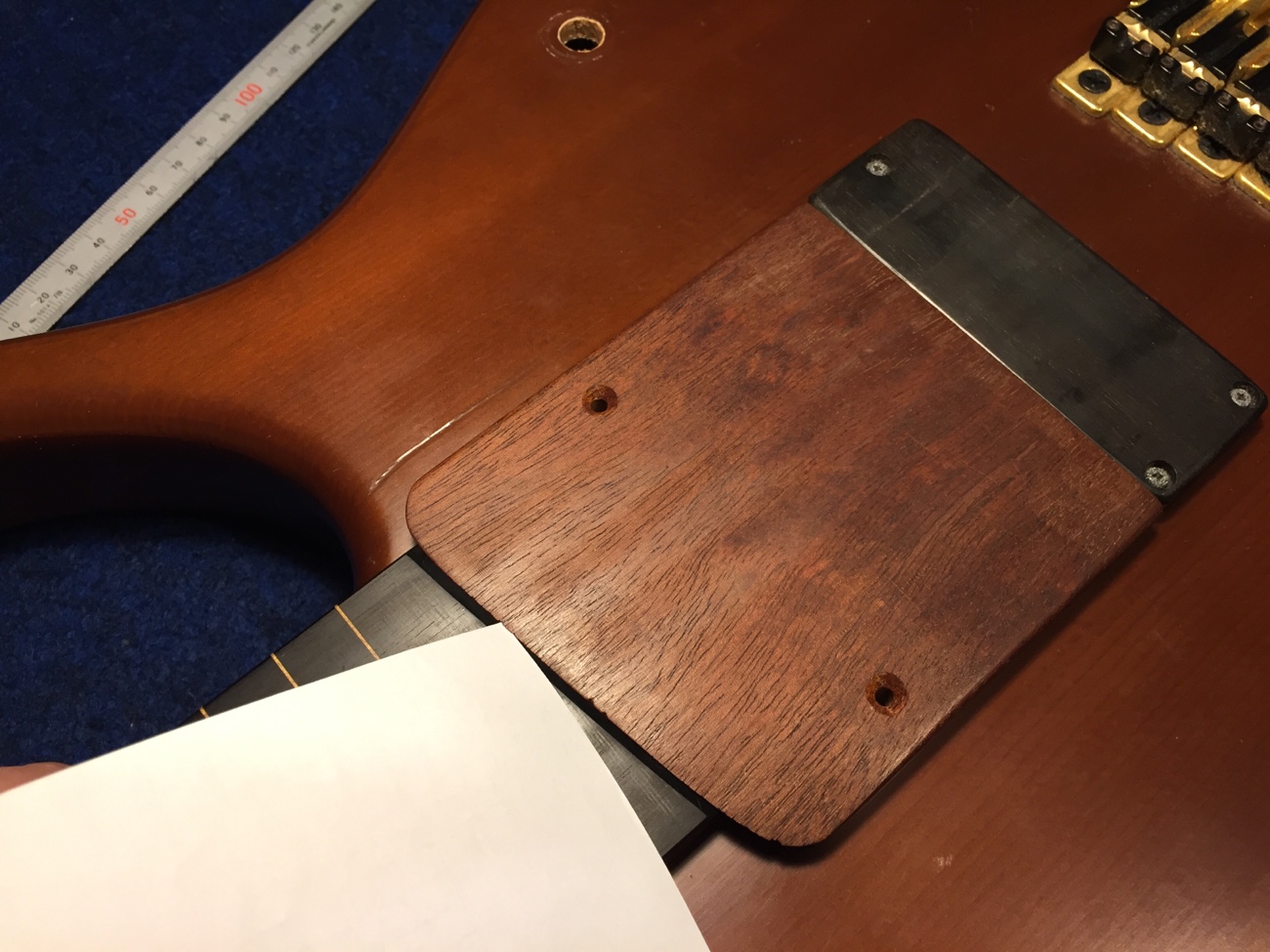 指板とランプはエッジでほぼほぼ接しています。 この段差は最終フレット(フレットレスですが)を押さえたときに弦が振動するためのクリアランスになっています。