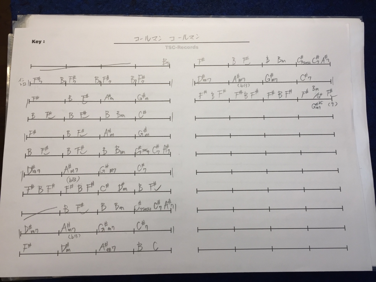 新曲コールマンコールマンのコード譜 投稿日時: 2025年11月30日 投稿者: admin 高校時代からつづいているバンド「たけたけsounds」の新曲がでたのでお客さんに聴いてもらっていたところ、シングルタイトル曲SNN(吹田ニュースネットワーク)は不気味すぎて最後まで聴けないということになりました笑 むしろ2曲目のコールマンコールマンのコードが知りたいとのことなので、写真に撮って持って帰ってもらいました。 キーがF#なのでごちゃごちゃしています↓ Tweet