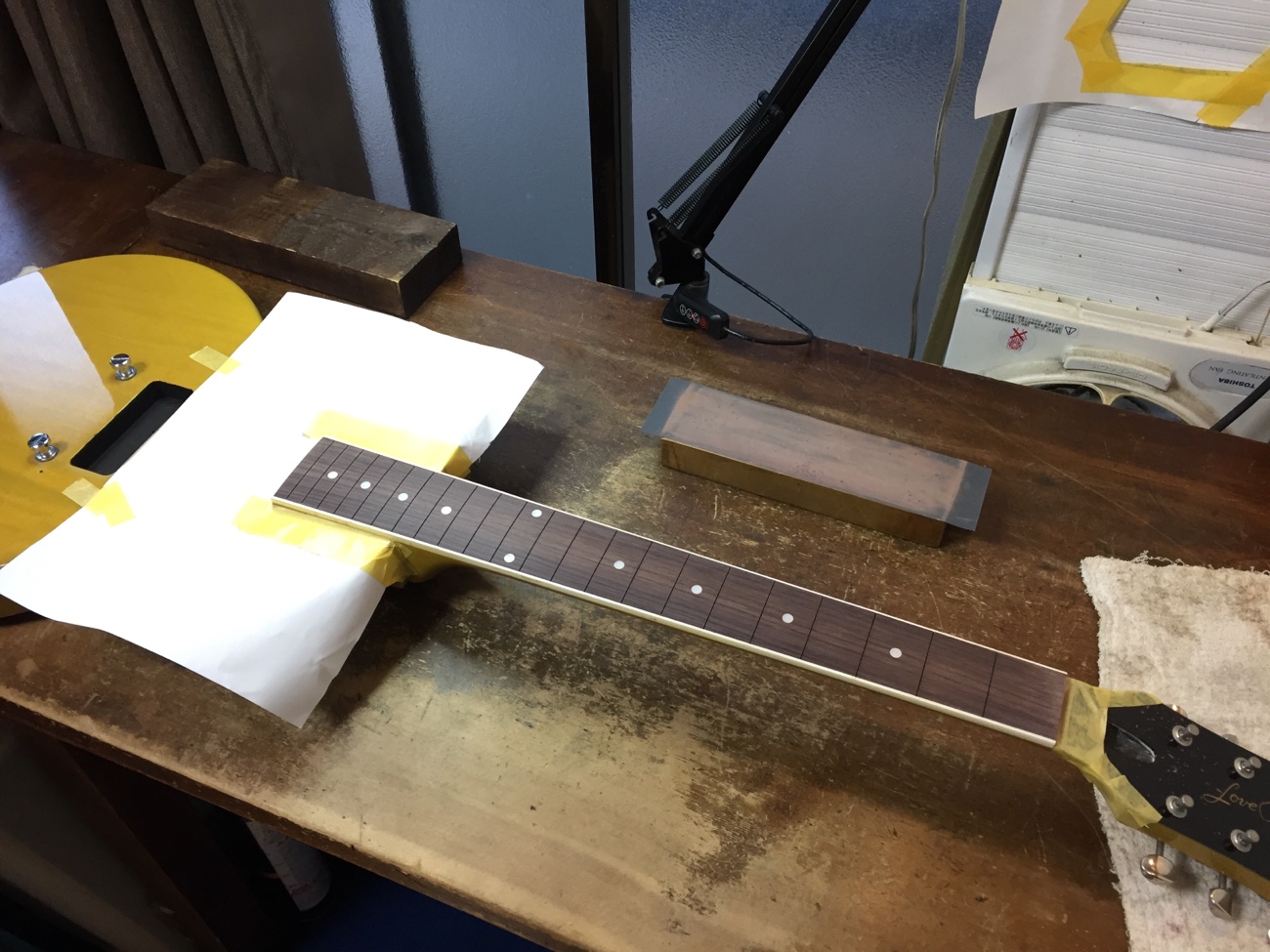 指板研磨の続き【Tokai LSS158 SEB(20250824お預かり)のチューンナップ-13】 投稿日時: 2025年12月5日 投稿者: admin 指板を#600まで研磨しました。 フレットの準備をしていきましょう。 ジェスカー#55090を打っていきます。 Tweet