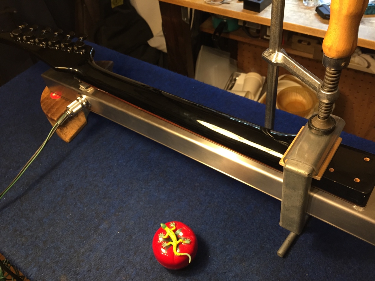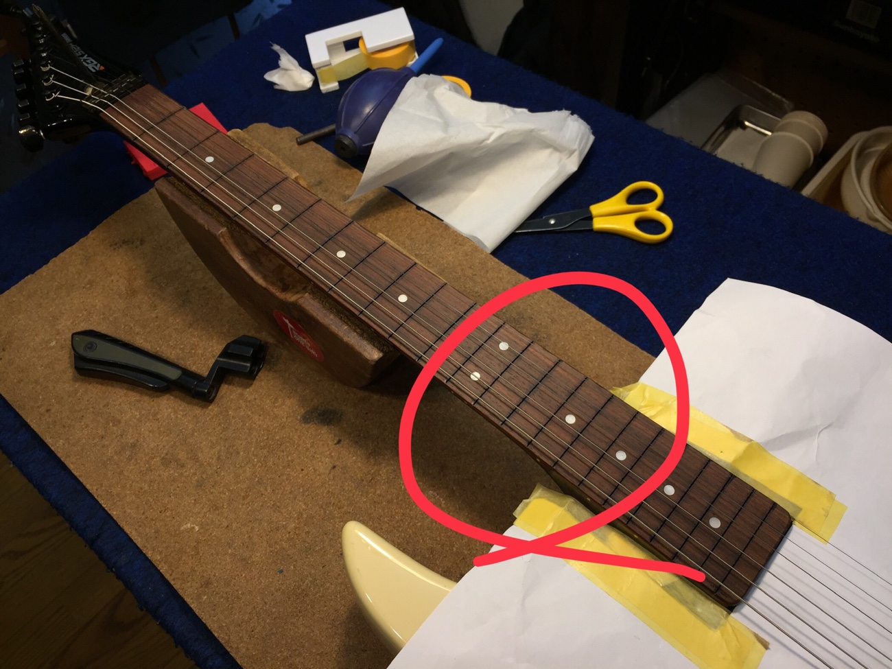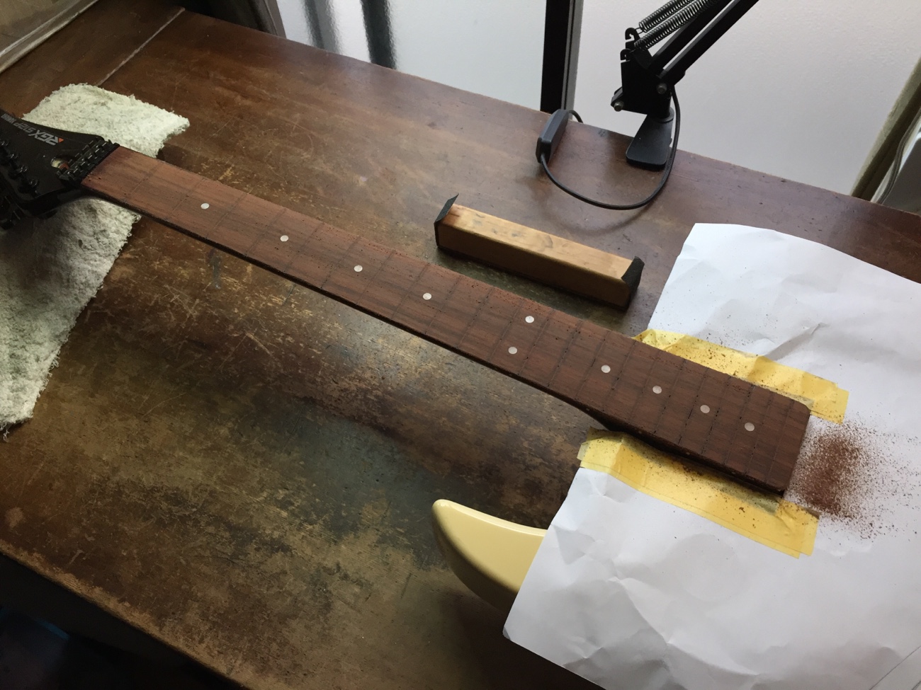フレットを抜いた【YAMAHA RGX 512Pのネックのオーバーホール-2】 投稿日時: 2025年12月6日 投稿者: admin トラスロットナットの清掃とグリスアップをしておきましょう。 指板の状態がどうなっているのかを調べるためにさっそくフレットを抜きました。 接着剤を清掃する程度に軽く研磨しました。 ハイポジションに順反りが残りますね。 ヒーター修正をしていきましょう。 Tweet