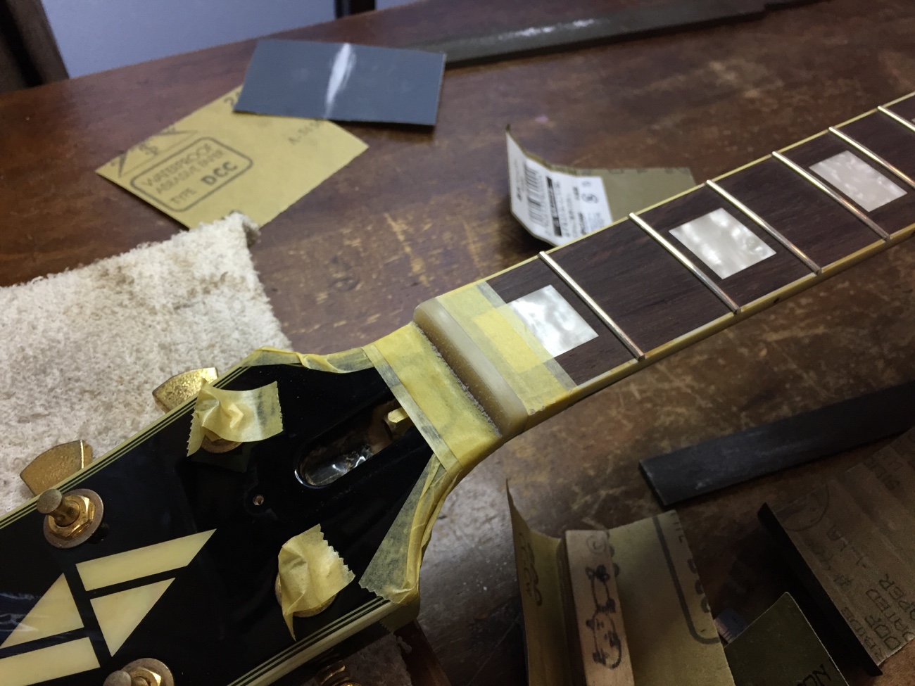 ナットの成形【Laid Backのレスポールカスタムタイプのチューンナップ-20】 投稿日時: 2025年12月10日 投稿者: admin 牛骨ナットの形を整えました。 弦溝を作っていきましょう。 Tweet