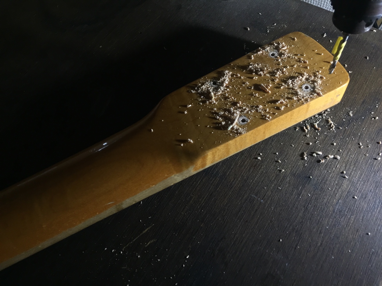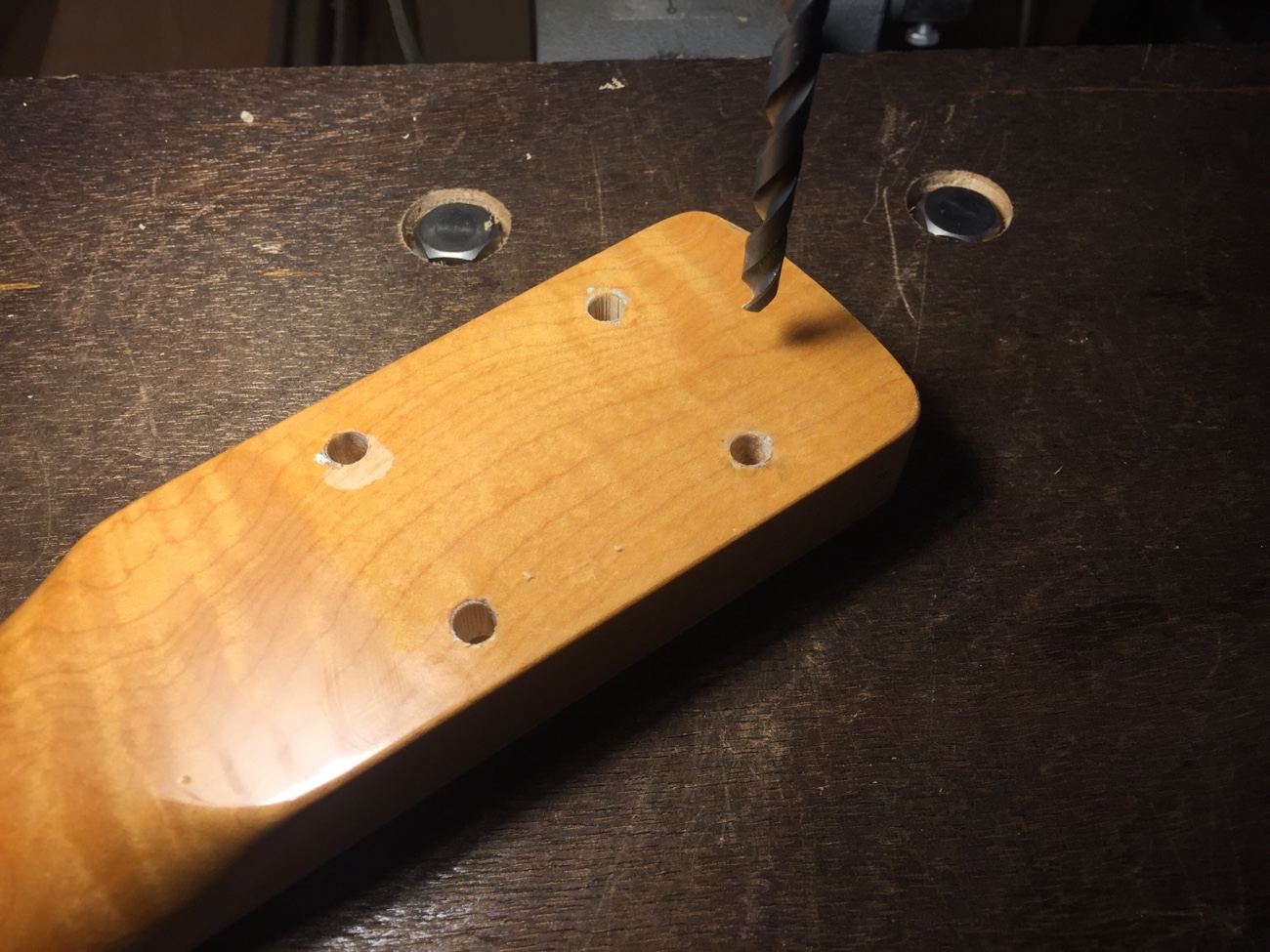 ネックと同じメイプル材で作る木栓が入る穴を作ります。