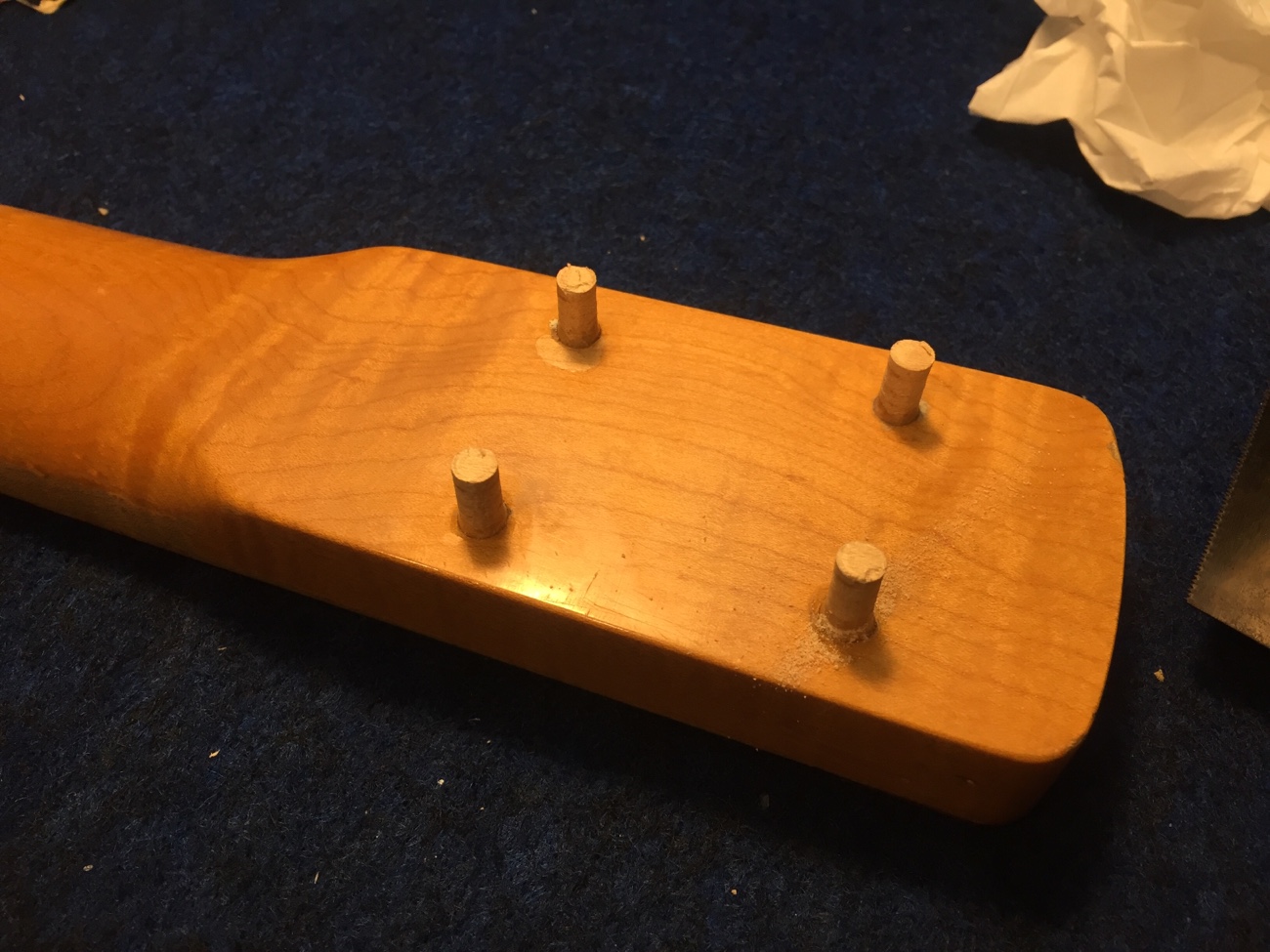 メイプルの木栓で埋めました。 いつもはタイトボンドで埋めるのですが、以前に埋木したときに瞬間接着剤が使われている気がするのでタイトボンドだと接着不良が起こるかも知れません。 木工用アロンにしました。