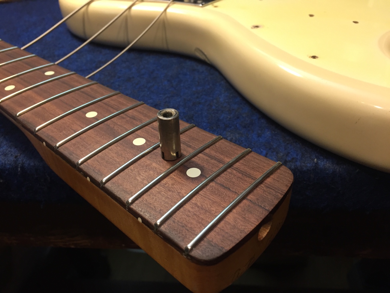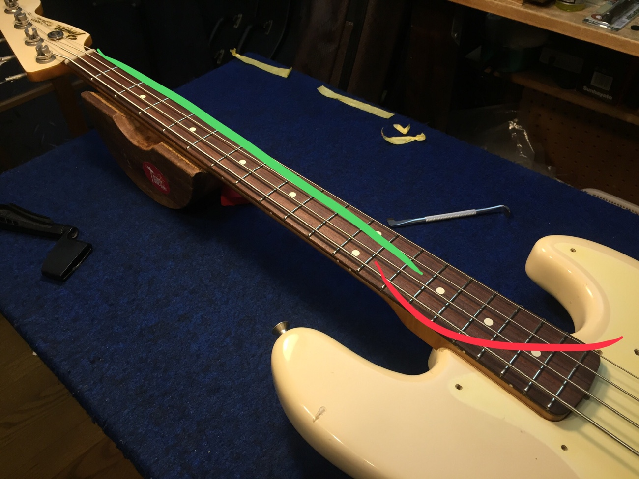 ロッドナットは全く締まっていなかったので120°回しました。 ハイポジションに比較的大きめな順反りがあります。 17フレット以降がビリつくということですがこれが原因です。