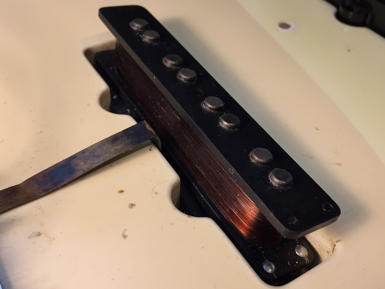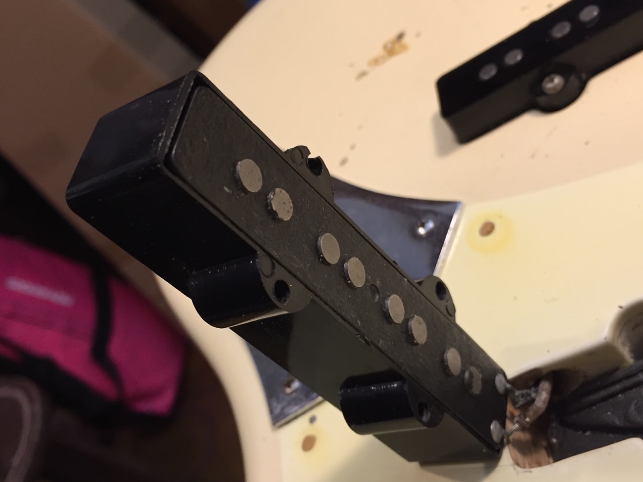 ボビンの幅、コイルの巻き量、エナメル皮膜線が使われているなどおそらくこのベースに最初から付いていたピックアップでしょう。 オーソドックスなビンテージ系JBピックアップだと思います。