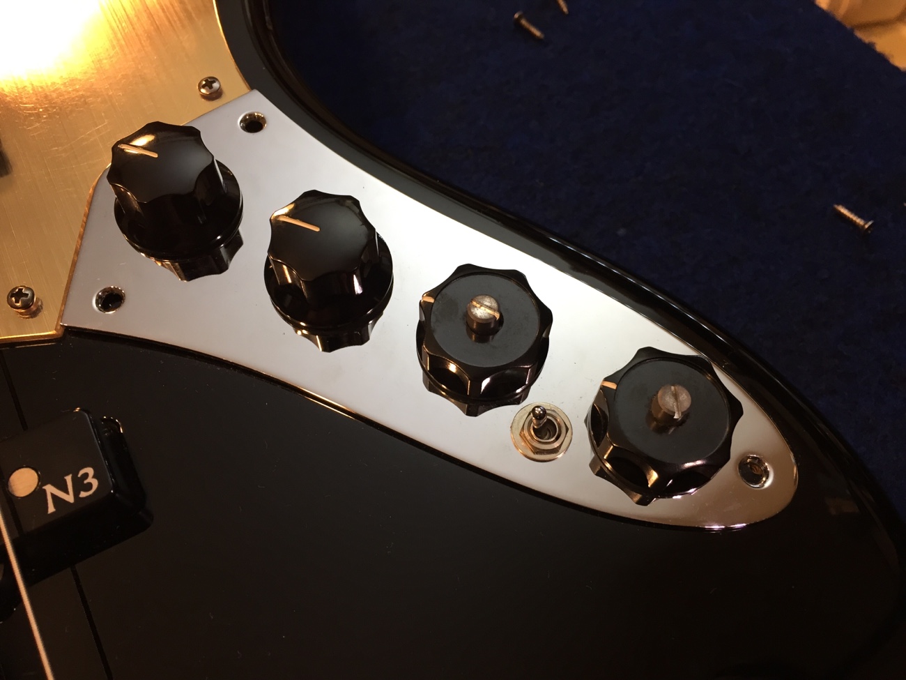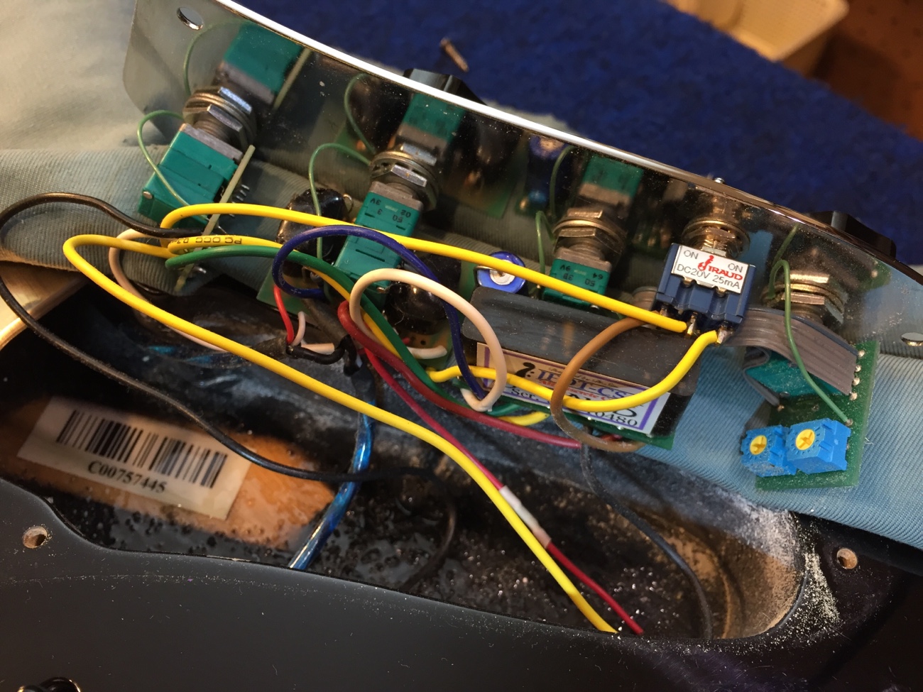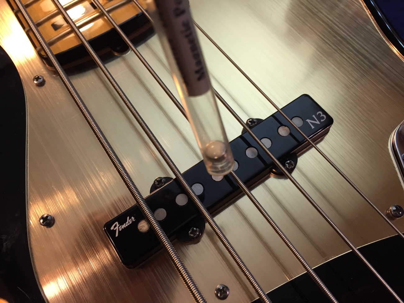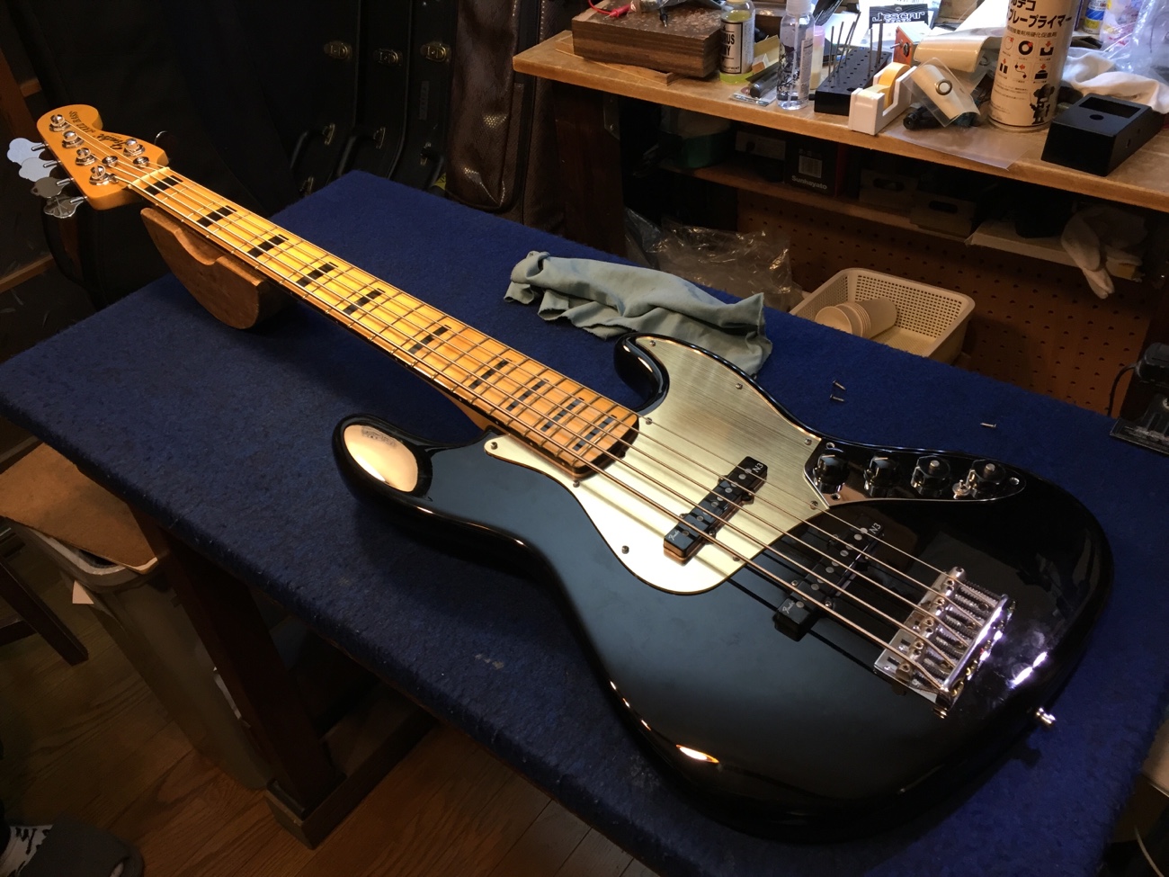 キャビティを開けてみる【ブラック フェンダー5弦ベースのノイズ処理-1】 投稿日時: 2026年1月28日 投稿者: admin フェンダーの5弦JBです。 外来ノイズが多いのが気になっているそうなのでの対処していきます。。 コントロールはジラウド製のプリアンプに交換されているそうです。 ピックアップはどちらもN極ですが、バランサーを動かしてもノイズが増減しません。 たぶん内部でコイルが2段積みになっていてノイズをキャンセルしているのではないかと思います。 配線はこんな感じ。 スイッチ付きボックスジャックの配線が複雑で個性的です。 分解せずに導電塗料を塗っていきたいと思います。 Tweet