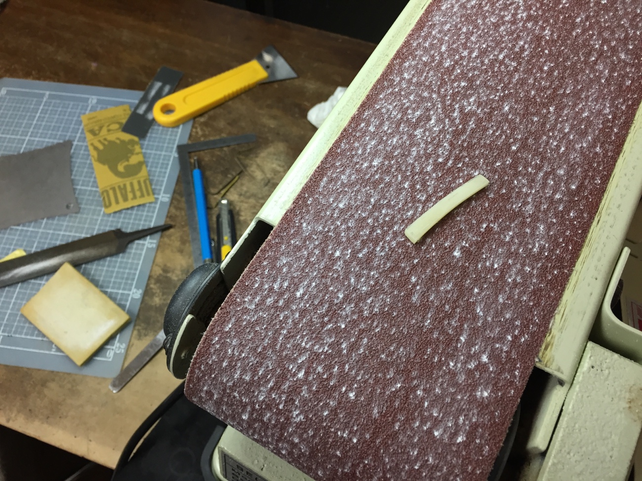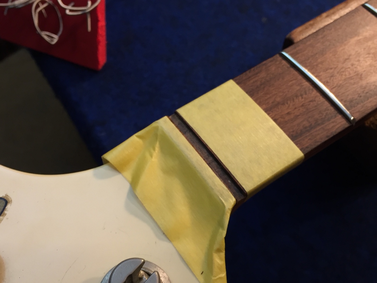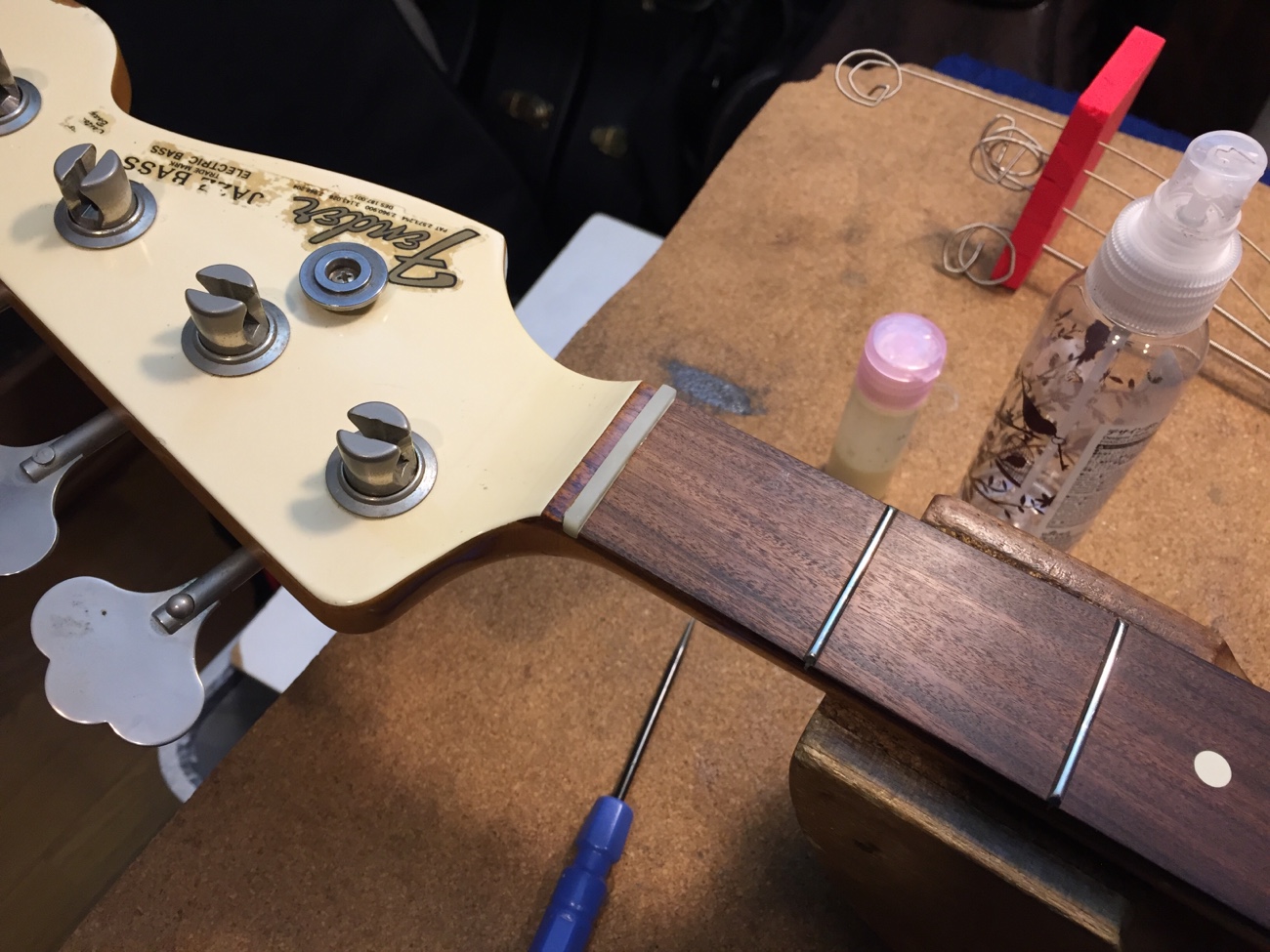 オイル漬け無漂白牛骨ナットの取り付け【カスタムショップ製オリンピックホワイトJBにリアルセルロイドピックガードを取り付ける-5】 投稿日時: 2026年1月29日 投稿者: admin シムを抜いた状態で弦高がどれくらいになるかを調べて欲しいということなので抜いてみました。 2.5~3.0mmくらいになります。 弦高が高いほうが好みだそうなのでシムなしでも良いのかもしれません。 ナットを外しました。 接着材を清掃します。 牛骨ナットを粗加工して・・・ 取り付けます。 Tweet