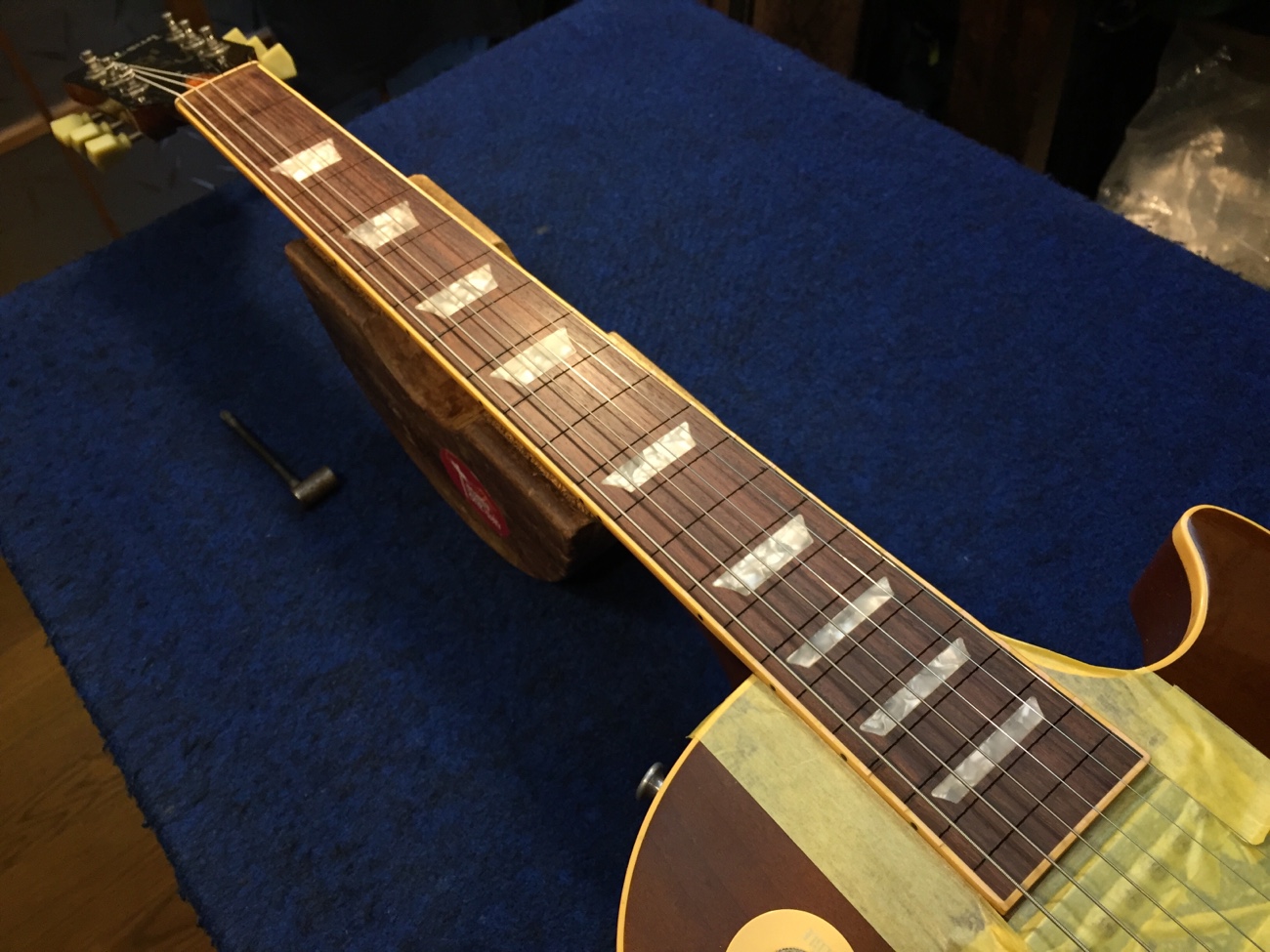 指板のRを修正する【ギブソンレスポールスタンダード(20251231お預かり)ネックのオーバーホール-16】 投稿日時: 2026年2月4日 投稿者: admin おおむね指板の直線性ができてきました。 ローポジションの2弦あたりと、ハイポジションの5弦あたりに指板Rのピークがあるのが気になります。 Rも補正していきます。 弦を張って直線性を確認することと、行ったり来たりしながら進めます。 Tweet