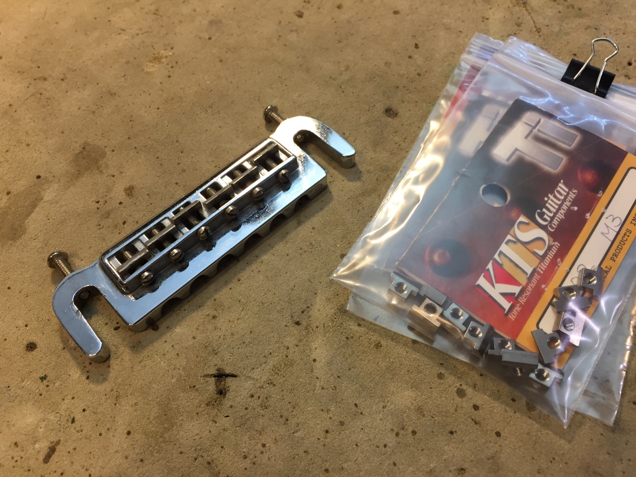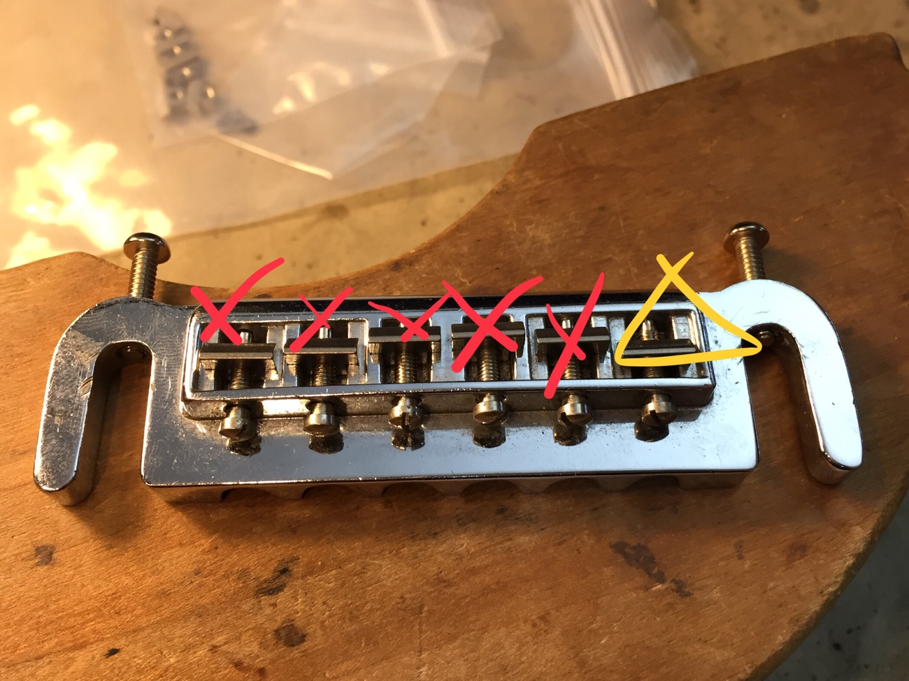 チタンサドルに交換してみる【レスポールスペシャル(20260131お預かり)のブリッジ交換-2】 投稿日時: 2026年2月5日 投稿者: admin バダスのサドルをチタンサドルPR-02に交換していきます。 ネジ切り部分がM3になっている特殊なものです。 6弦は交換できました。 ちょっときついくらい。 他はダメでした。 オクターブネジの先端が入らないので、凹みをほんの少しだけ拡げてみたいです。 Tweet