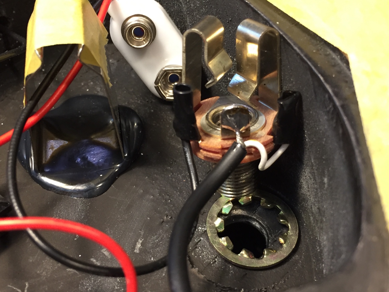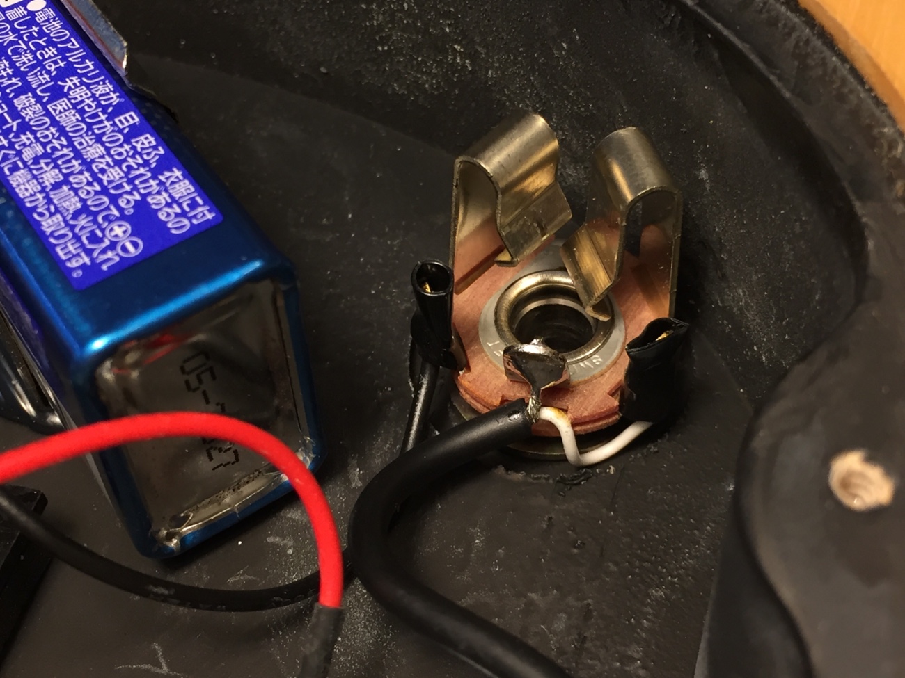 ジャック交換作業【ときどき音が出なくなるAtelier Z Baby Zの修理-2】 投稿日時: 2026年2月5日 投稿者: admin 音が出なくなる理由が分かりました。 ロックワッシャーが入っていないのでジャックが回転してしまっているのですが、ホットのハンダ付け端子が導電塗料に接触して、アースにショートしてしまっています↓ ロングタイプのジャックに交換してロックワッシャーを入れます。 ハンダ付け端子を折り曲げて垂直にすることで、キャビティに接触しないようにします。 また、熱収縮チューブで絶縁しておきます。 電池のマイナスも断線予防のためにチューブで補強しておきました。 これで音出ずトラブルは解消されたはずです。 Tweet