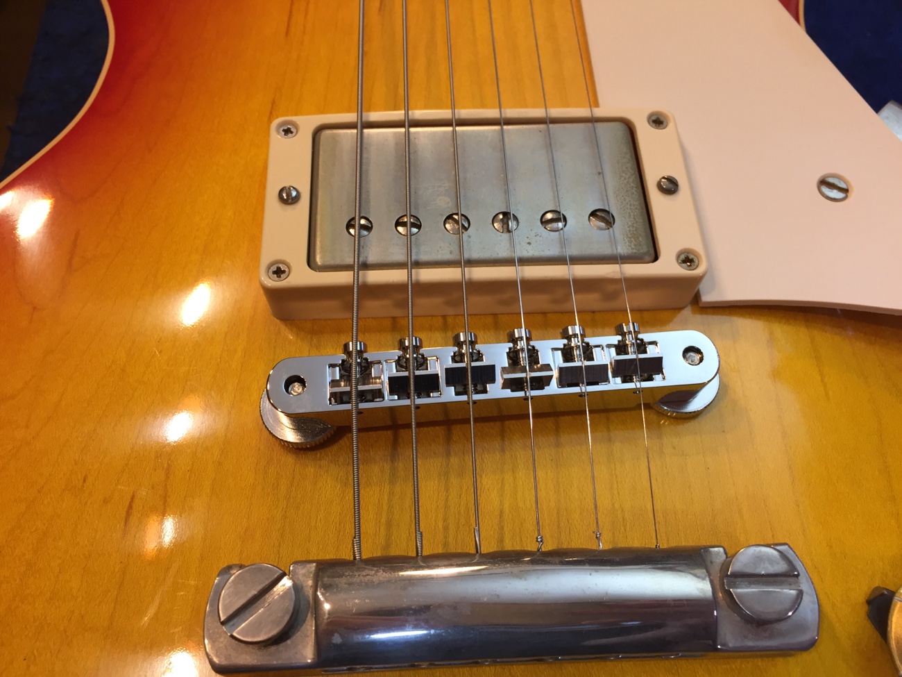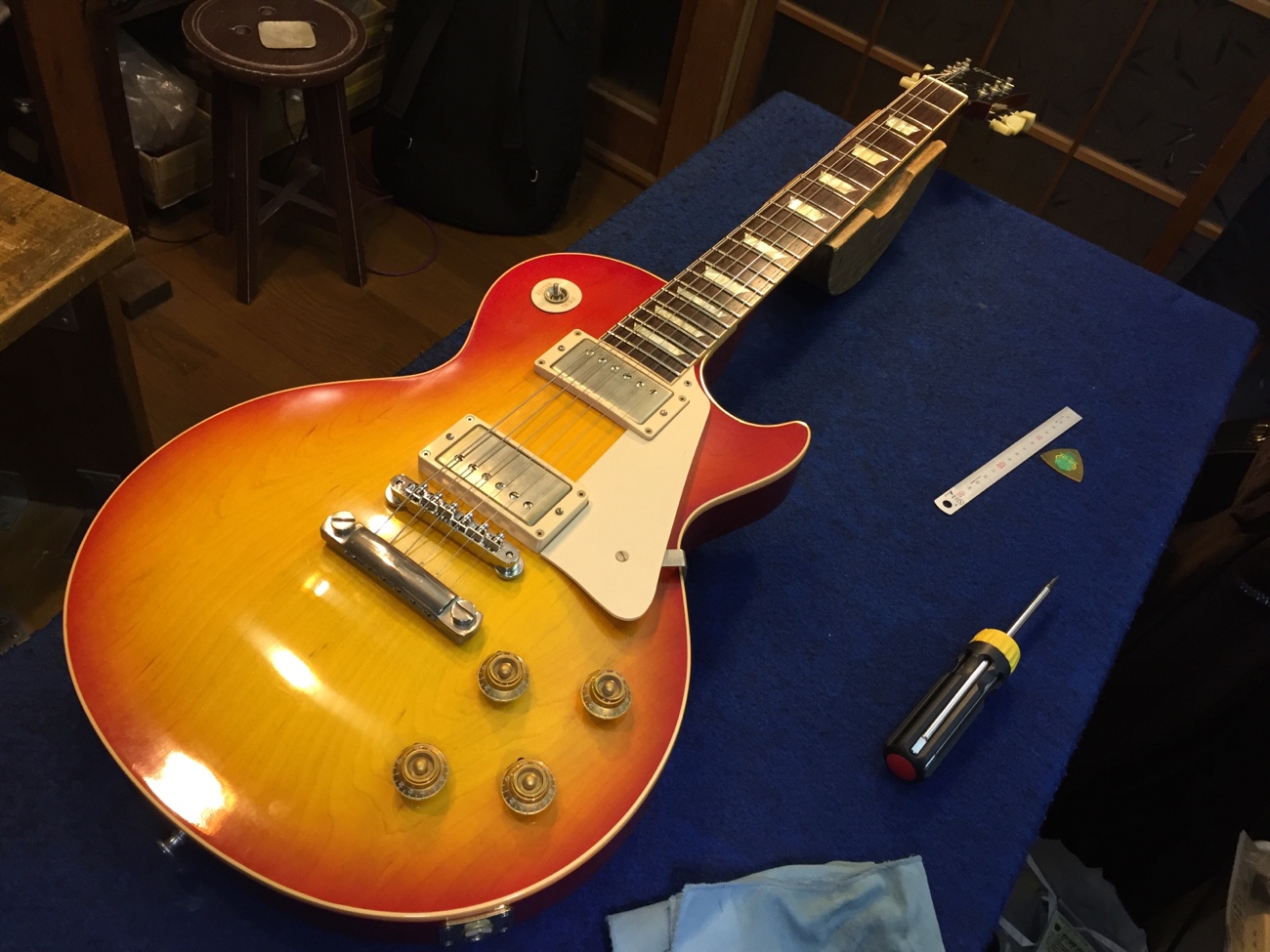 ほぼ完成【レスポール・スタンダード(20251210お預かり)のフレットすり合わせ-17】 投稿日時: 2026年2月6日 投稿者: admin ナットの上面を磨いて仕上げます。 弦高調整オクターブチューニングなどをしました。 トラスロッドをほんの少しさわったので、変化がなければチェックして完成です。 Tweet