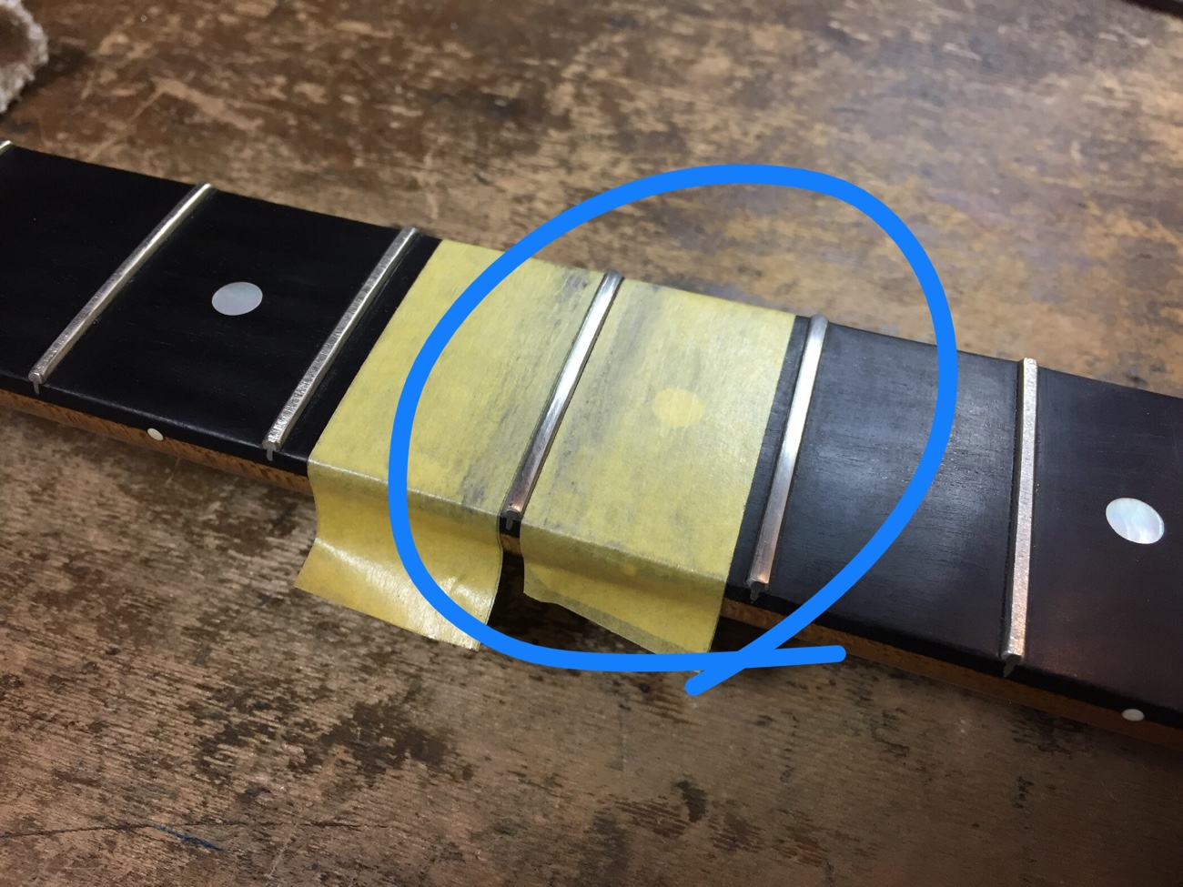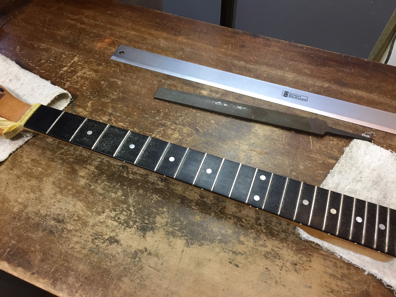 フレットの粗加工【Sonic SCタイプのフレットすり合わせ-2】 投稿日時: 2026年2月6日 投稿者: admin フレットに付いた弦のあとが消えるまで、全体を大まかに削ってしまいます。 弦のあとがついていたフレット2本だけ丸めてみました。 きれいになりそうです。 全てのフレットを大まかに丸めていきます。 弦を張った状態で頂点をそろえていきます。 その前にピックアップの修理を終わらせましょう。 Tweet