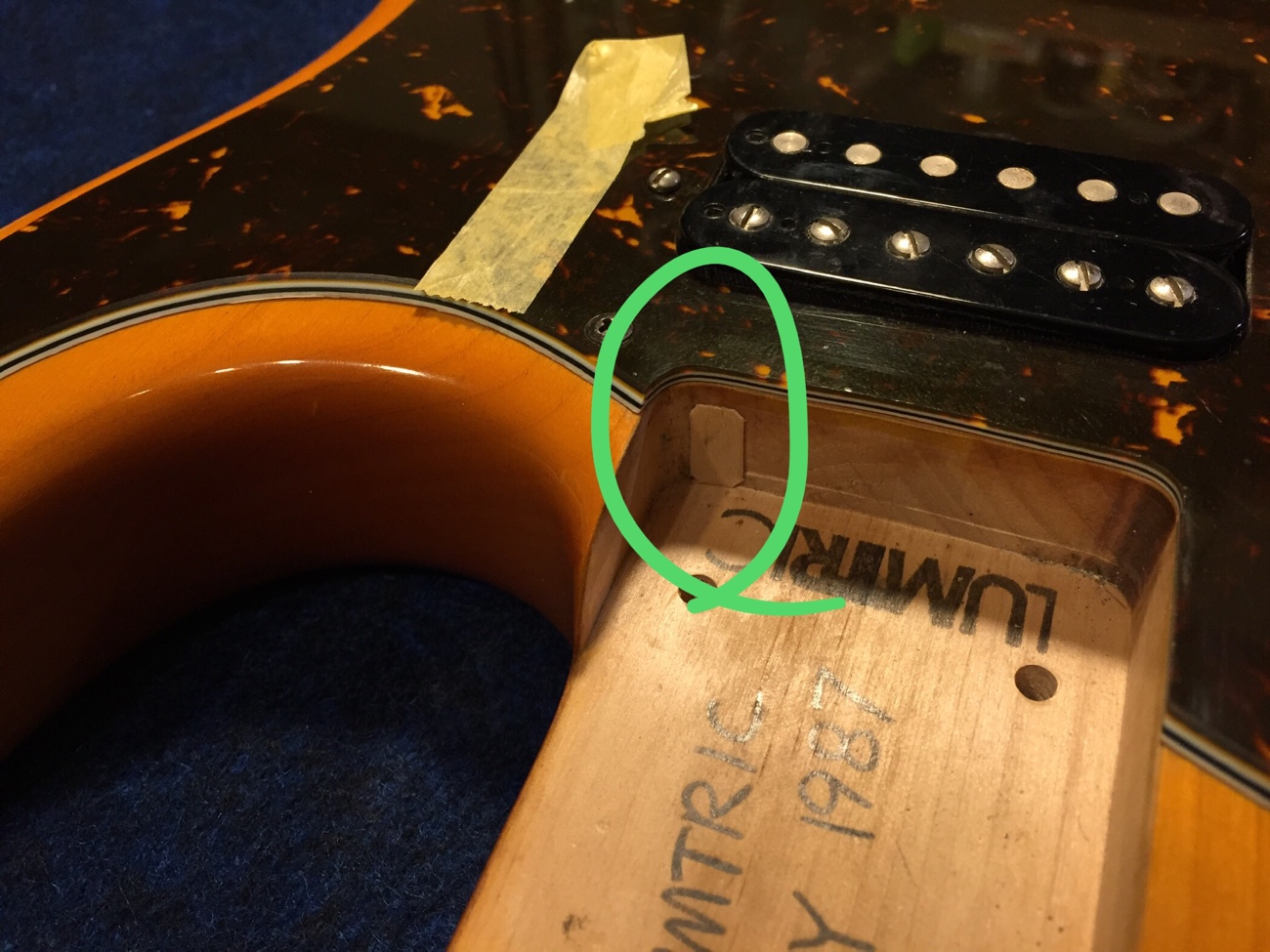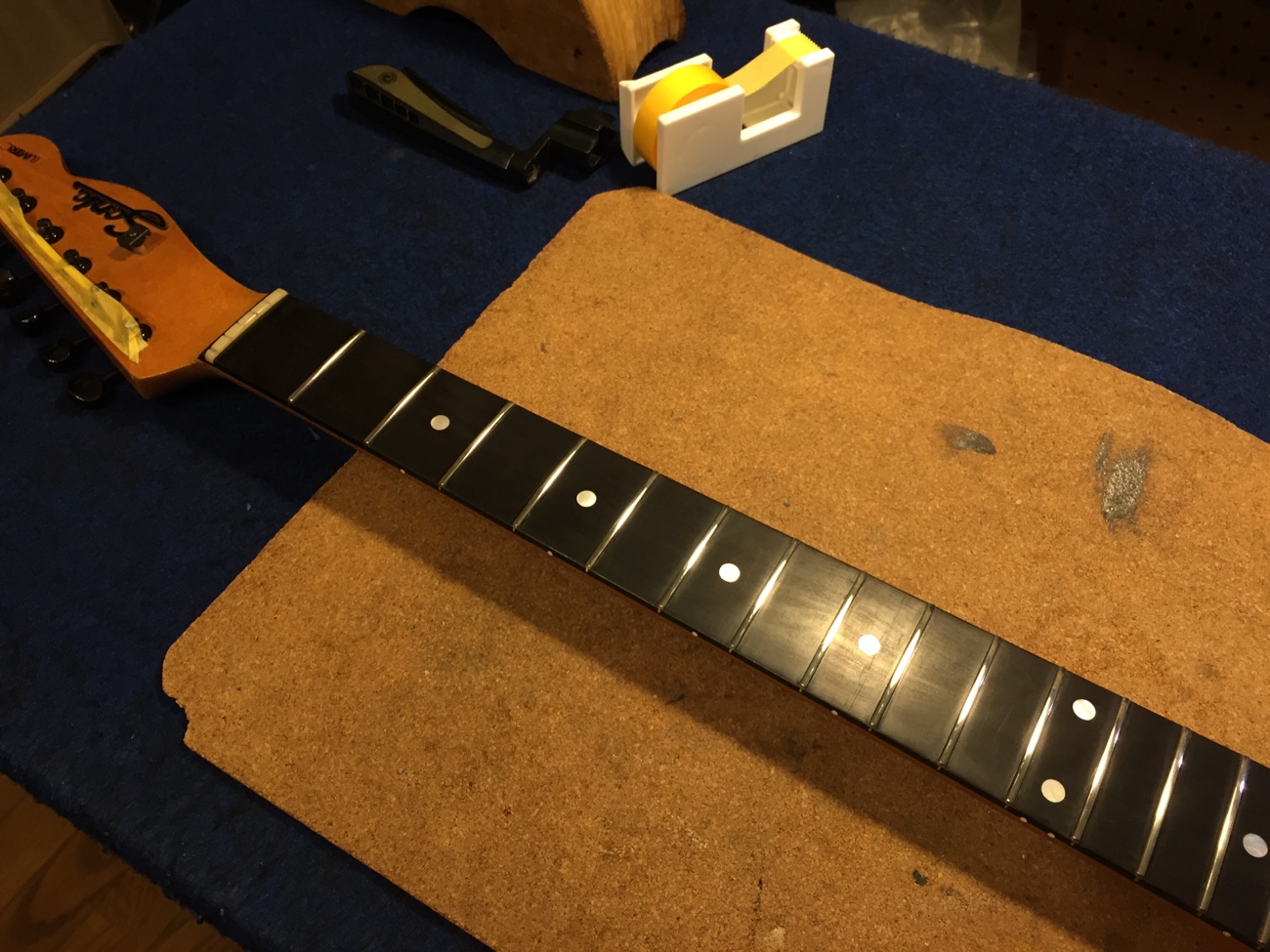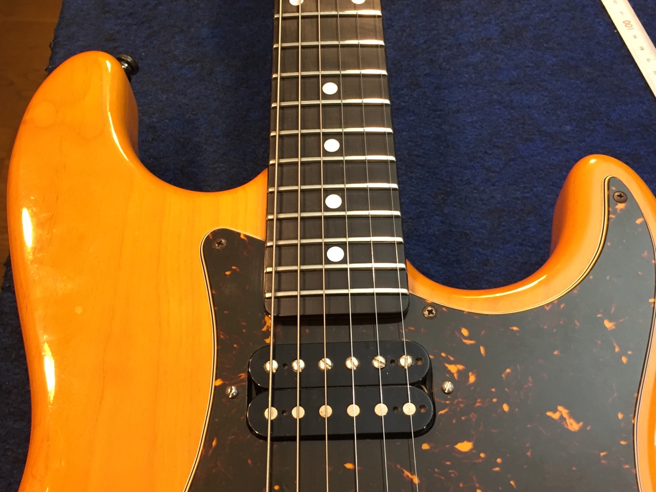 フレットを仕上げた【Sonic SCタイプのフレットすり合わせ-4】 投稿日時: 2026年2月9日 投稿者: admin 弦を張った状態でフレットの頂点をそろえて、ピカピカに磨き直しました。 ネックが1弦側に倒れてきていたので薄板を貼ってみます。 これでセンターは元の位置に戻りました。 Tweet