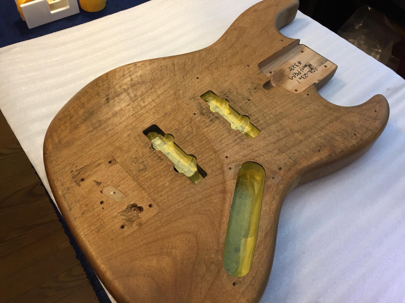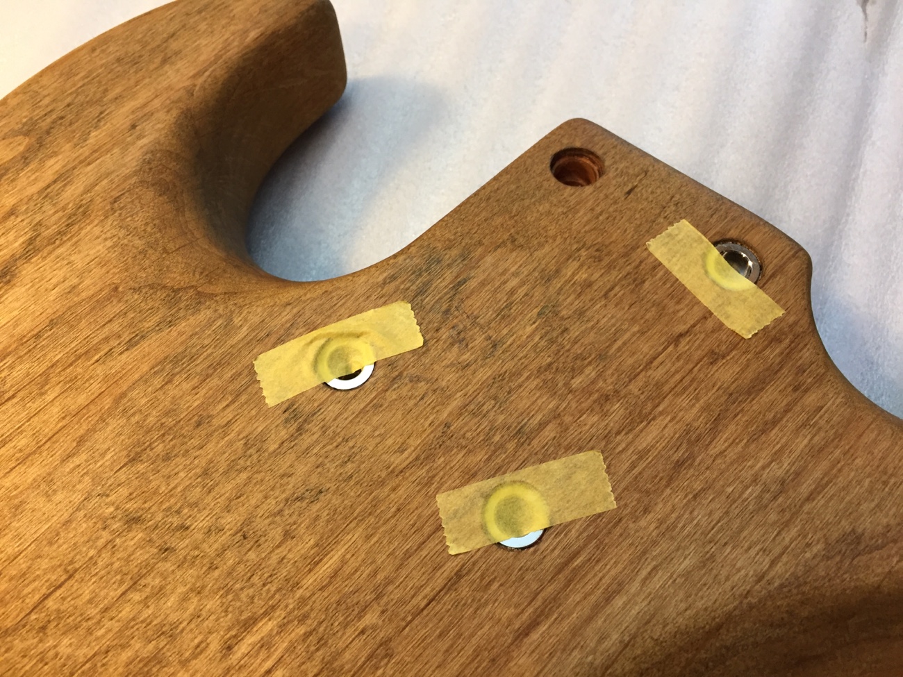 キャビティをマスキングする【Moon5弦にXTCTを増設する-10】 投稿日時: 2026年2月9日 投稿者: admin 塗装が入り込まないようにマスキングテープを貼っていきます。 そう言えばジョイントブッシュを抜かないといけません。 3個外れないところがあります。 ここにさらに塗装が入り込むのもいやなのですが仕方ないですね。 あとで掃除しましょう。 Tweet