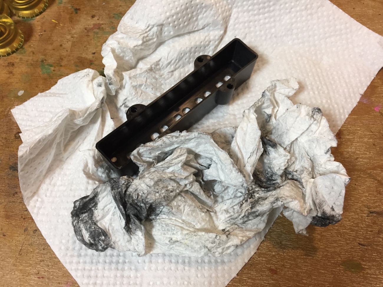 カバー内側の導電塗料についてです。 抵抗値が高い上にグラウンドにつながっていなくて、おそらく全く効いていなかったと思われる導電塗料は、コイルとのショートのリスクもあるので剥がしました。