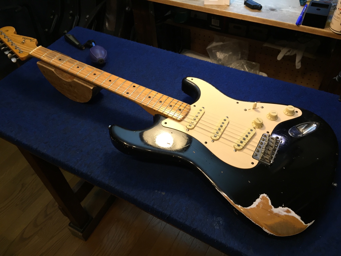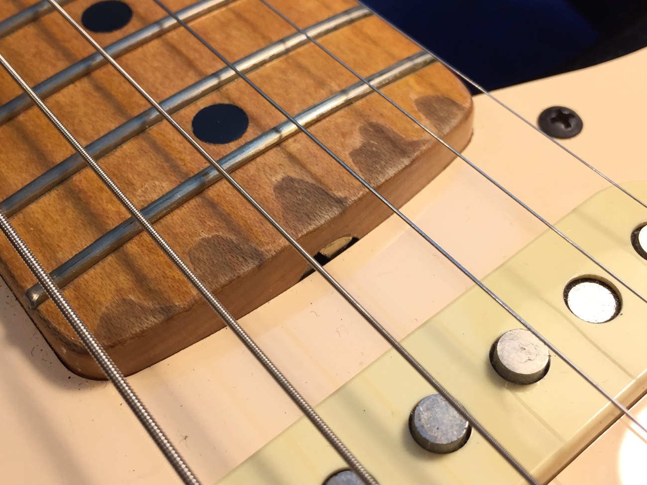 カスタムショップ製のストラトです。 メイプル1ピースネックのギターとして探した1本だそうです。 ジェスカーフレットの#55090ニッケルに打ち替えます。