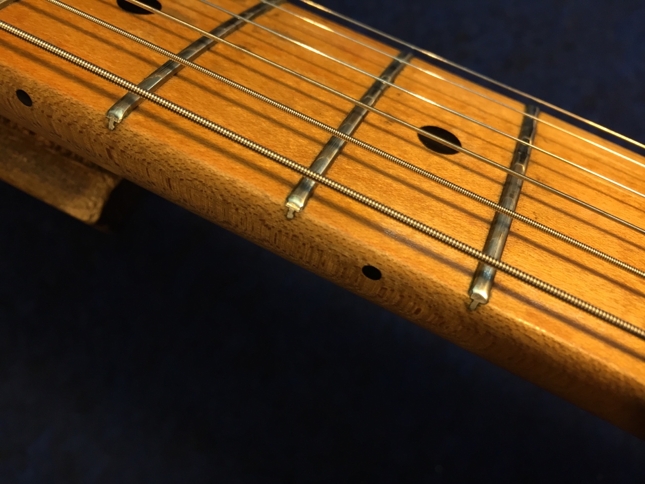 弦間が11.3mmピッチのトラディショナルなトレモロが付いているので、フレットのエッジは寝かさず、あまり丸めすぎず仕上げて欲しいとのことです。