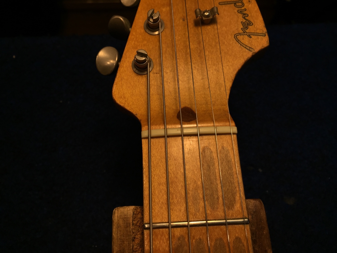 ナット側で弦の間隔を今より気持ち狭くして欲しいとのことです。 オイル漬け無漂白牛骨ナットに交換します。