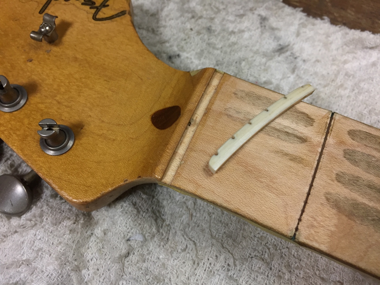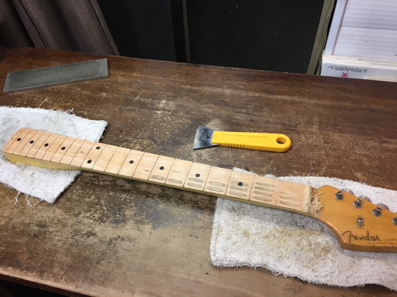 指板の塗装を剥がした【カスタムショップ製メイプル1Pストラトのフレット交換-3】 投稿日時: 2026年2月27日 投稿者: admin 指板の塗装を剥がしていきます。 ナットは外れていました。 これで一度弦を張ってみて、ネックの反り具合がどうなっているのか調べましょう。 Tweet