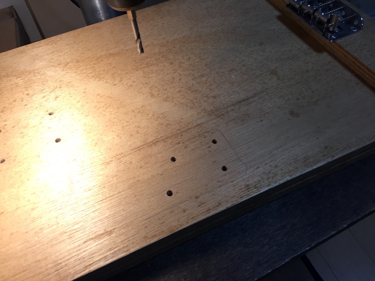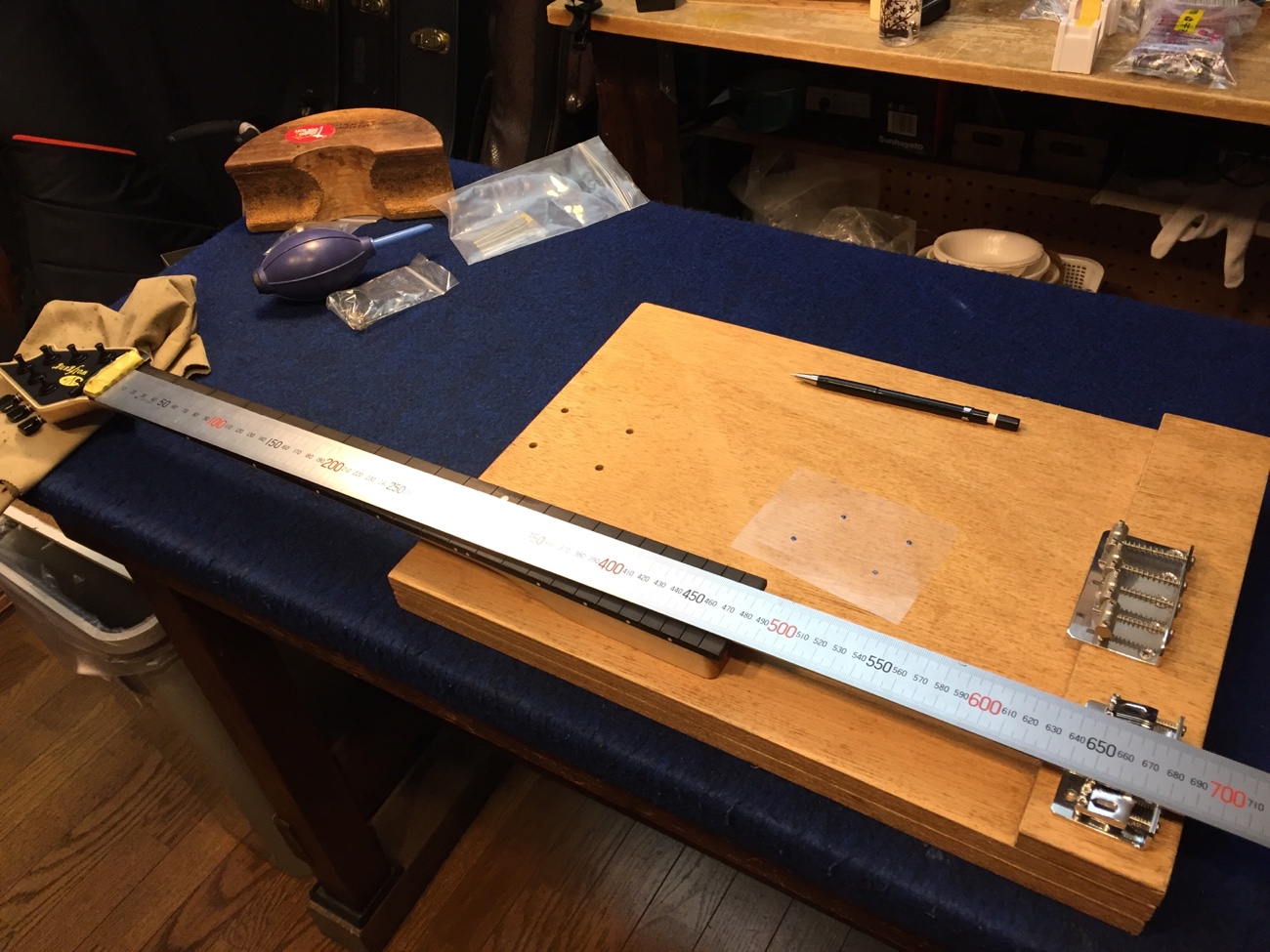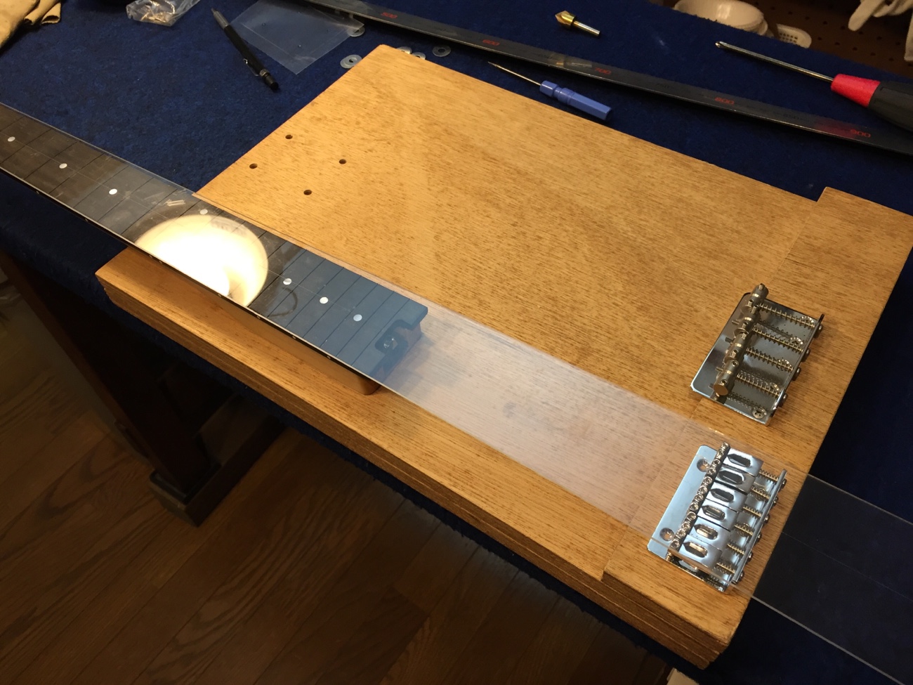 ダミーボディの加工【EVHのフレット交換-5】 投稿日時: 2026年3月5日 投稿者: admin ネックの取り付け位置をブリッジから逆算します。 テンプレートを使ってネジ穴の位置を出します。 穴あけができました。 ここにネジ止めできます。 一応センターを確認してブリッジを取り付けていきます。 これでネックに弦の張力をかけることができるようになりました。 Tweet