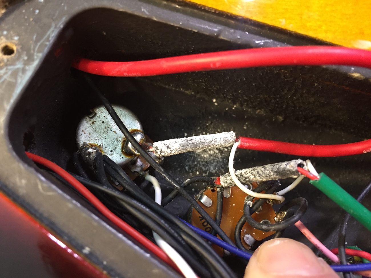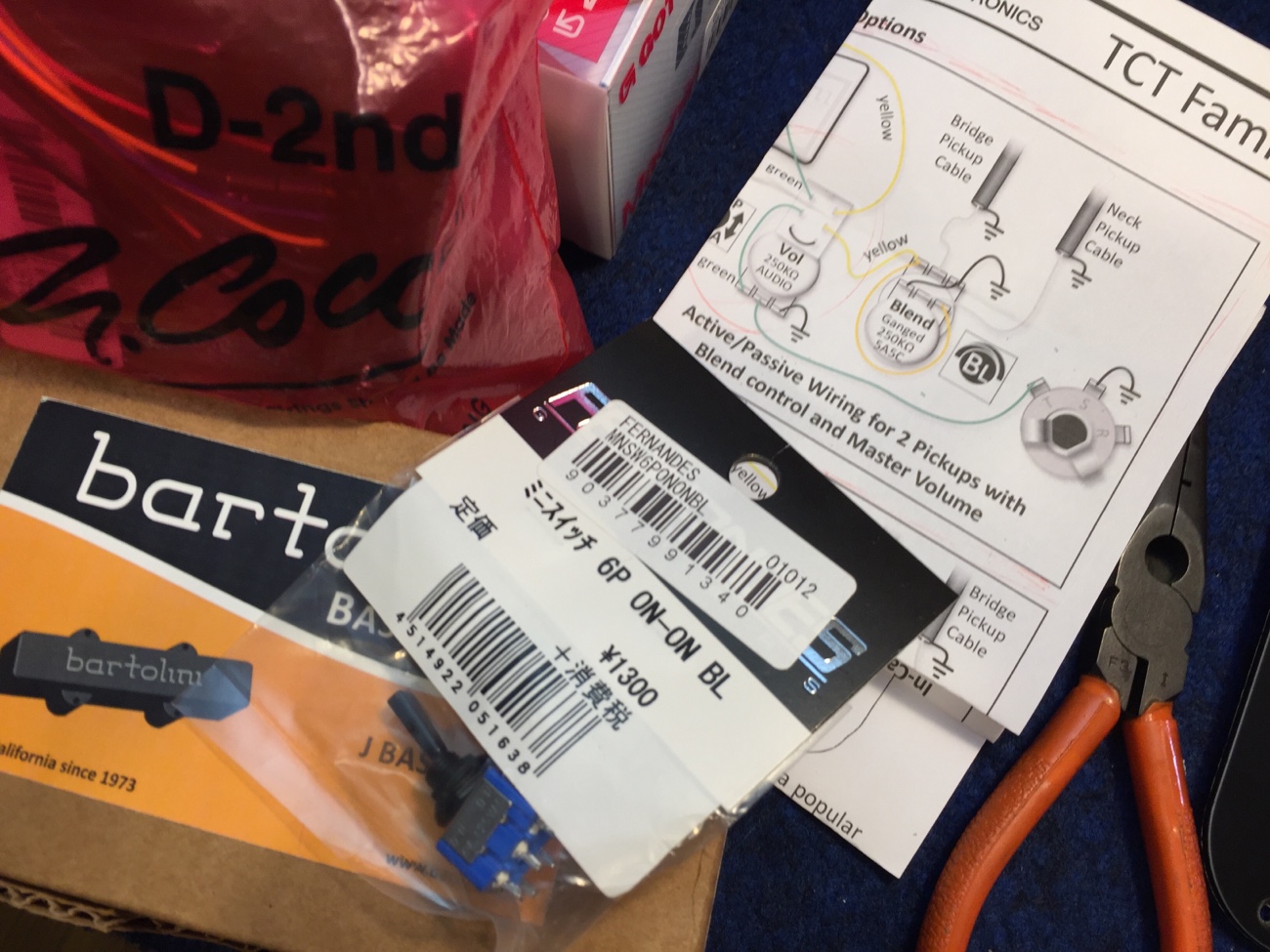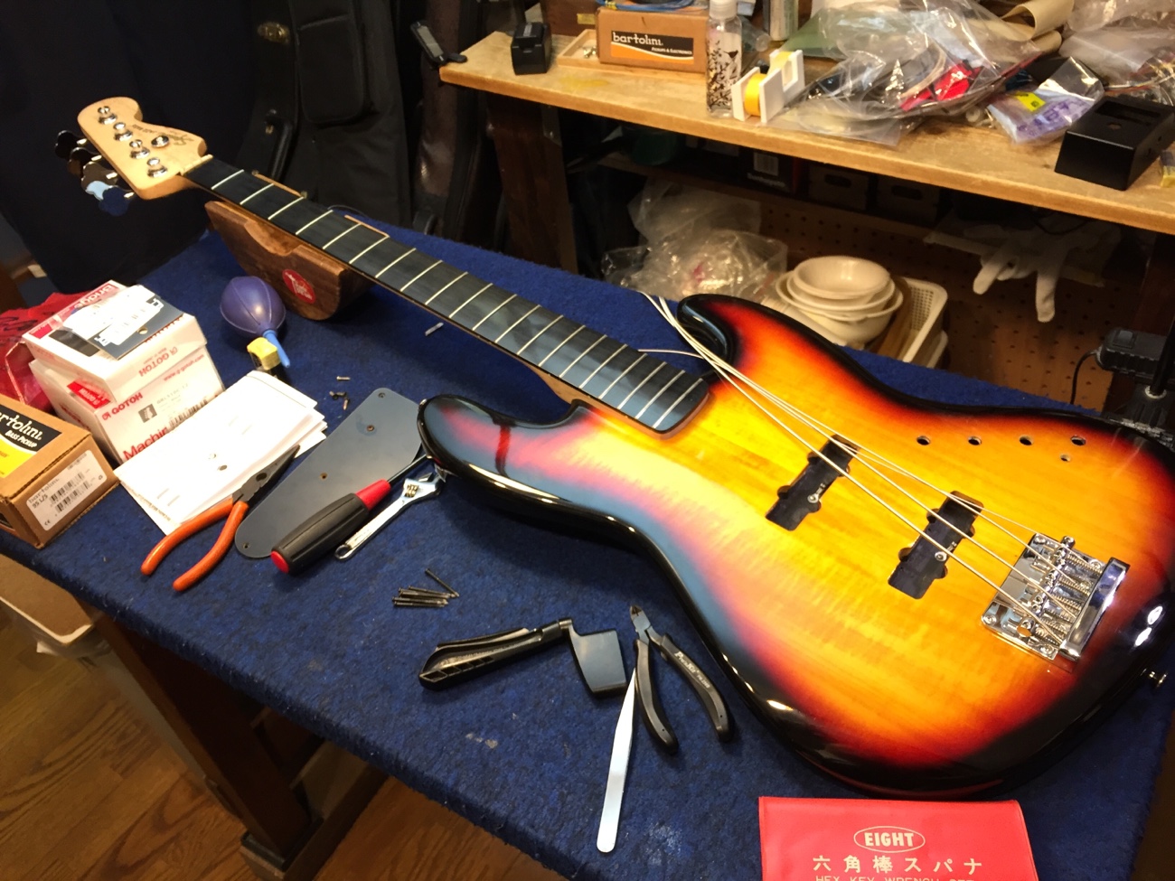 分解【Squier Deluxe Active Jazz Bassのパーツ一式交換-1】 投稿日時: 2026年3月6日 投稿者: admin スクワイヤのデラックス アクティブ ジャズベースです。 部品をほぼ全て交換します。 お預かりするついでに、今日のうちに持って帰ってもらえる部品を外してしまいました。 メタルパーツはブラックに交換します。 電装系は以前他のベースから取り外したバルトリーニに交換します。 低価格帯のベースなので、アクティブサーキットがかなりごちゃっとした感じに押し込まれています。 丸ごと交換しましょう。 イコライザー基板が裏蓋にネジ止めされていました。 ネジが錆びて取れないのでWD-40を染みこませて外しました。 Tweet