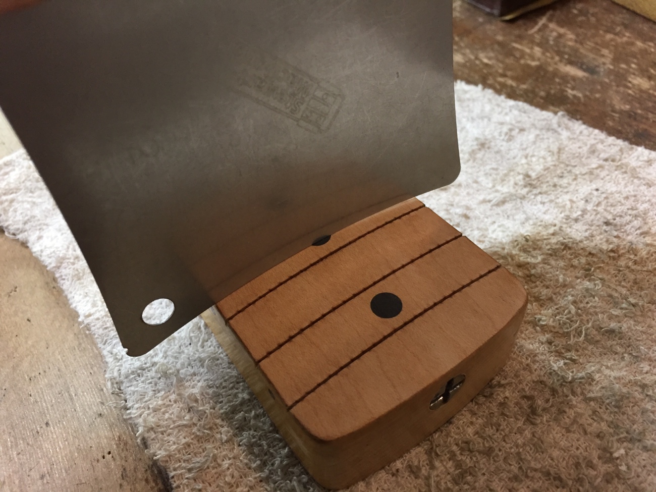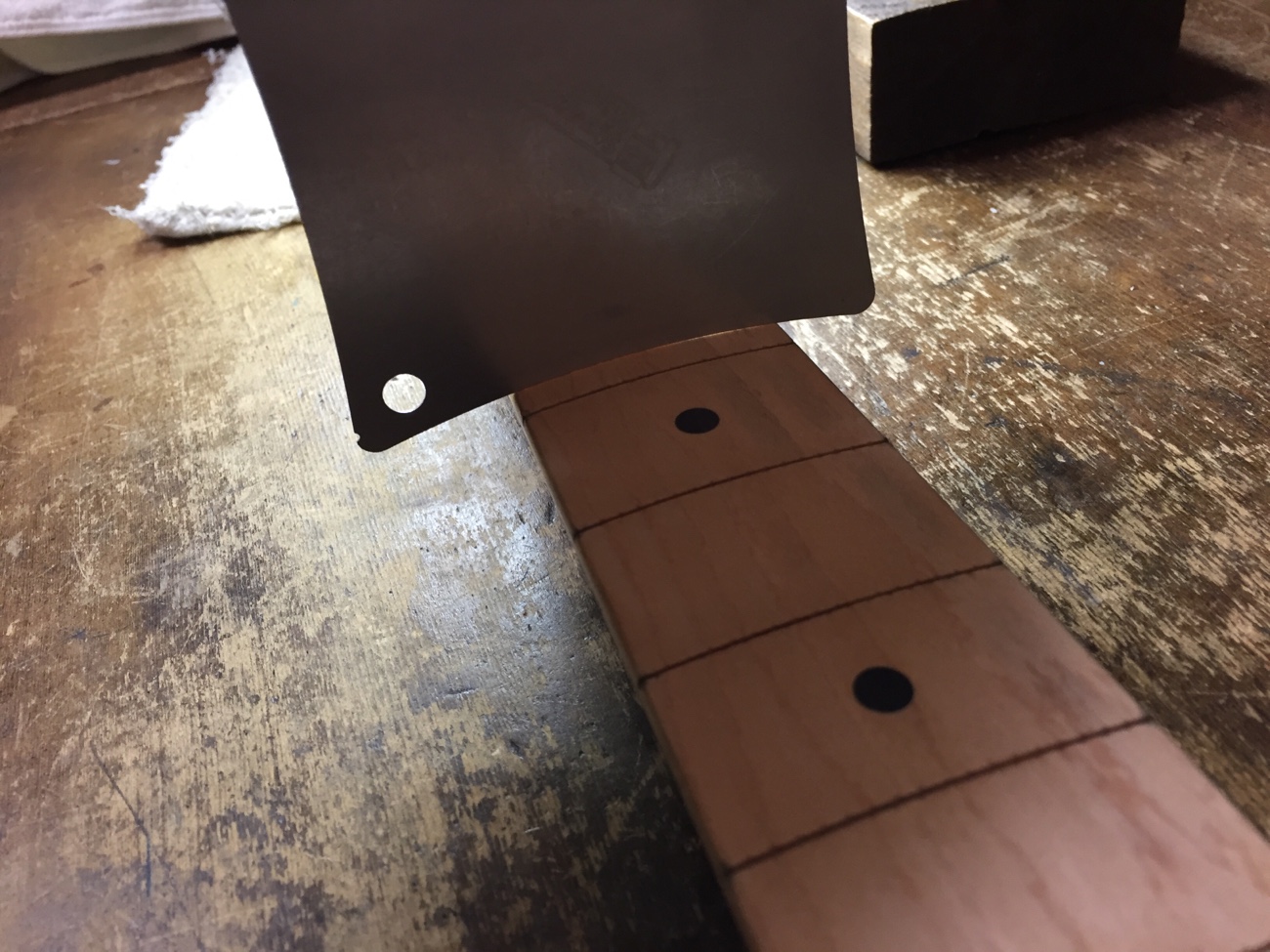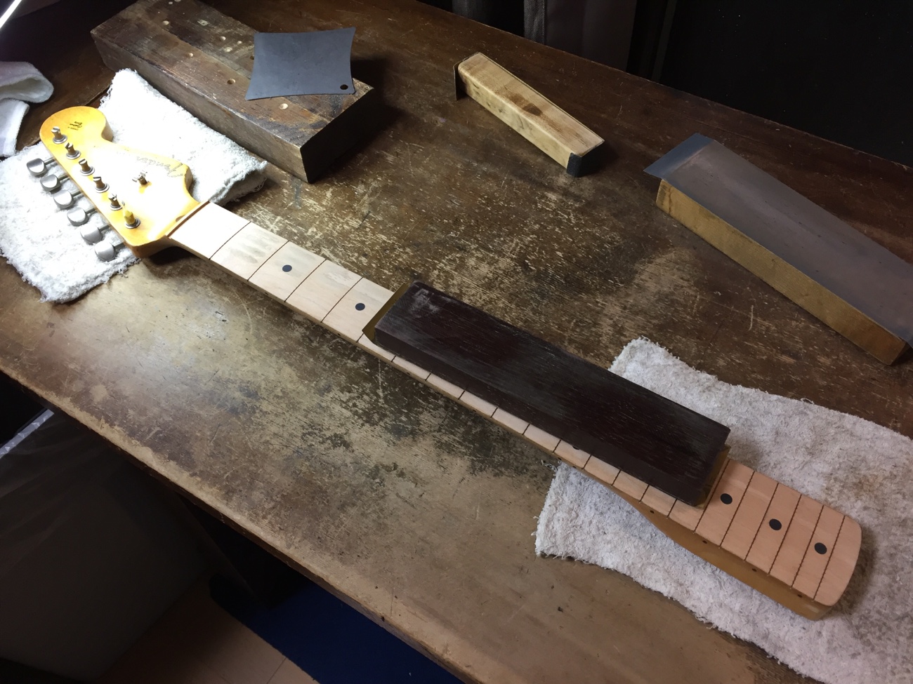 フレット溝を仕上げた【カスタムショップ製メイプル1Pストラトのフレット交換-5】 投稿日時: 2026年3月12日 投稿者: admin 指板のRはローフレットが7.25インチ。 ハイフレットの方がわずかにRがややきつめで、厳密に言うと逆Rになっているのですが、これを削って直すとさらに逆反りネックになっていきます。 もともと弦高を下げられないフェンダーネックですからここは妥協しましょう。 フレット溝がきついとフレットを打つことで逆反ることがありますので、打つフレットのタングに合わせて溝の幅に気を付けます。 指板の表面を整えました。 先に下地を吹いていきましょう。 Tweet