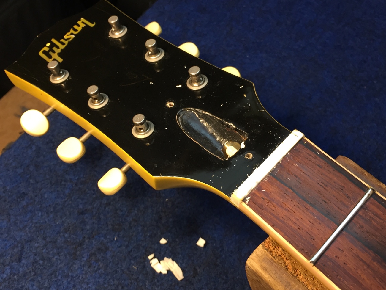 ナットが取れない【レスポールスペシャル(20260131お預かり)のブリッジ交換-9】 投稿日時: 2026年3月13日 投稿者: admin ナットが剥がれません。 スチームあてるほうがいいタイプの接着材かも知れません。 それでもダメならノコを入れて割って取りましょう。 Tweet