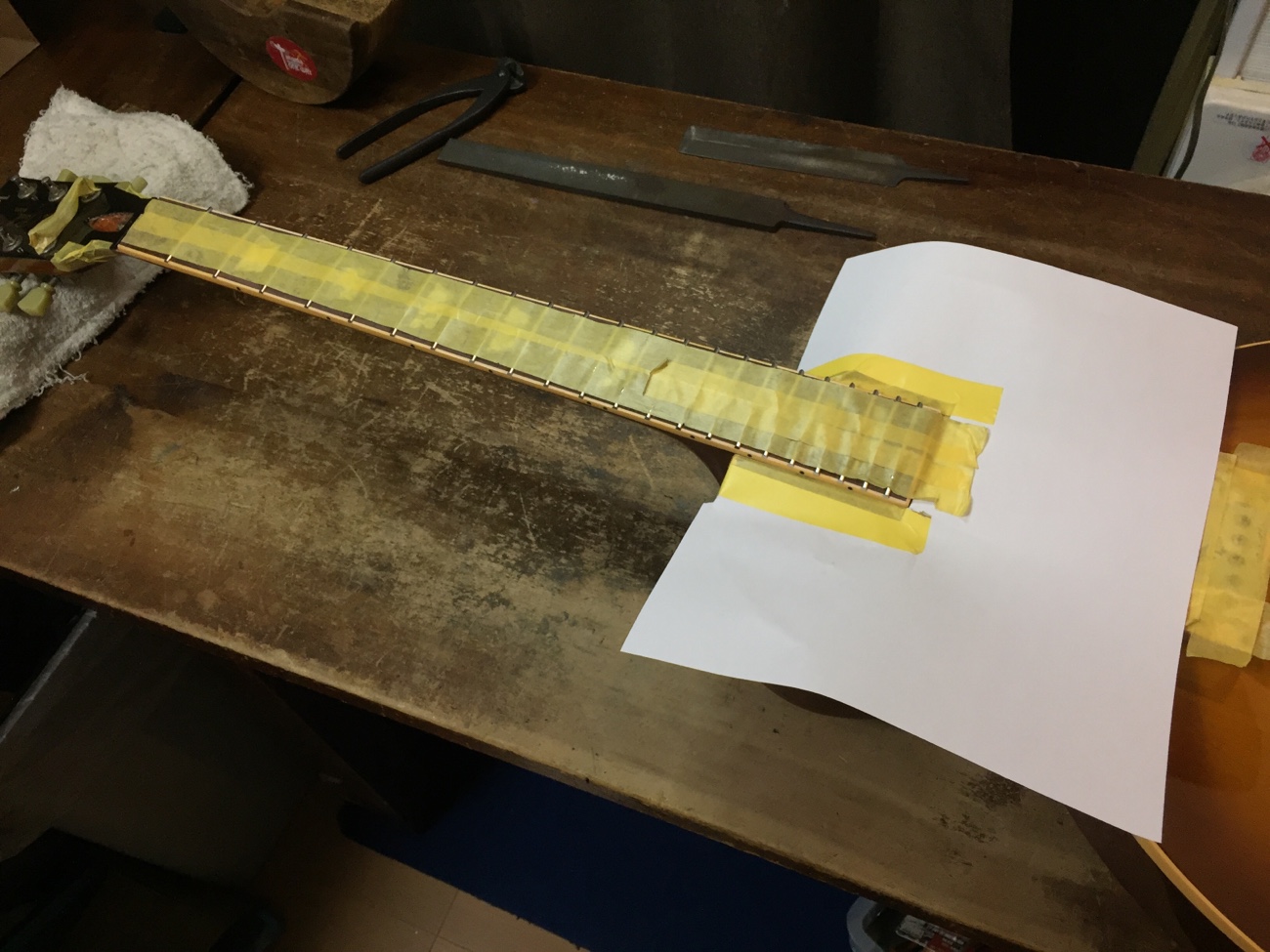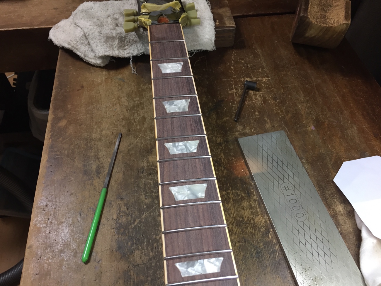 フレットサイドを整える【レスポールスペシャル(20260131お預かり)のブリッジ交換-10】 投稿日時: 2026年3月15日 投稿者: admin 左右にはみ出ている部分をカットして、削って指板サイドのラインに合わせます。 ステンレスフレットは硬いので大変です。 フレットの角を丸めておきます。 軽くすり合わせをしておきました。 フレットは上手く打てているようです。 ナットを取り付けて弦を張ってからもう少しフレットすり合わせの精度を確かめます。 Tweet