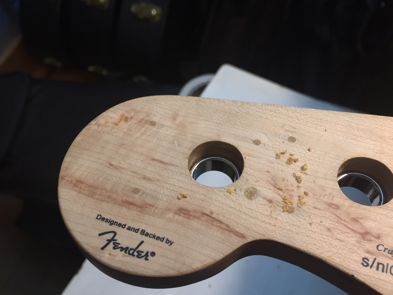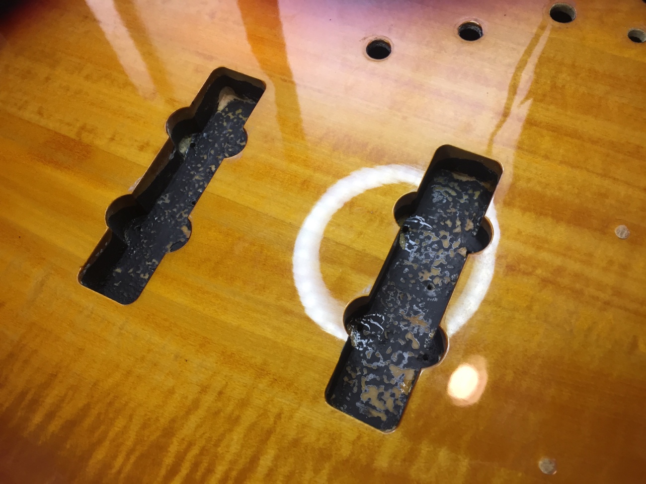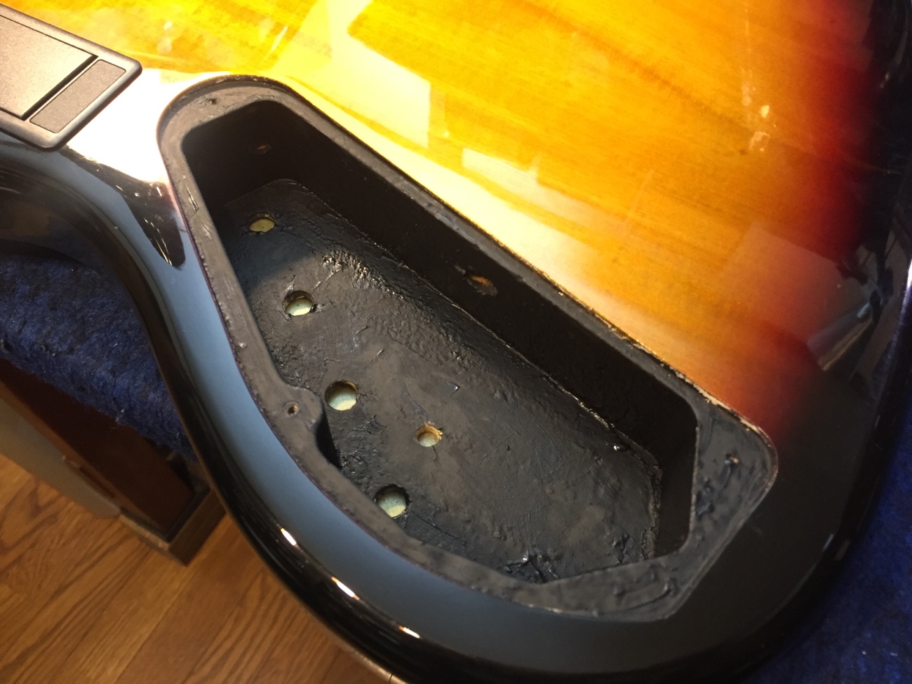 埋木を整えた【Squier Deluxe Active Jazz Bassのパーツ一式交換-5】 投稿日時: 2026年3月18日 投稿者: admin 折れたネジを抜いたところの埋木を整えます。 ペグ穴の径は新しいペグに対応しているようです。 キャビティの底を整えて・・・ 導電塗料を塗り足しました。 Tweet