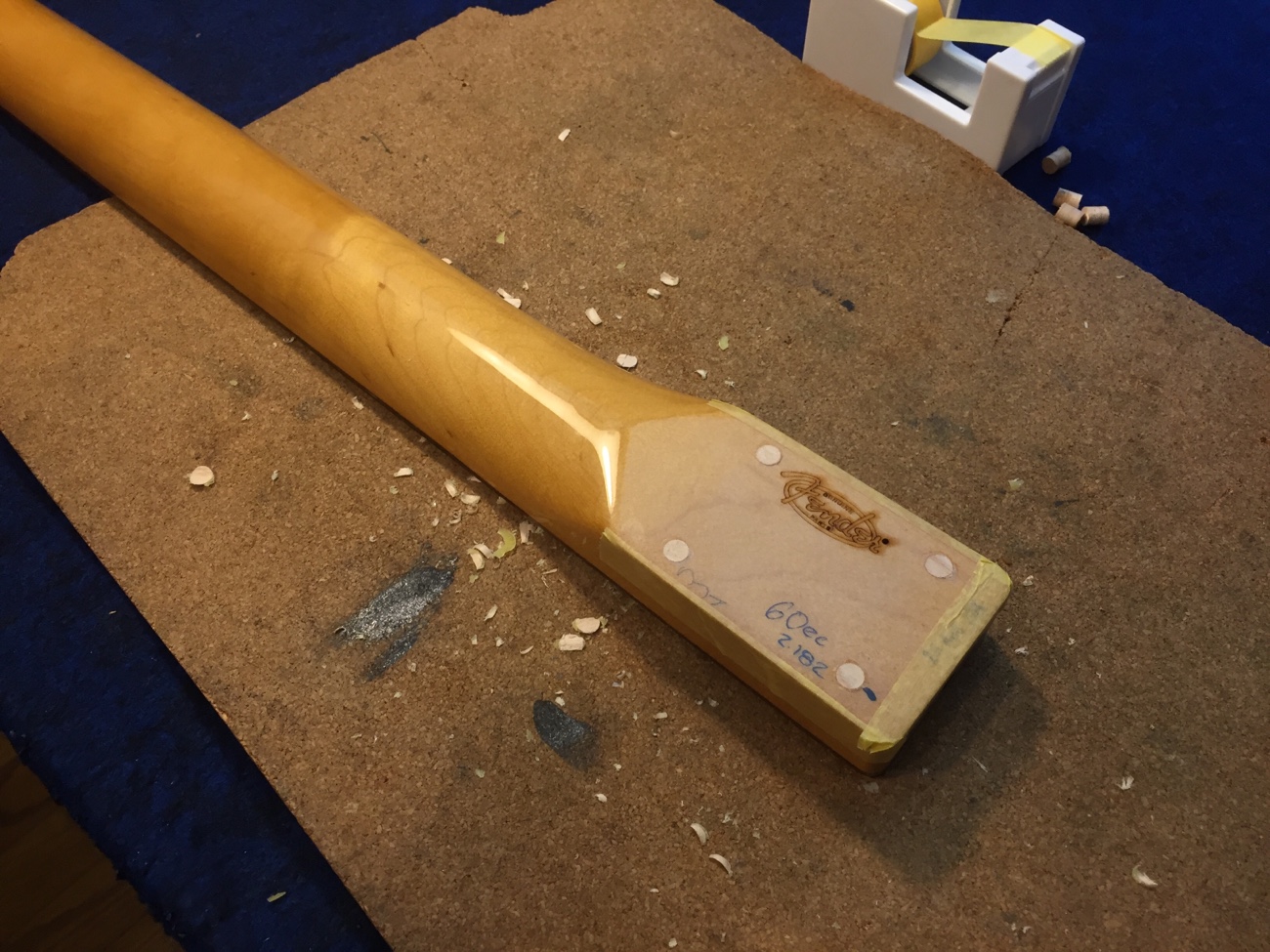 ネックポケットに薄板を貼る【フェンダーテレのボディとネックを組み上げる-5】 投稿日時: 2026年3月18日 投稿者: admin メイプルの木栓で埋めたところを整えました。 ネックポケットのヘッド側に隙間があります。 薄板を貼っておきましょう。 Tweet
