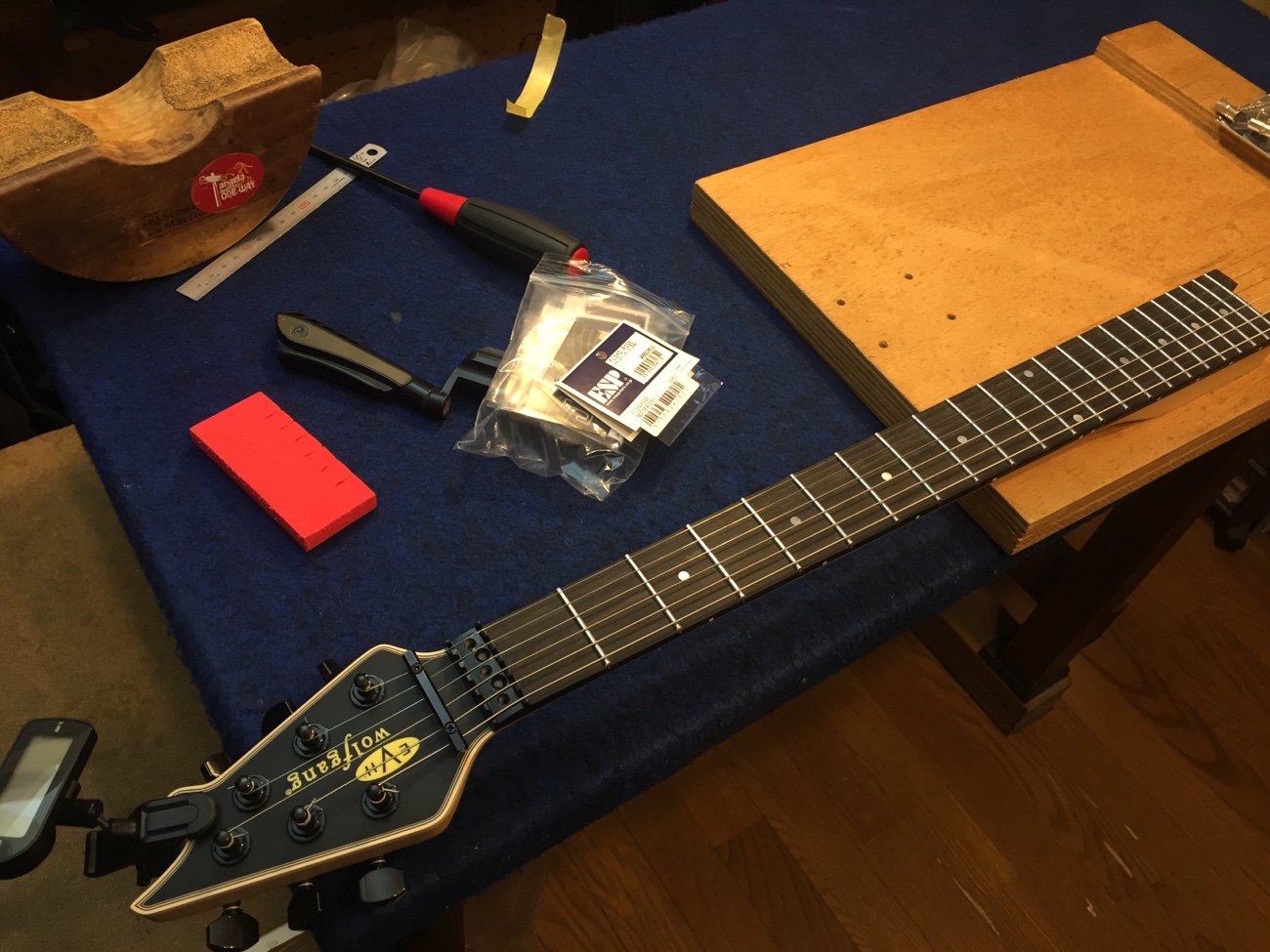 弦を張っておく【EVHのフレット交換-10】 投稿日時: 2026年3月23日 投稿者: admin ダミーボディを使って弦の張力をかけています。 もうしばらく様子をみて問題なさそうならすり合わせをして完成させましょう。 Tweet