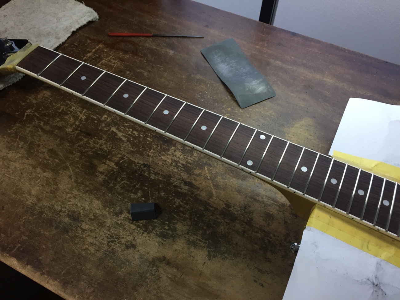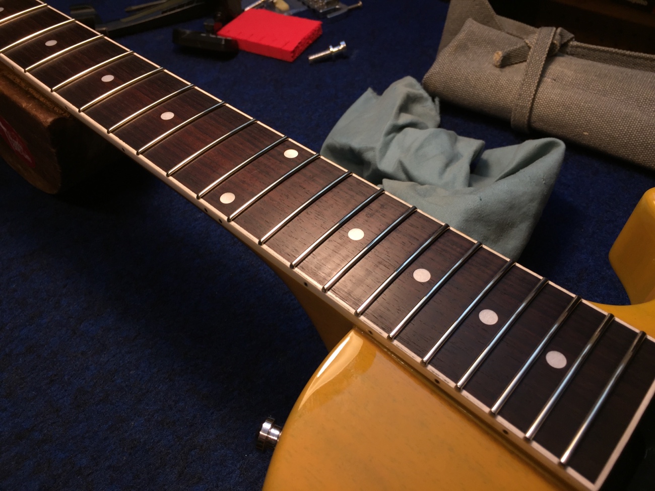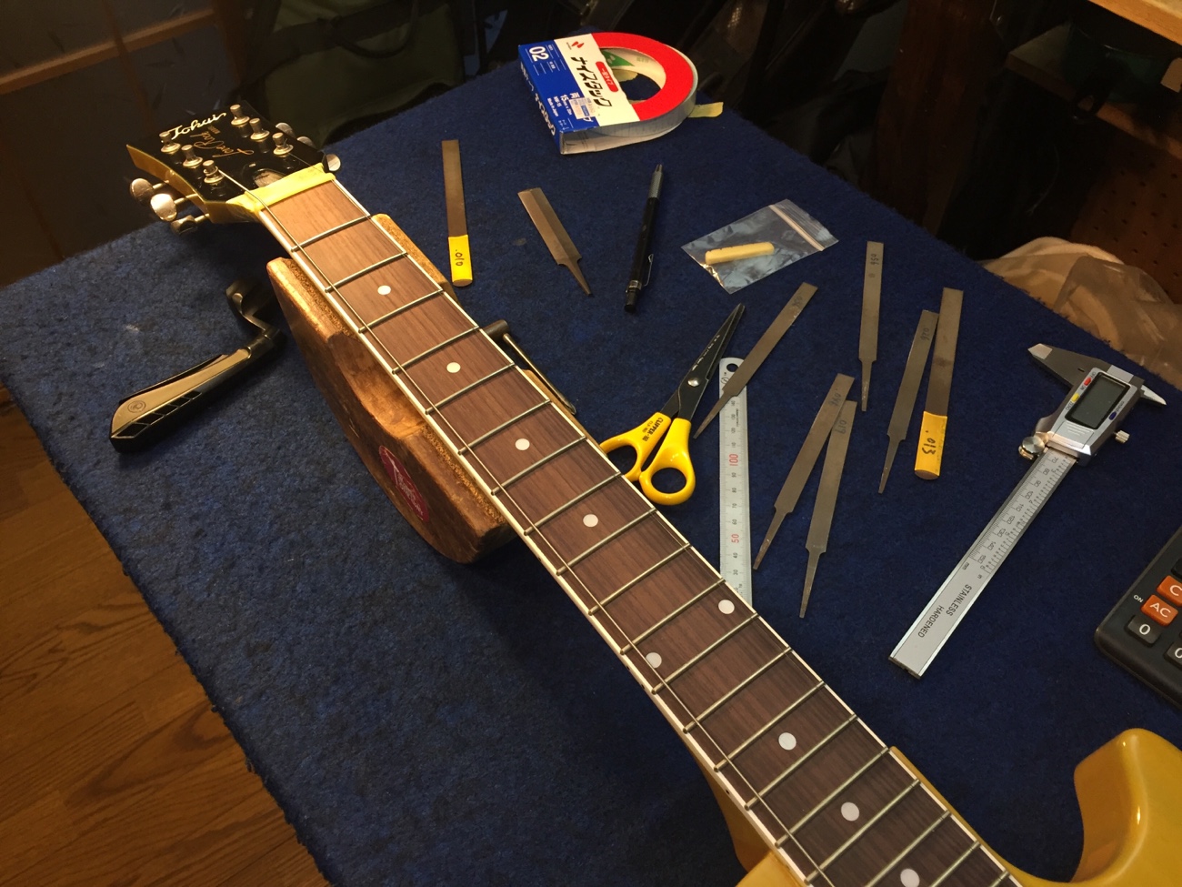 ナットに弦溝を作る【Tokai LSS158 SEB(20250824お預かり)のチューンナップ-22】 投稿日時: 2026年3月23日 投稿者: admin ナットに弦溝を作っていきます。 もう一度、弦を張ってフレットの頂点を確かめました。 問題なさそうです。 フレットを仕上げていきましょう。 ピカピカに磨きました。 配線を始めます。 ポット間やスイッチ周りの線を交換しました。 お預かりしたコンデンサを計測していきます。 どれも問題なさそうなので取り付けていきましょう。 こんな感じになりました。 ブリッジ交換していきます。 Tweet
