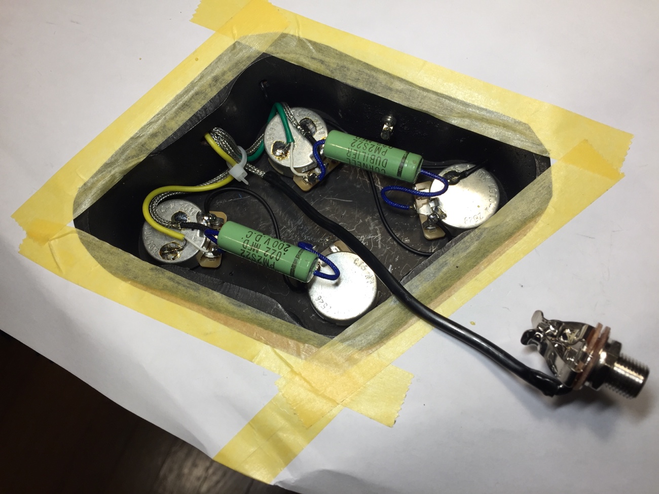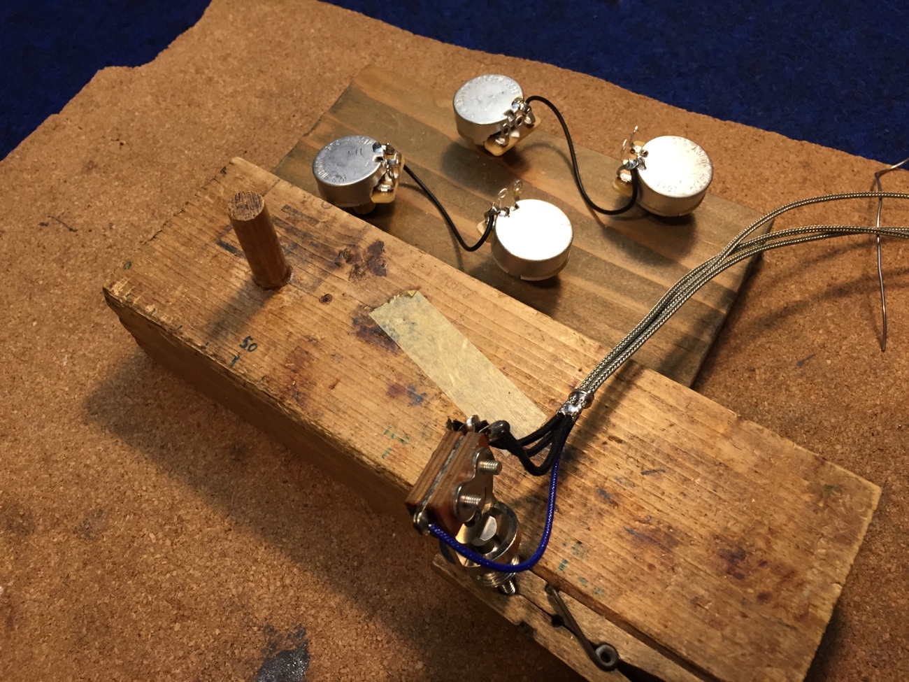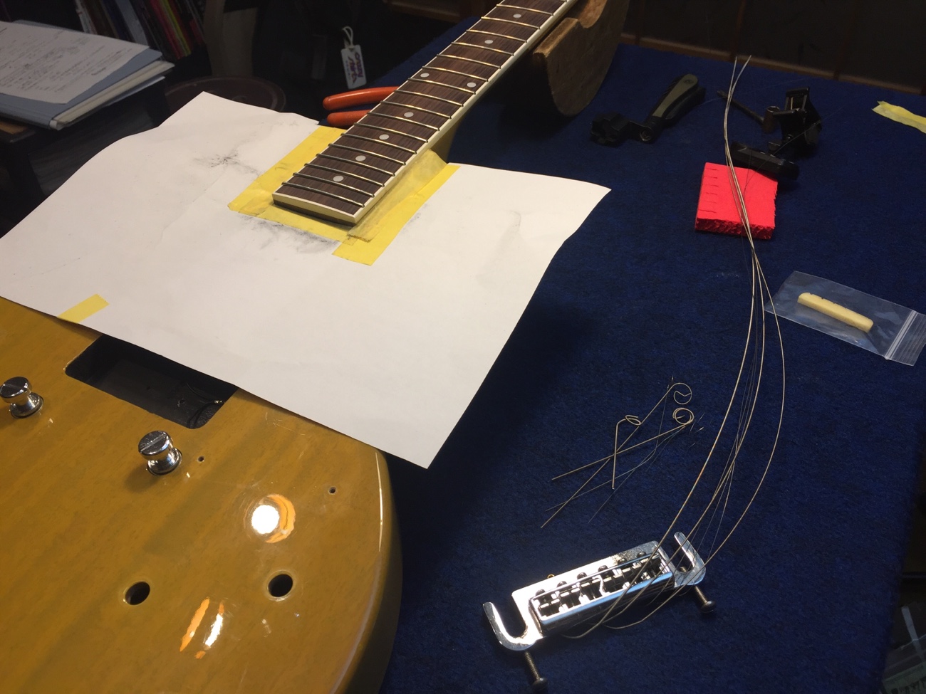 ナットに弦溝を作る【Tokai LSS158 SEB(20250824お預かり)のチューンナップ-22】 投稿日時: 2026年3月23日 投稿者: admin ナットに弦溝を作っていきます。 もう一度、弦を張ってフレットの頂点を確かめました。 問題なさそうです。 フレットを仕上げていきましょう。 ピカピカに磨きました。 配線を始めます。 ポット間やスイッチ周りの線を交換しました。 お預かりしたコンデンサを計測していきます。 どれも問題なさそうなので取り付けていきましょう。 こんな感じになりました。 ブリッジ交換していきます。 Tweet