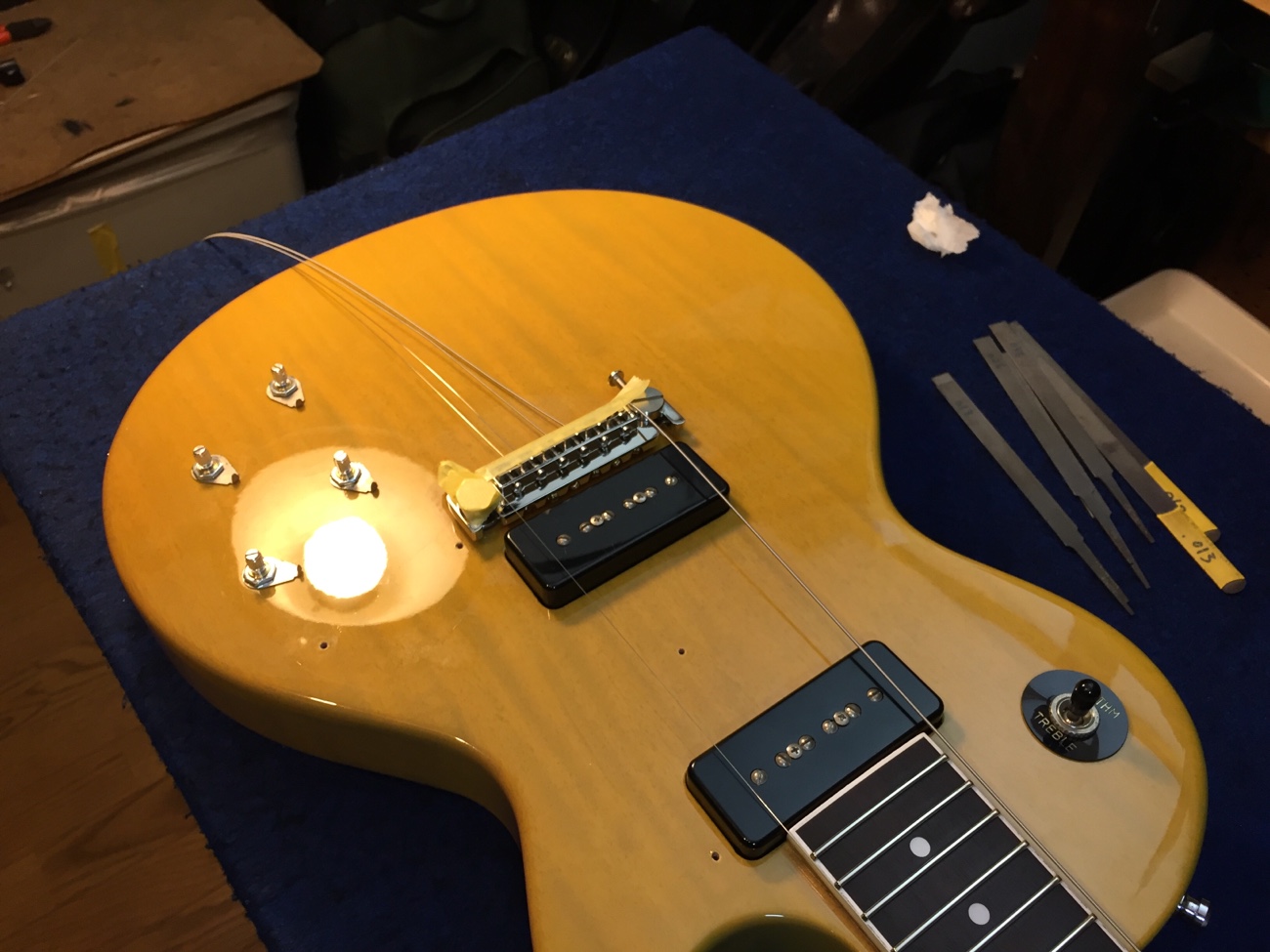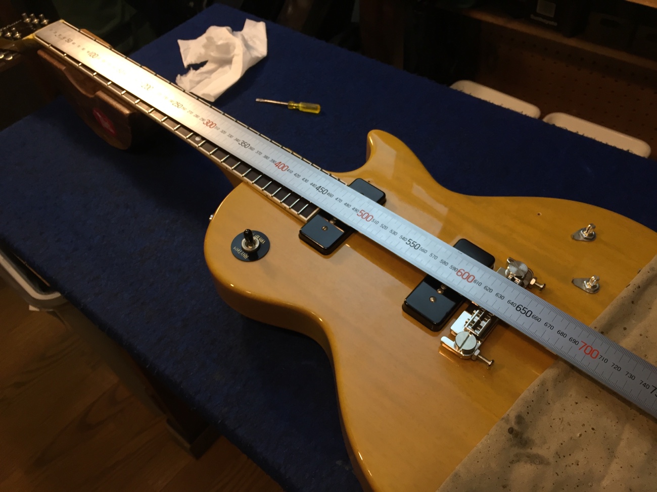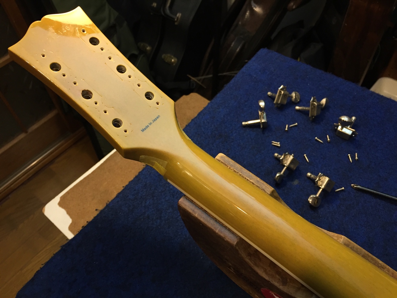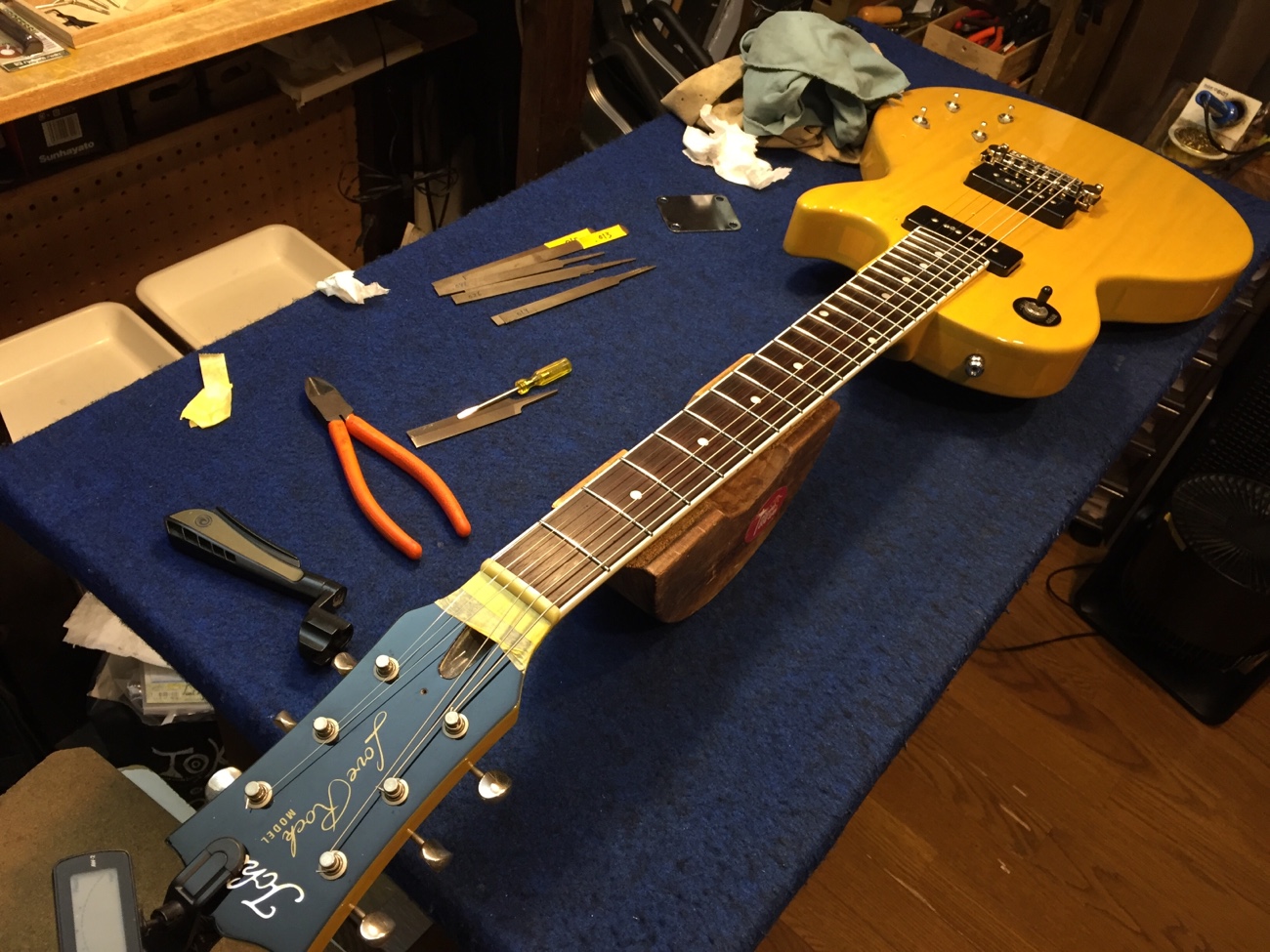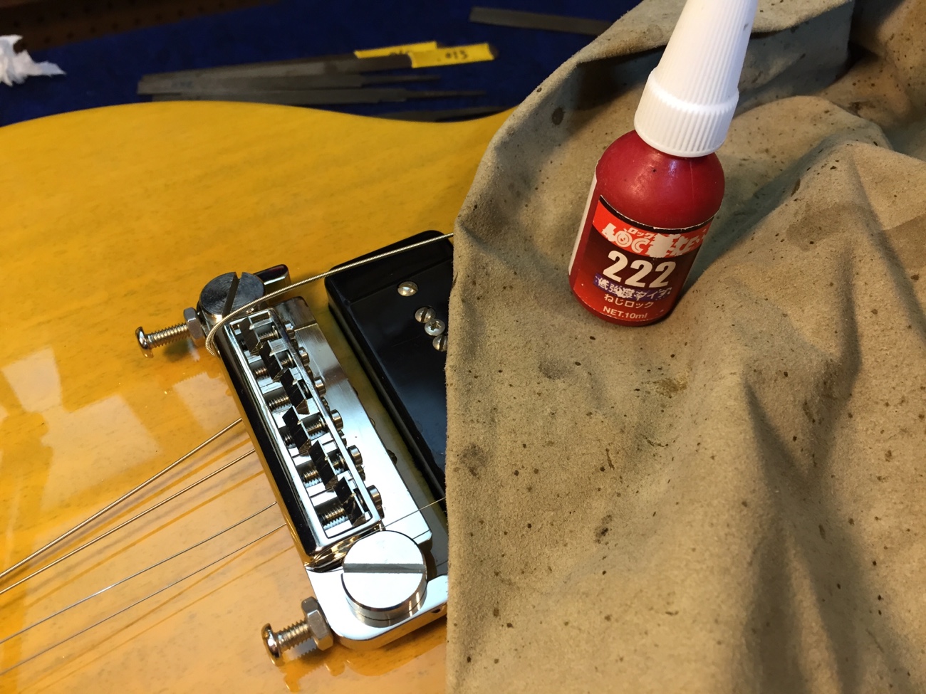 ブリッジ交換【Tokai LSS158 SEB(20250824お預かり)のチューンナップ-23】 投稿日時: 2026年3月25日 投稿者: admin ペグのメンテナンスをしておきます。 ブッシュが浮いてきていたので固定し直しました。 ブッシュ内とポストを磨いて、薄くグリスを塗っておきました。 ブリッジを取り付けていきます。 位置決めをします。 弦溝を作っていきましょう。 細かい部品が共鳴しないように低粘度~中粘度のネジロックで仮固定します。 弦が張れました。 落ち着いたら弦溝の深さを追い込んで、全体調整すれば完成です。 Tweet