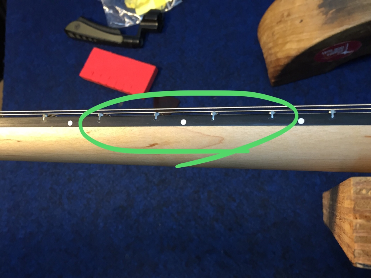 フレットのすり合わせをします。 弦を張って、演奏時と同じように抱えた状態でフレットの頂点をそろえていきます。