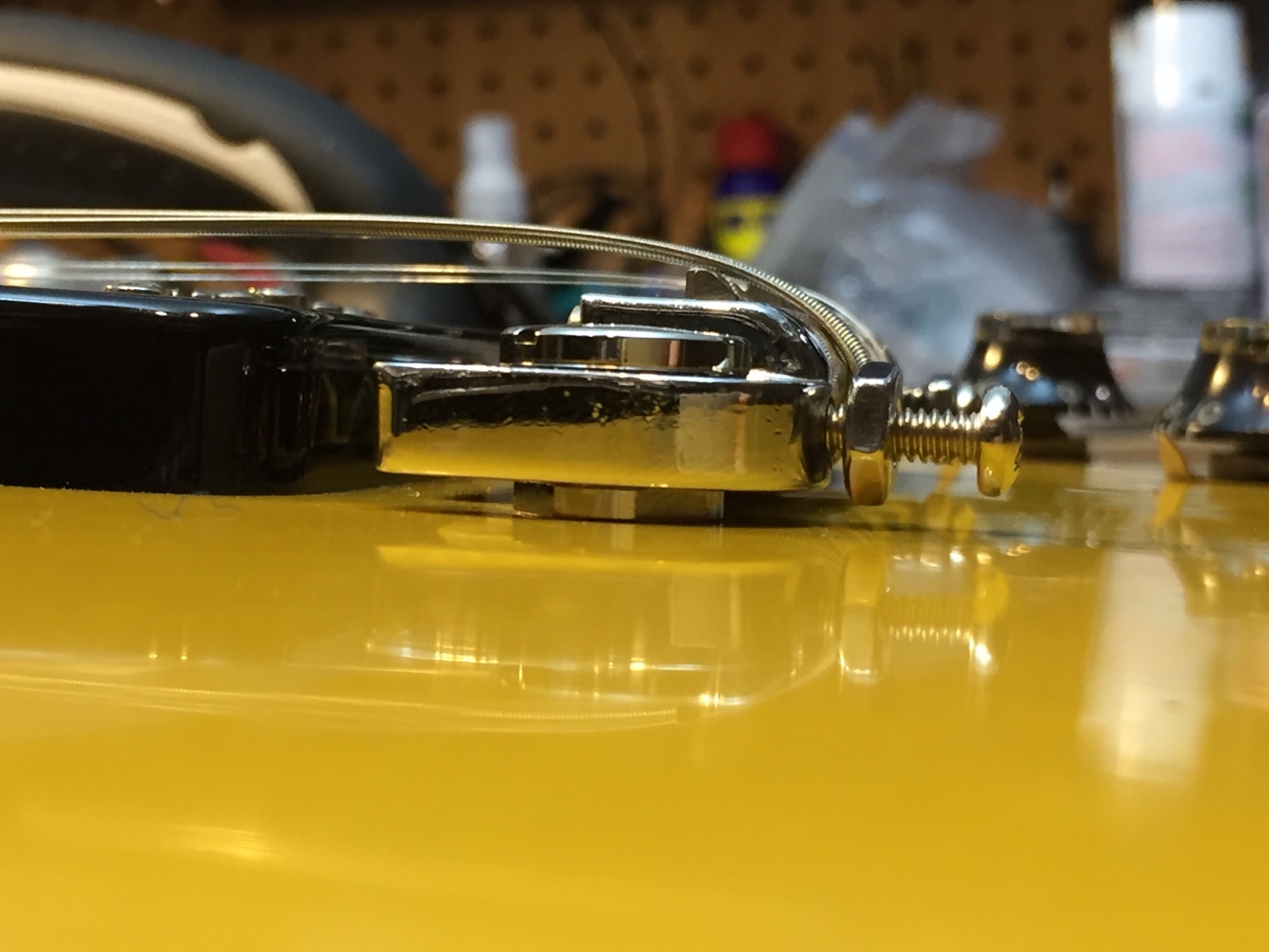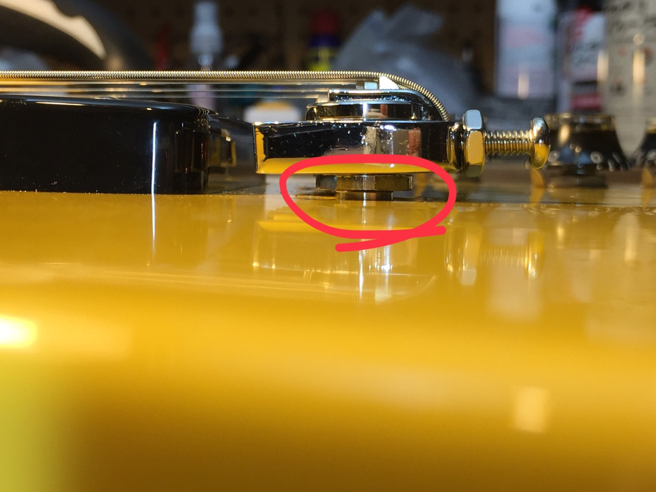 弦を張ってみたのですが、弦高が2mmから下がりません。 スタッドが完全にボディに入りきらないのが気になりますね。