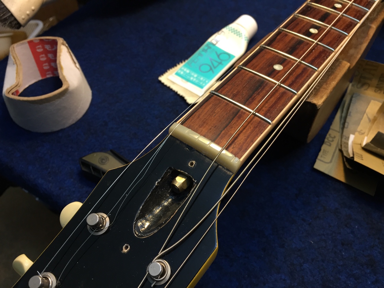 よく使われるネジですが、ピックアップのつり下げとか、レバースイッチの取りつけなので、そういえばナット側はギターで必要になることがほぼないですね。