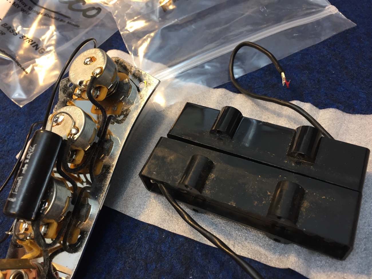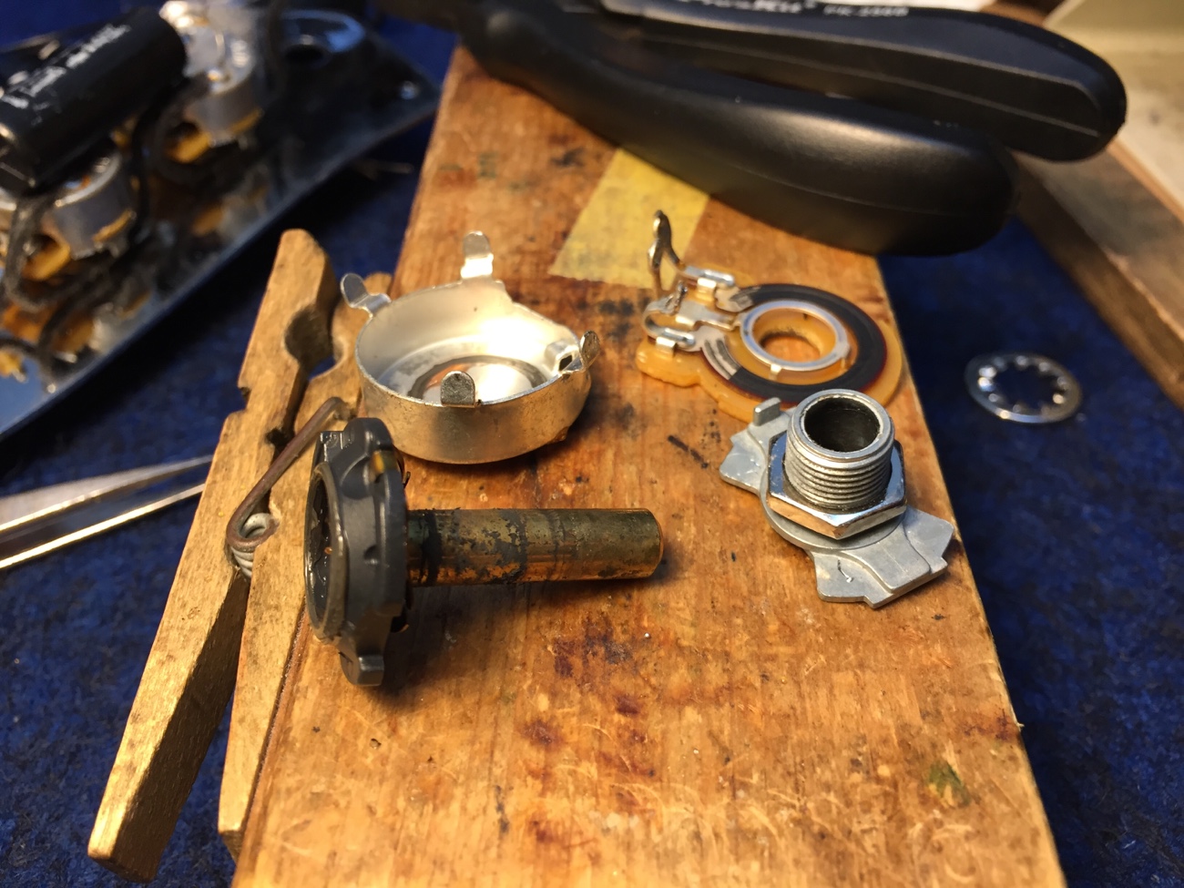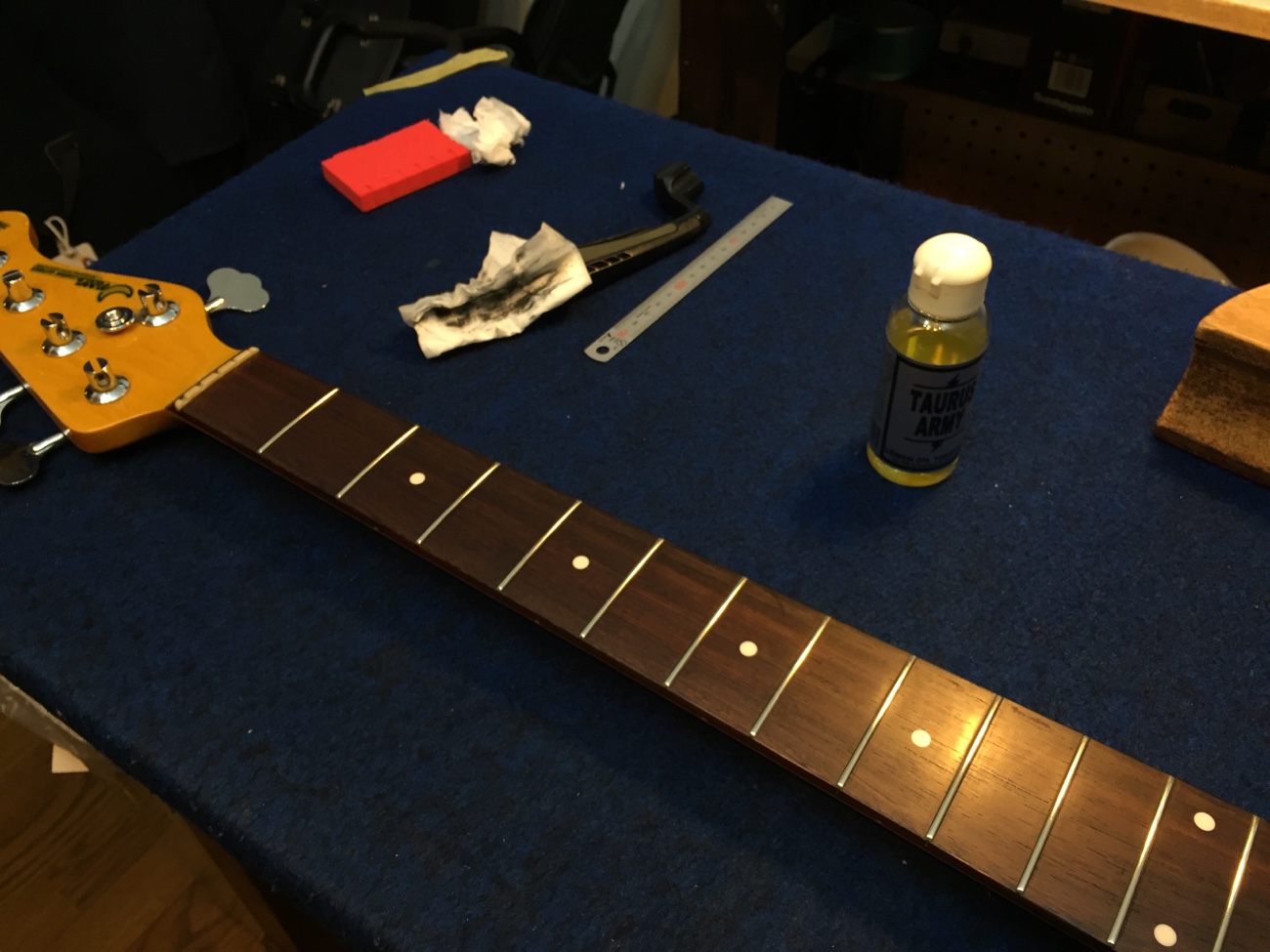 フレットクリーニングをした【Moon5弦にXTCTを増設する-22】 投稿日時: 2026年4月5日 投稿者: admin フレットをクリーニングしておきました。 ピックアップが汚れているので掃除します。 ボリュームが硬くなってきたということなのですが、ピックアップと同様に、汗による汚れがシャフトのグリスを固着させてしまっているような気がします。 分解清掃しました。 ピックアップを戻していきます。 Tweet