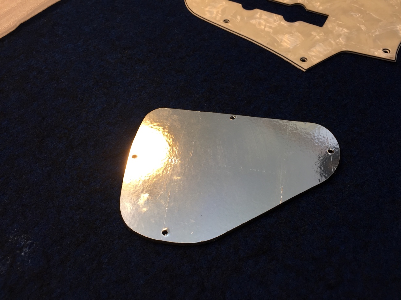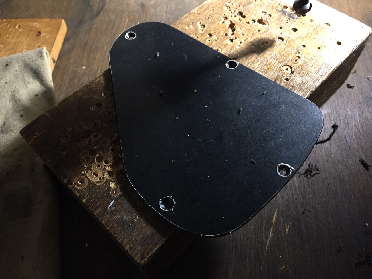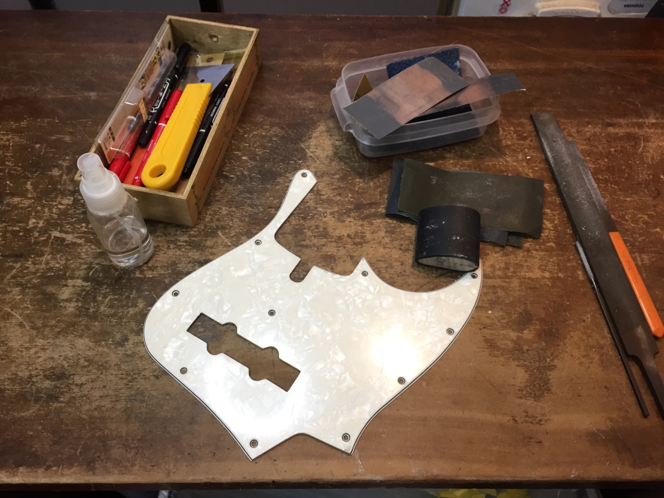 トリマー加工上がりのピックガードのエッジをサンドペーパーで仕上げました。